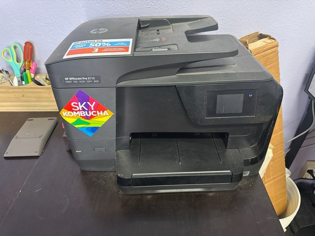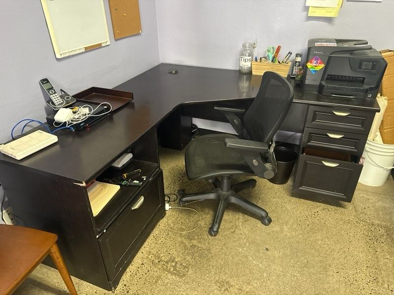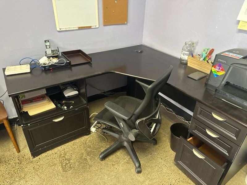 L-Shaped Desk, Office Chair & HP Office Jet Pro 8710 Printer.