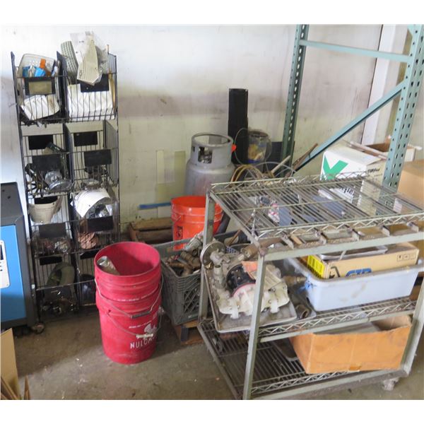 Qty 2 Shelving Units & Contents: Hardware, Hose, Parts, etc