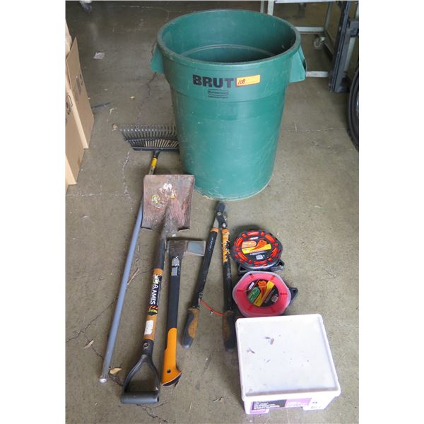 Rubbermaid Brut Waste Can w/ Landscape Tools: Shovel, Rake, Axe, etc