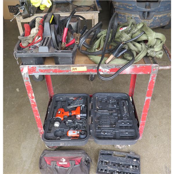 Rolling Metal Cart w/ Undershelf & Contents: Tools, Jumper Cables, Strapping, etc