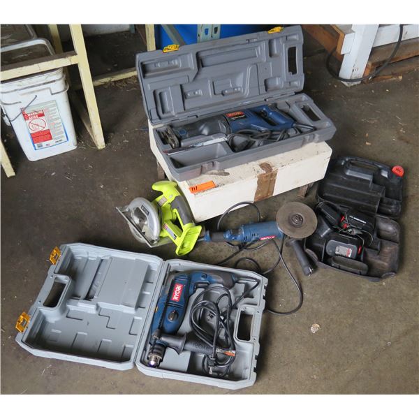 Multiple Power Tools: Ryobi Circular Saw, Reciprocating Saw, Grinder, Black & Decker Batteries, etc