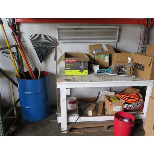 Work Table w/ Undershelf & Contents, Barrel of Landscape Tools: Rake, Pruner, Parts, etc