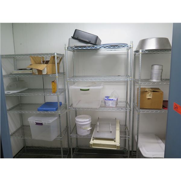Qty 3 Metal Mesh 4-Tier Shelving Units & Content: Bins, Pitchers, etc