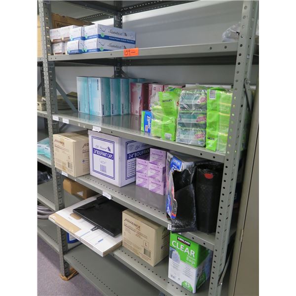 Metal 5-Tier Warehouse Shelving Unit & Contents: Gloves, Sponges, Bags, etc