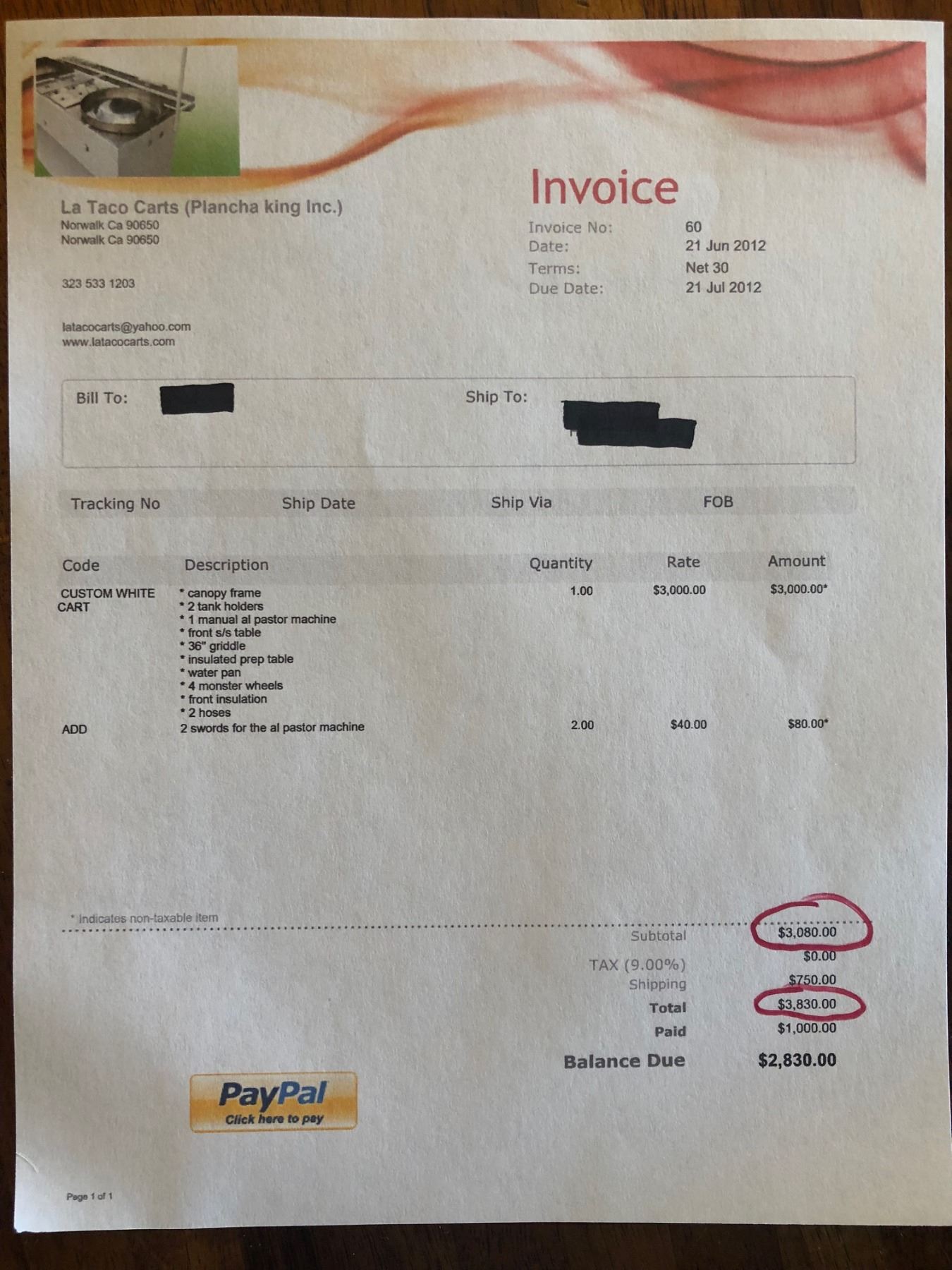 La Taco Cart - Has 36" Griddle & Prep Table uses Propane - Paid $3830