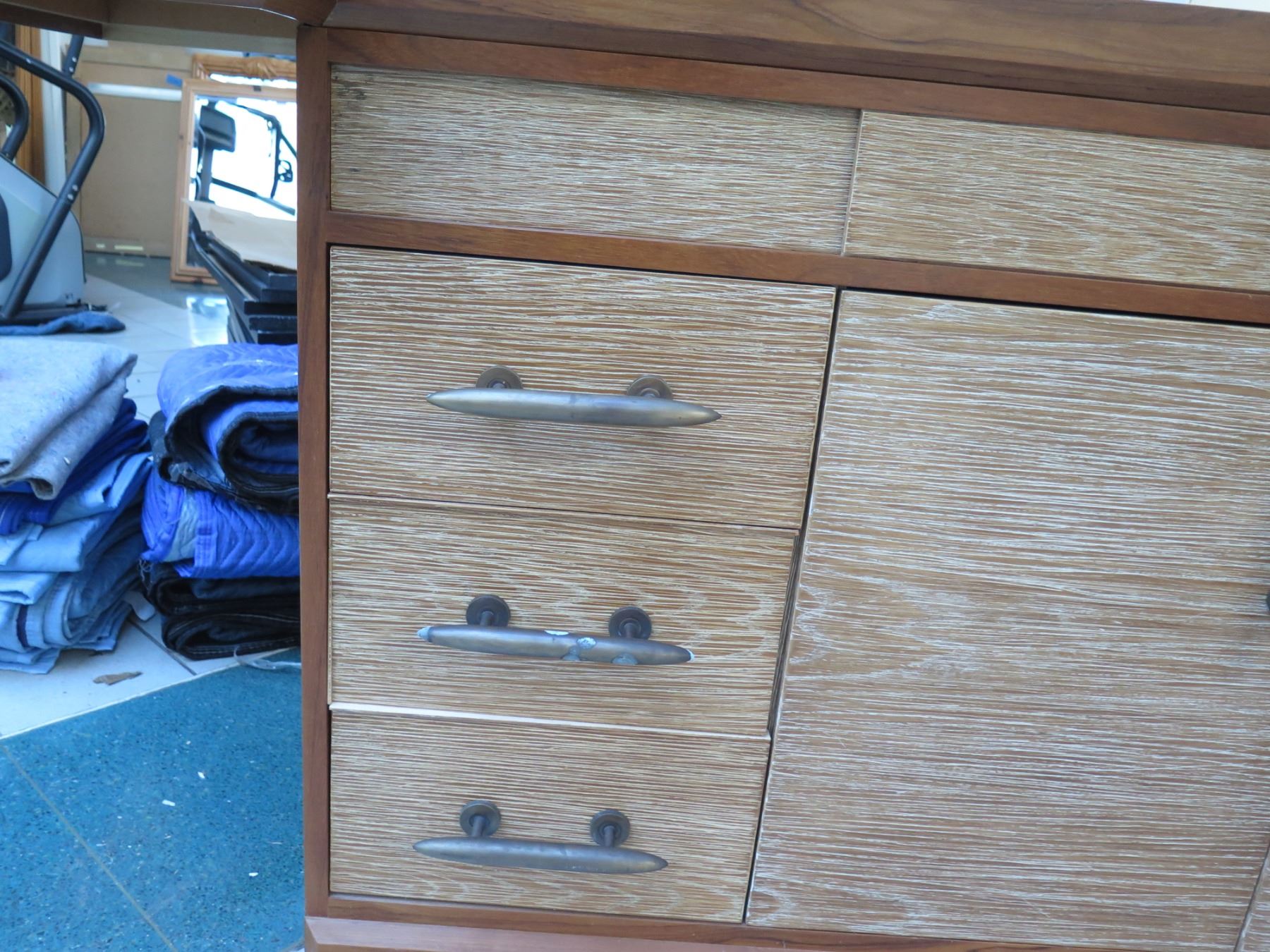 Large 2-Piece Solid Wood Entertainment Center w/ Cabinet & 6 Drawers, 120"x30"x43"H. The area above the cabinet door handles are sliding doors that open to interior shelving for smaller items. The top piece is a cap piece and lifts off. It can be cut to size or replaced with another piece of wood or stone-type piece. This was designed with two decorative end units that were for decorative purposes only (no doors). See lot 17 and 165 to see what those end units looked like.
