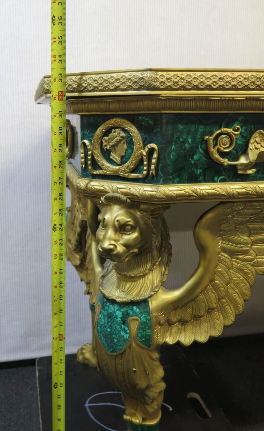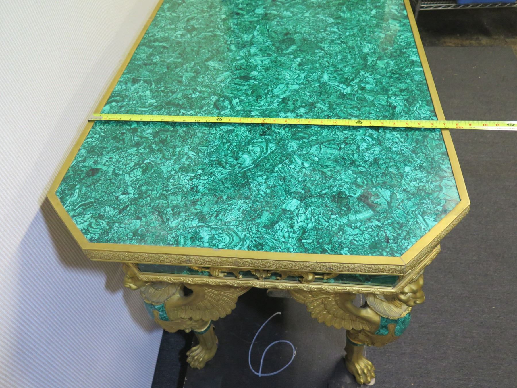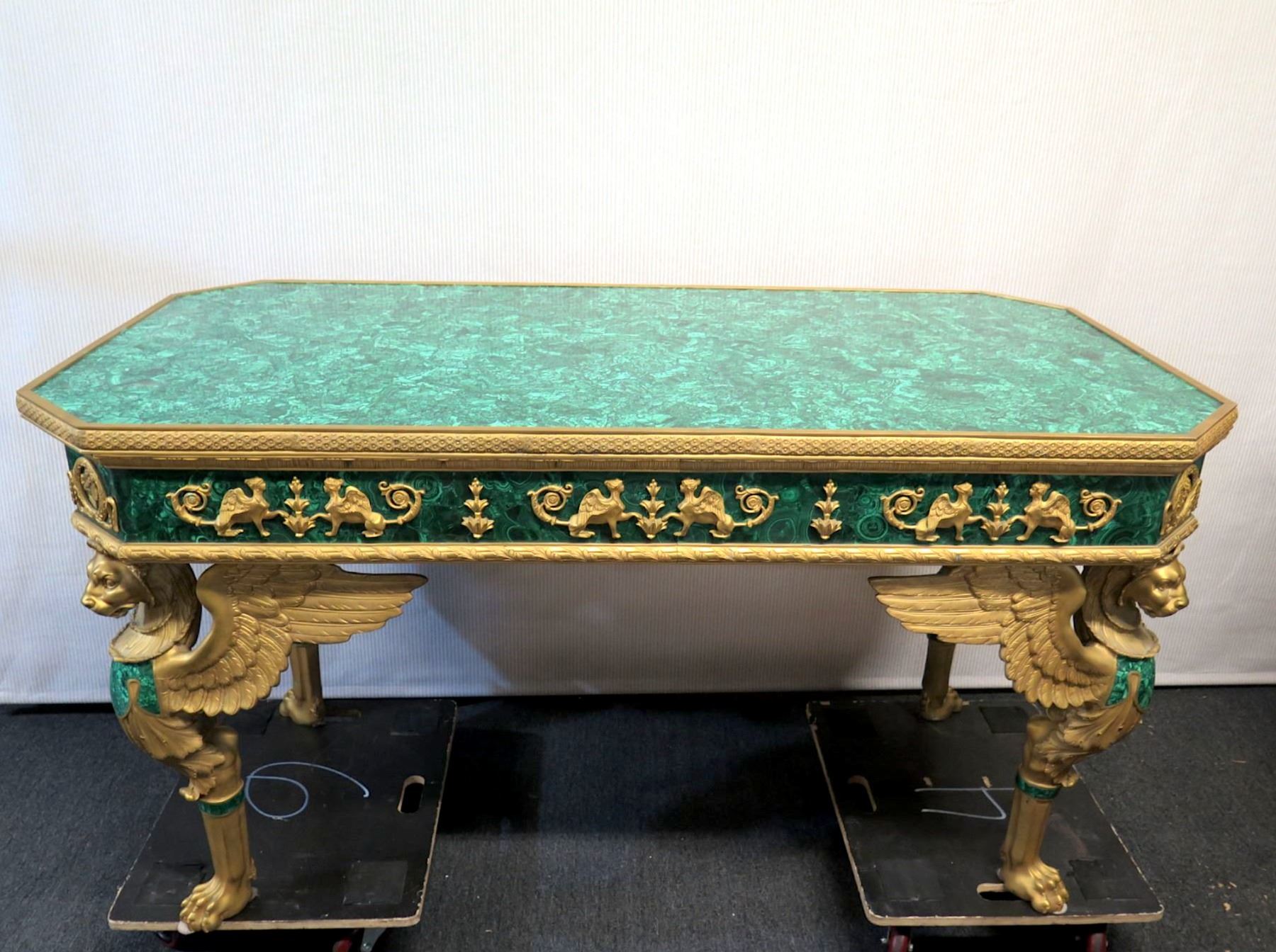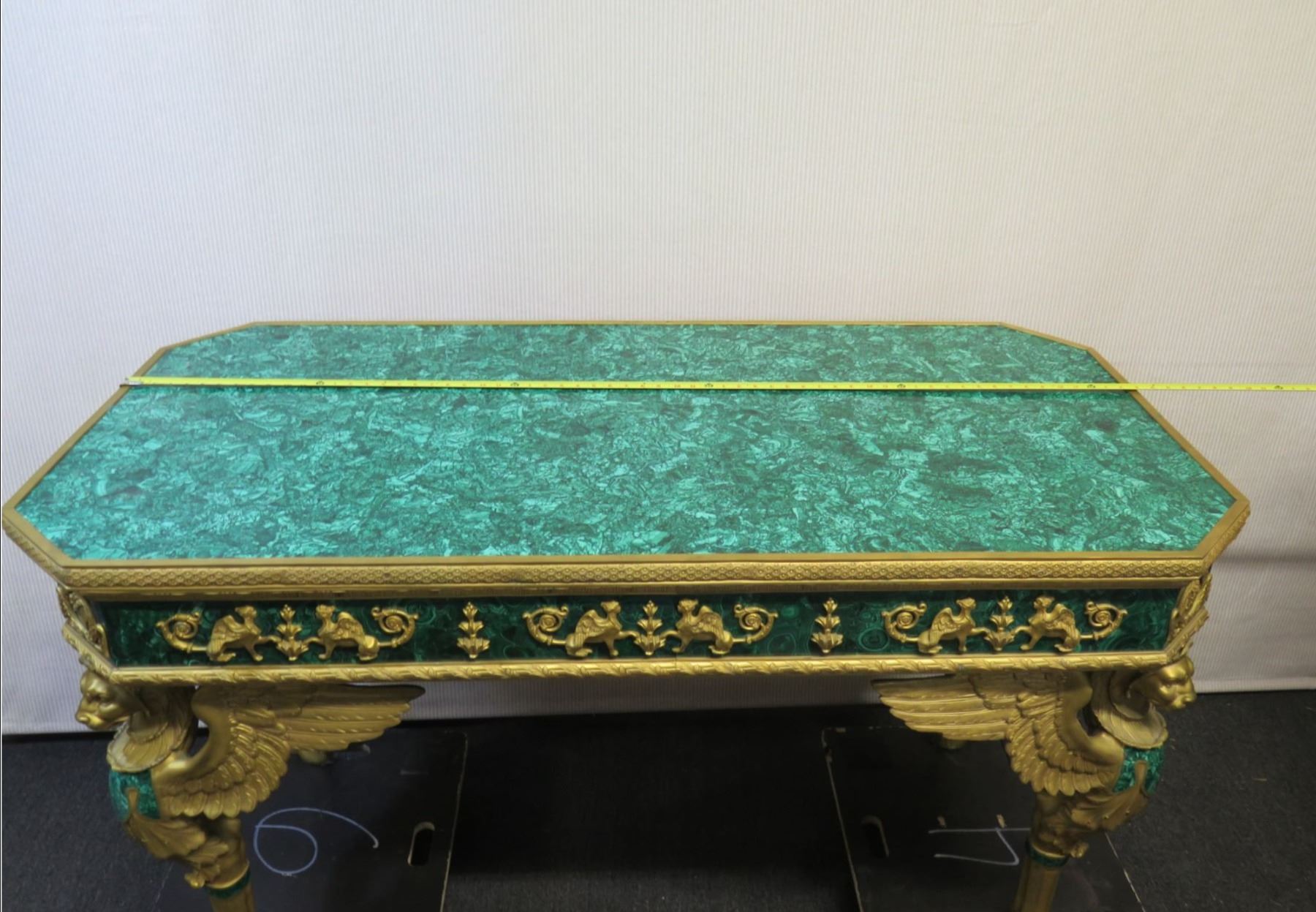 https://bid.oahuauctions.com/French-Empire-Style-Faux-Malachite-Overlay-Table-w-Gilt-Edging-and-Lion-Clawfoot-Details-63x31x32_i26854206