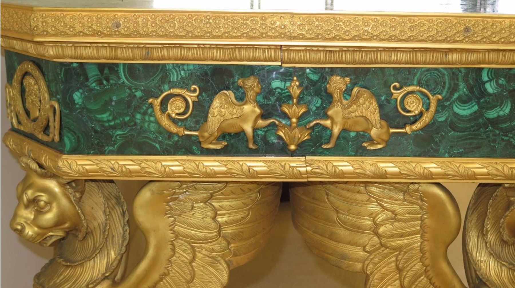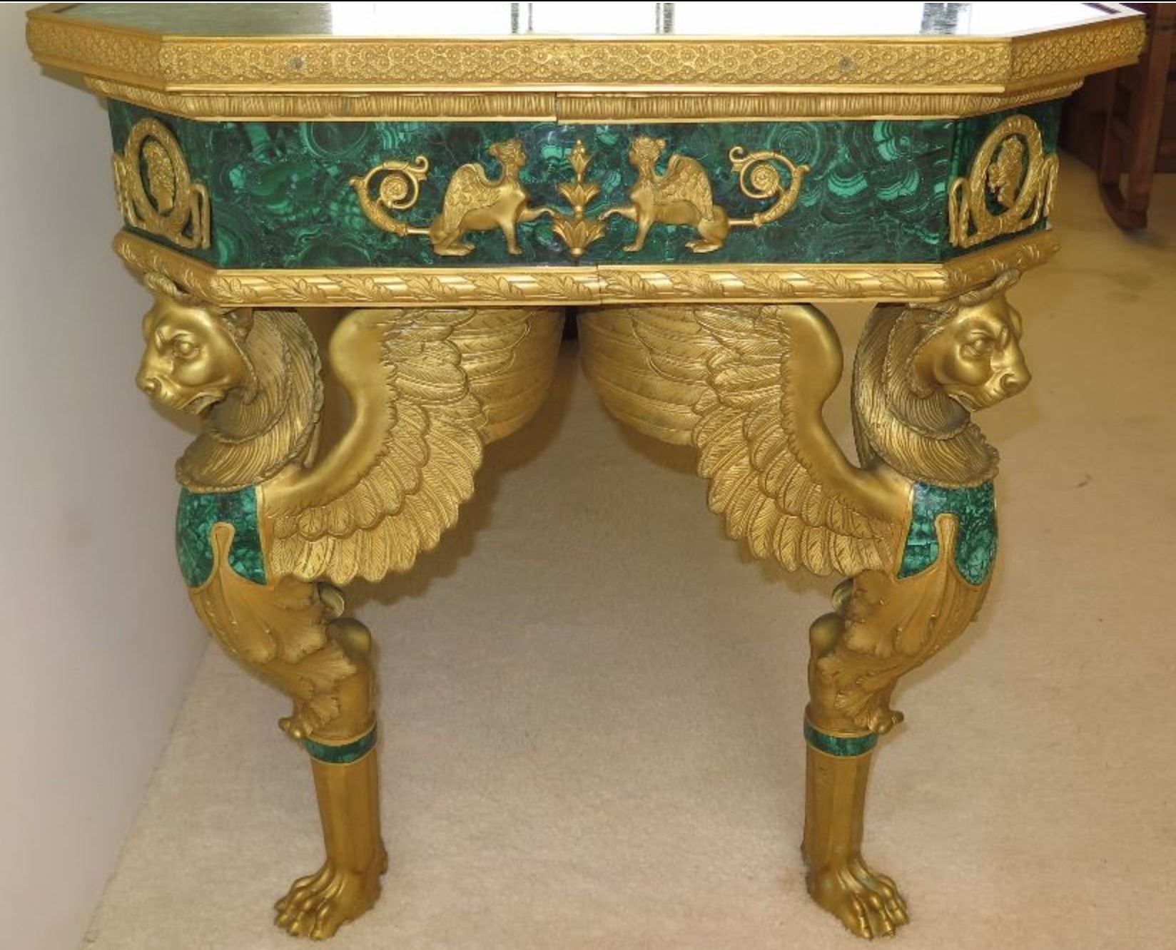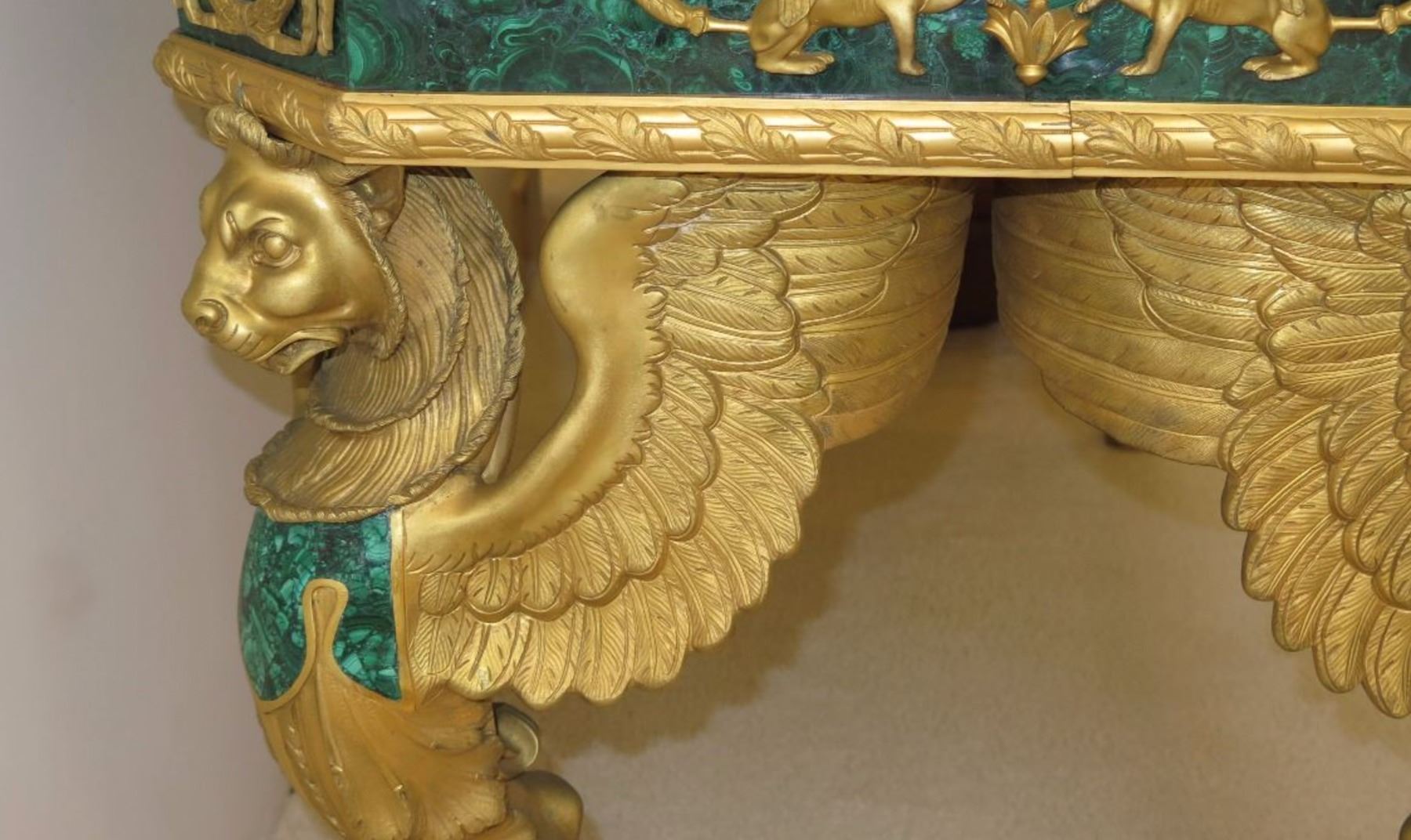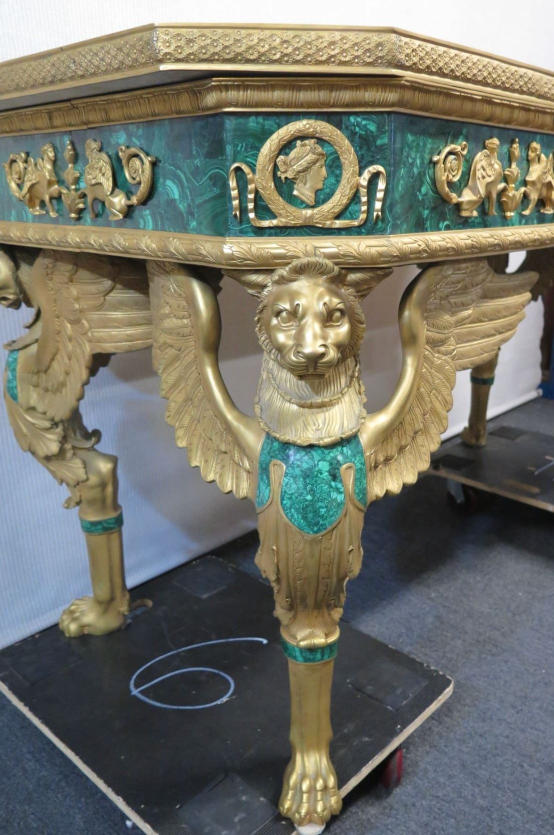 https://bid.oahuauctions.com/French-Empire-Style-Faux-Malachite-Overlay-Table-w-Gilt-Edging-and-Lion-Clawfoot-Details-63x31x32_i26854206