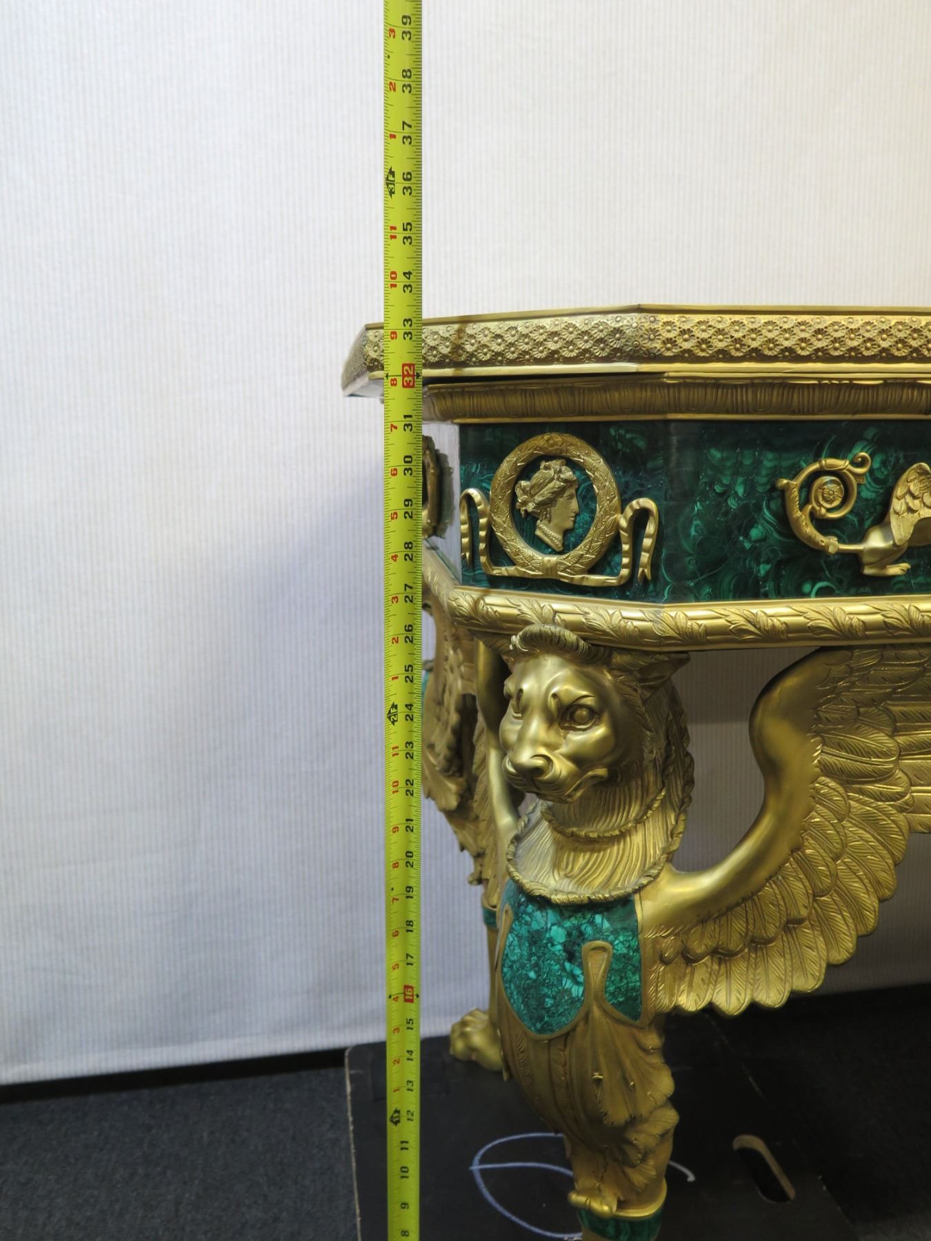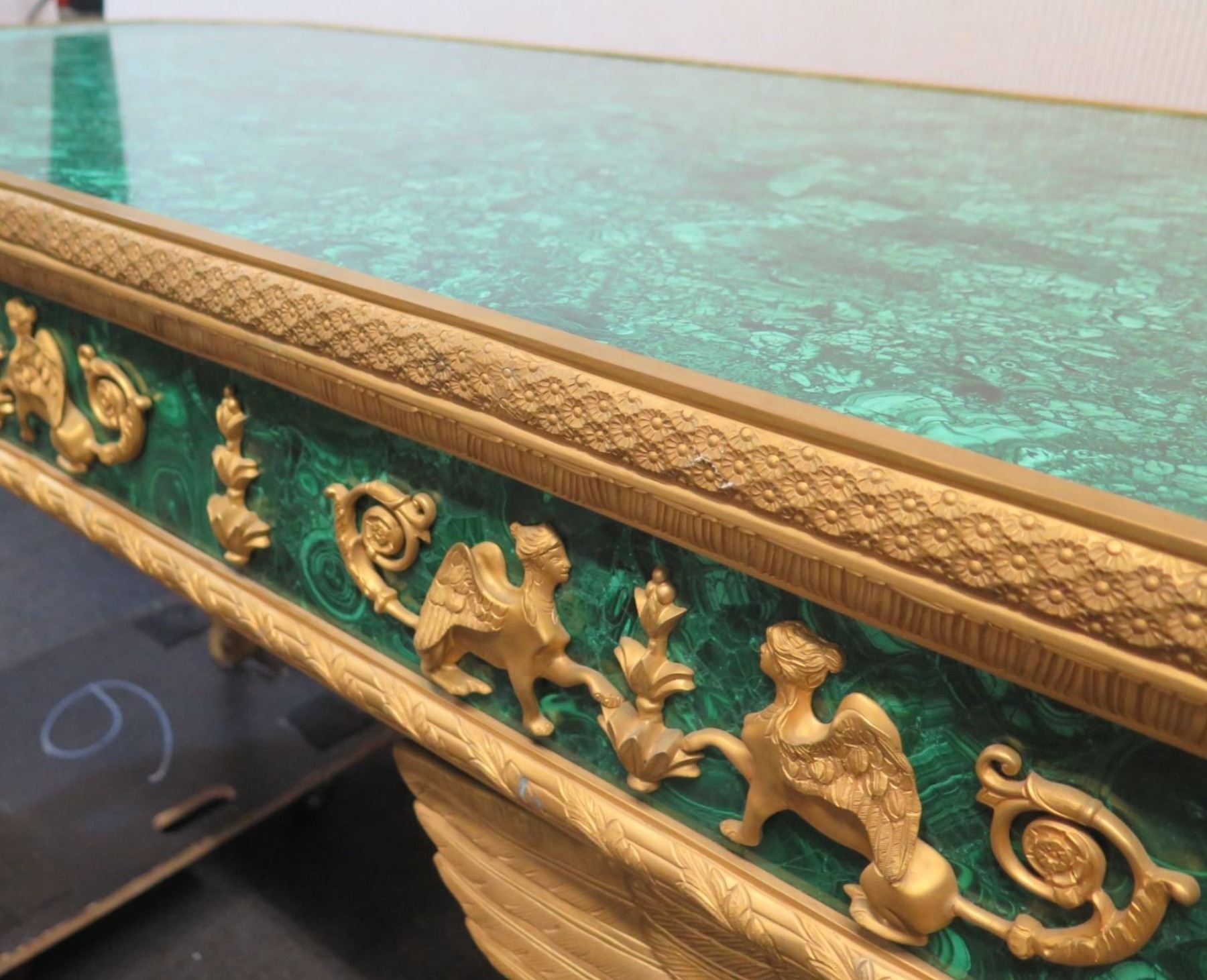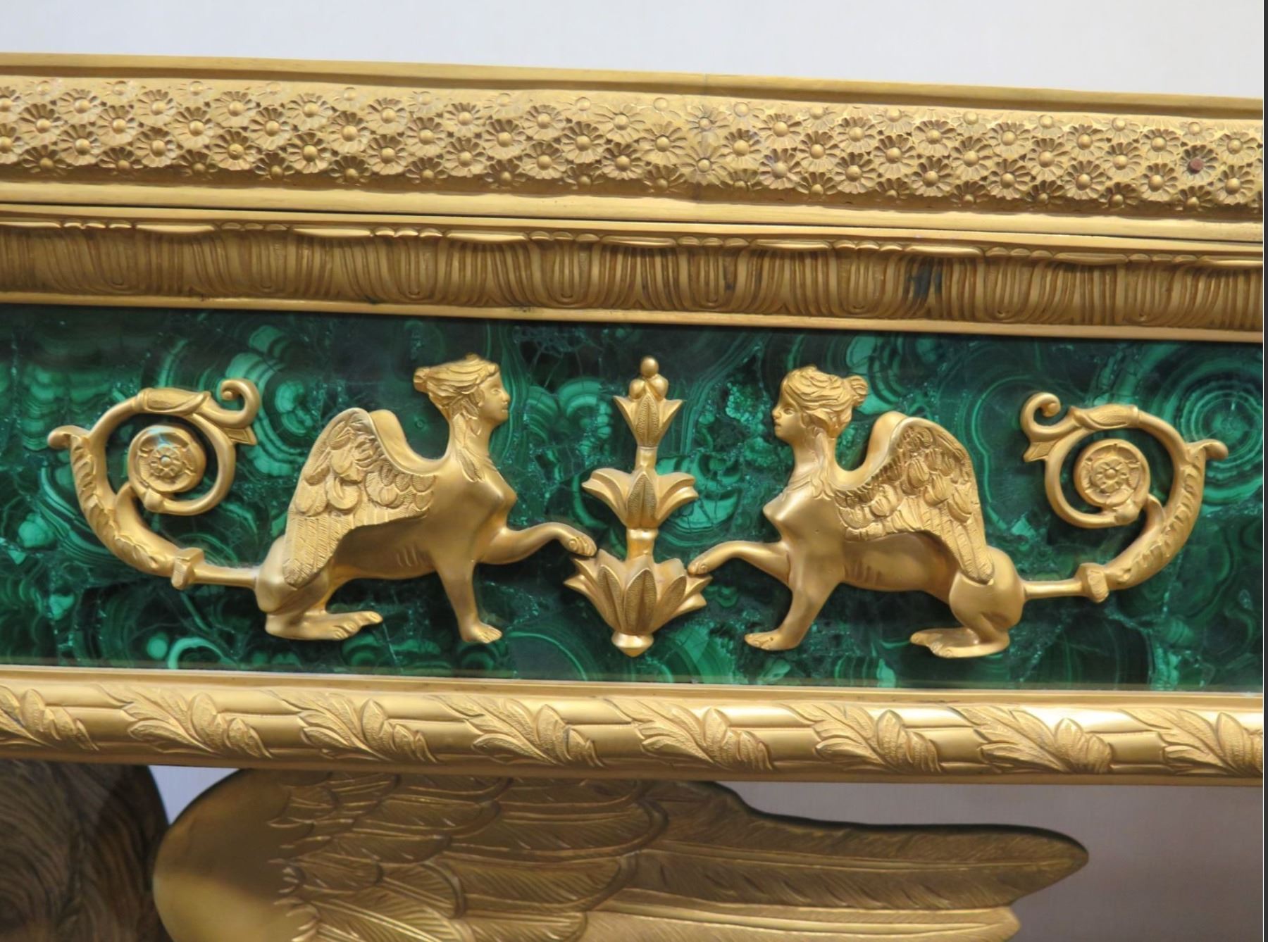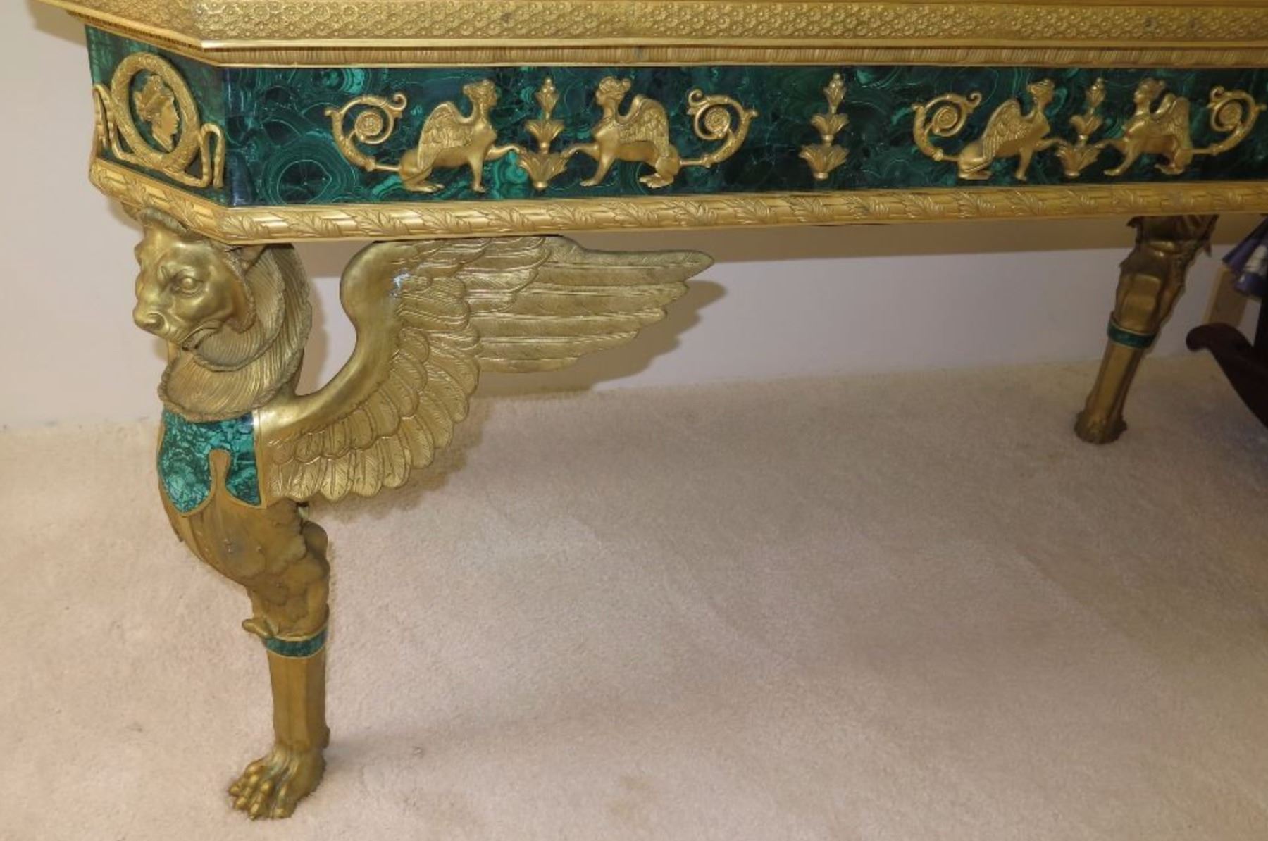 https://bid.oahuauctions.com/French-Empire-Style-Faux-Malachite-Overlay-Table-w-Gilt-Edging-and-Lion-Clawfoot-Details-63x31x32_i26854206