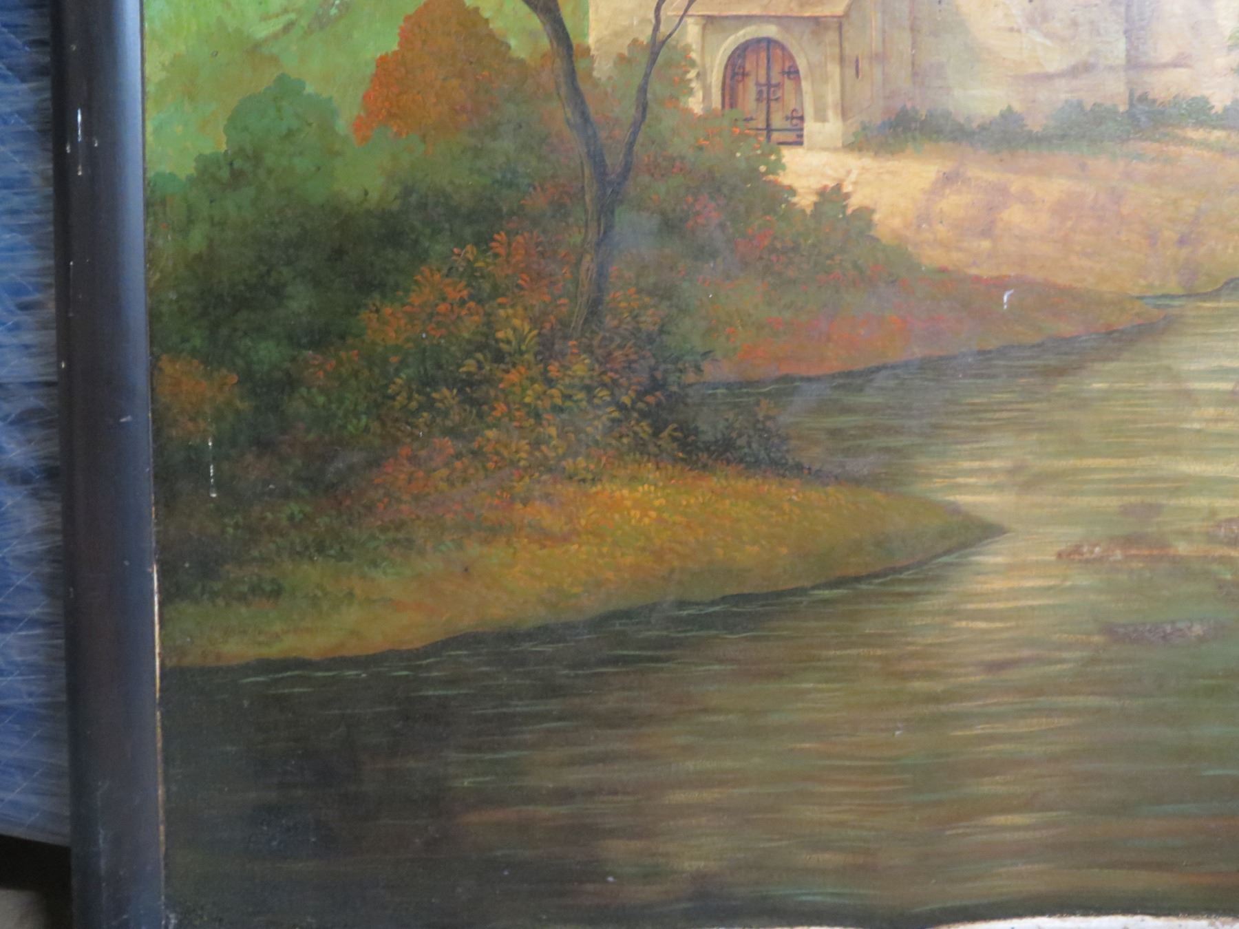 Large Framed Castle Landscape Artwork on Canvas, Signed Skilling 64"x64" (canvas damaged)