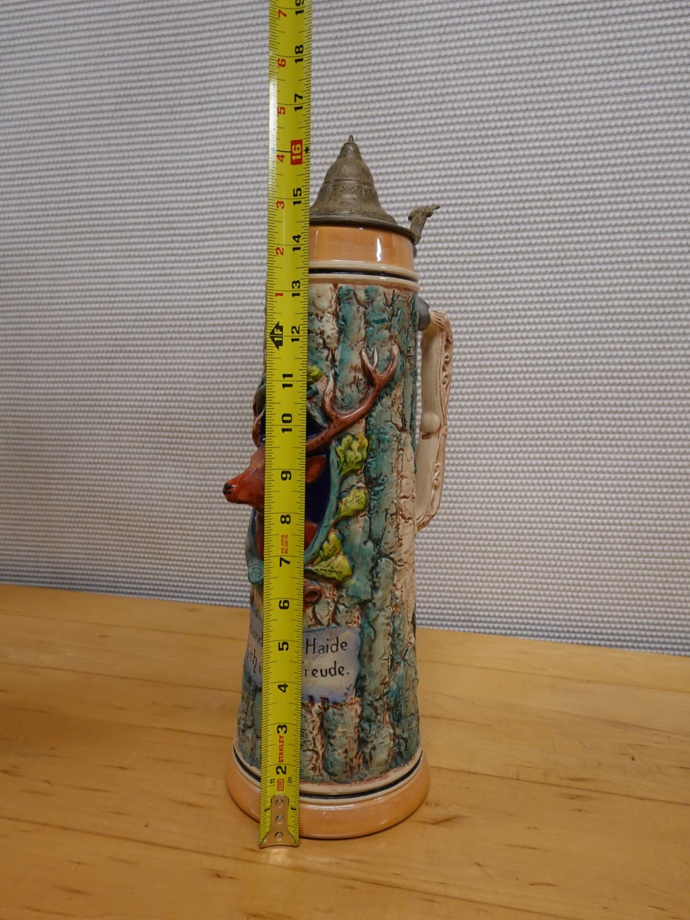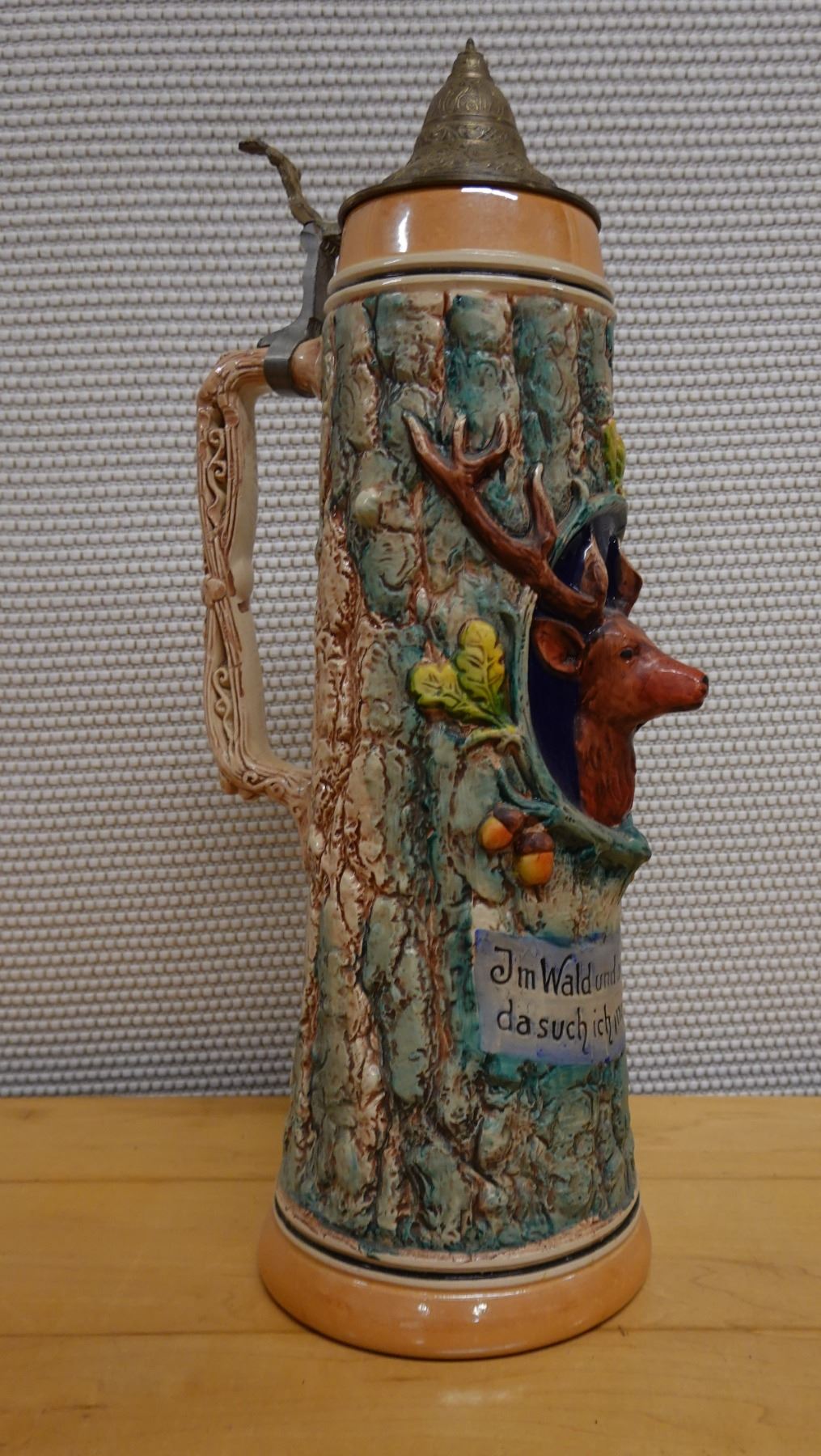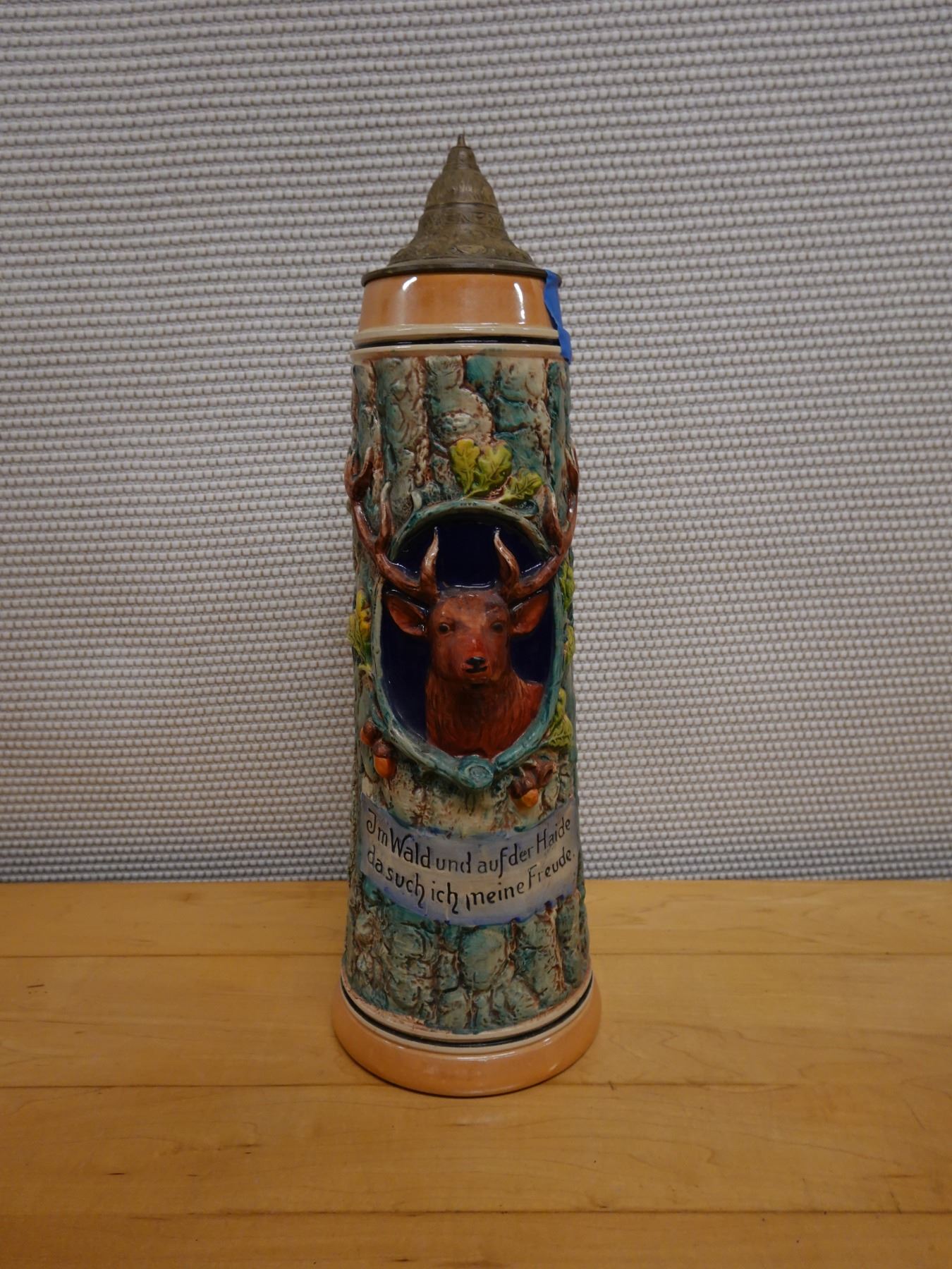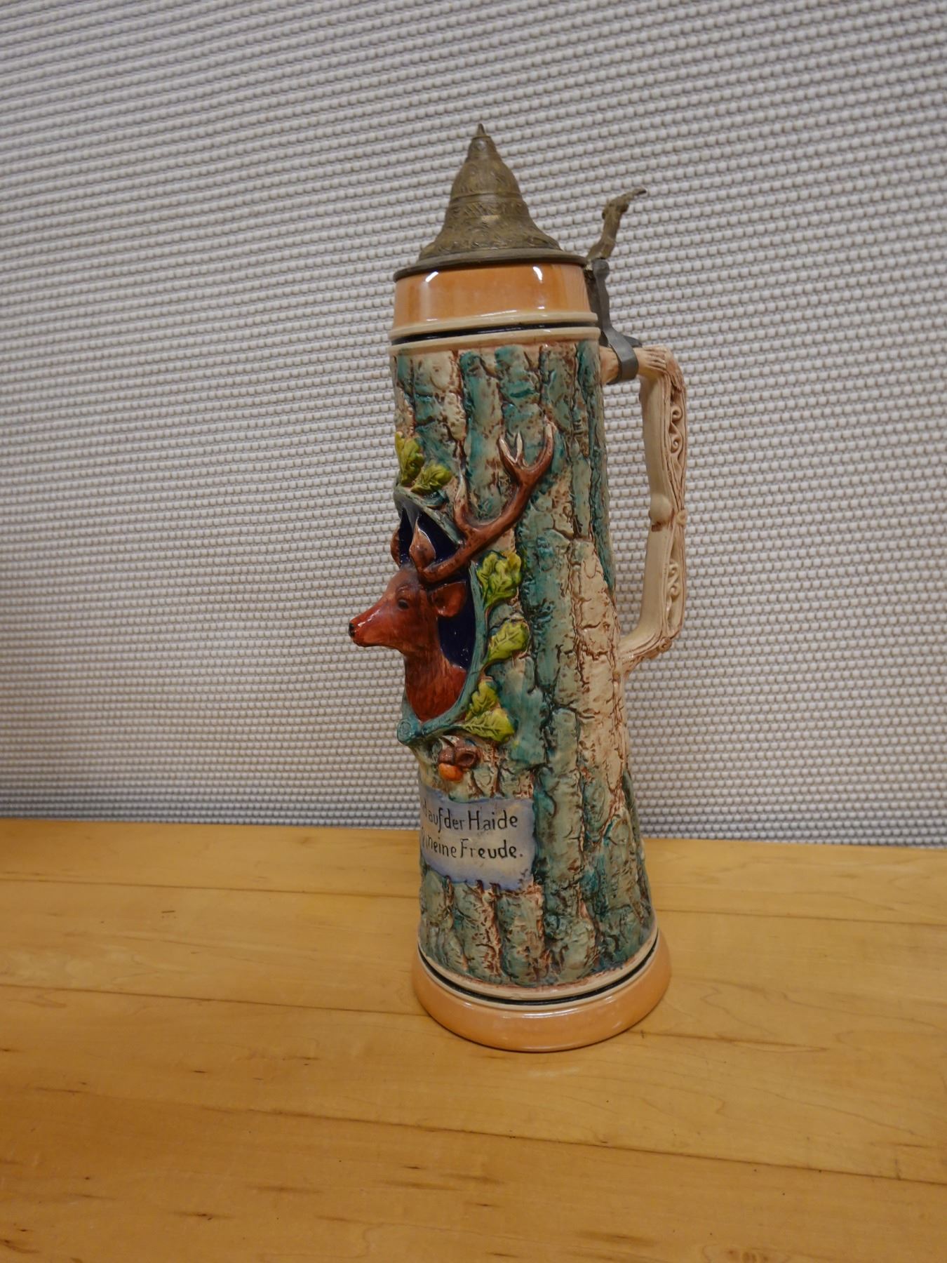 Large German Beer Stein w/ Lid, Maker's Mark & Deer Motif 5.5" Dia x 16.5"H