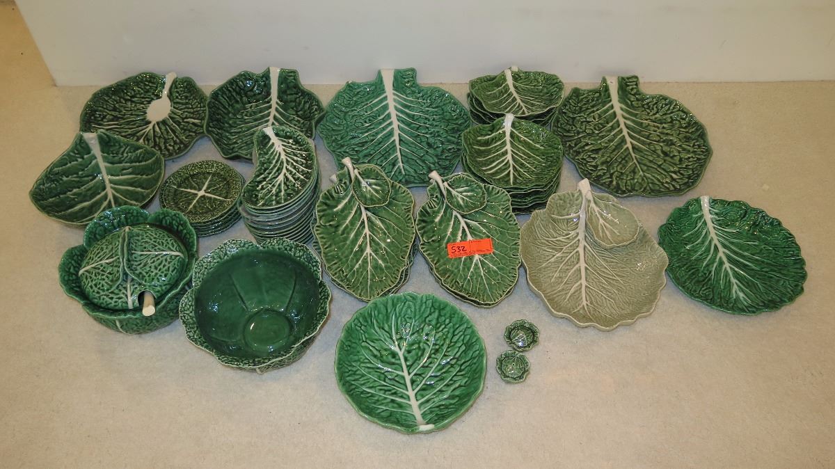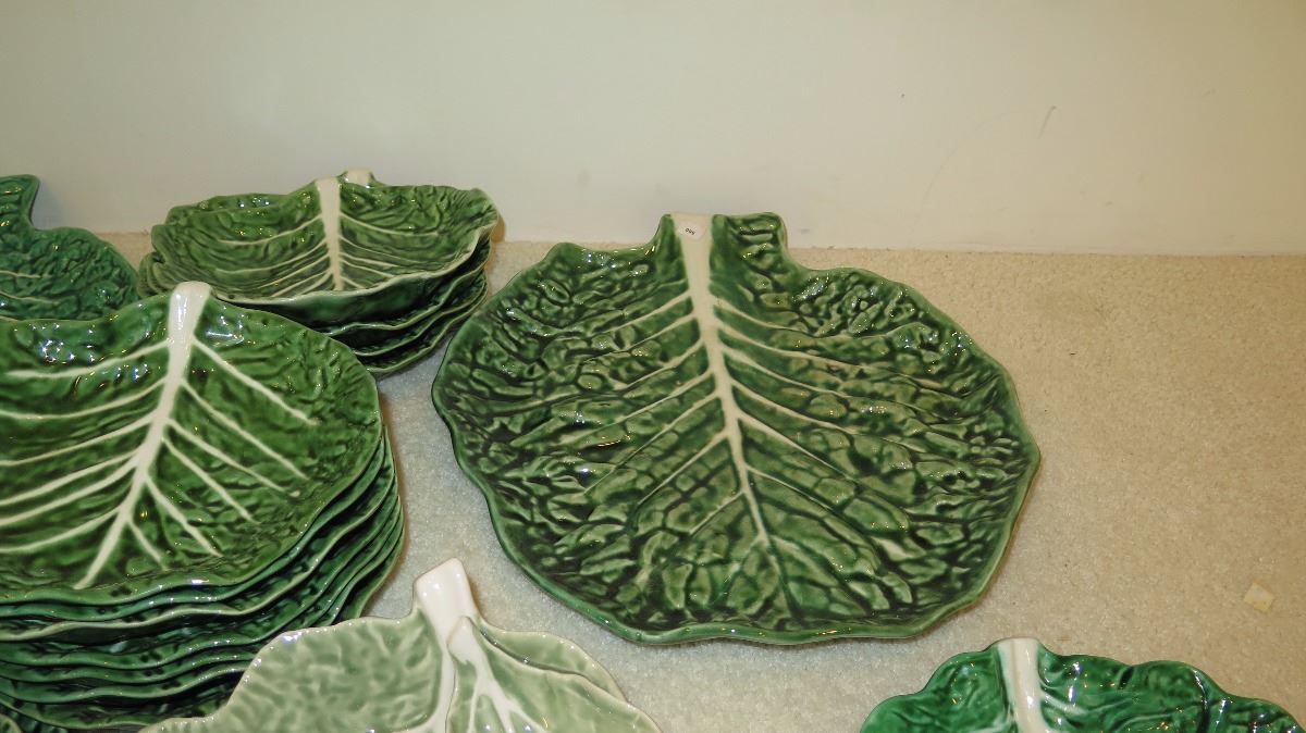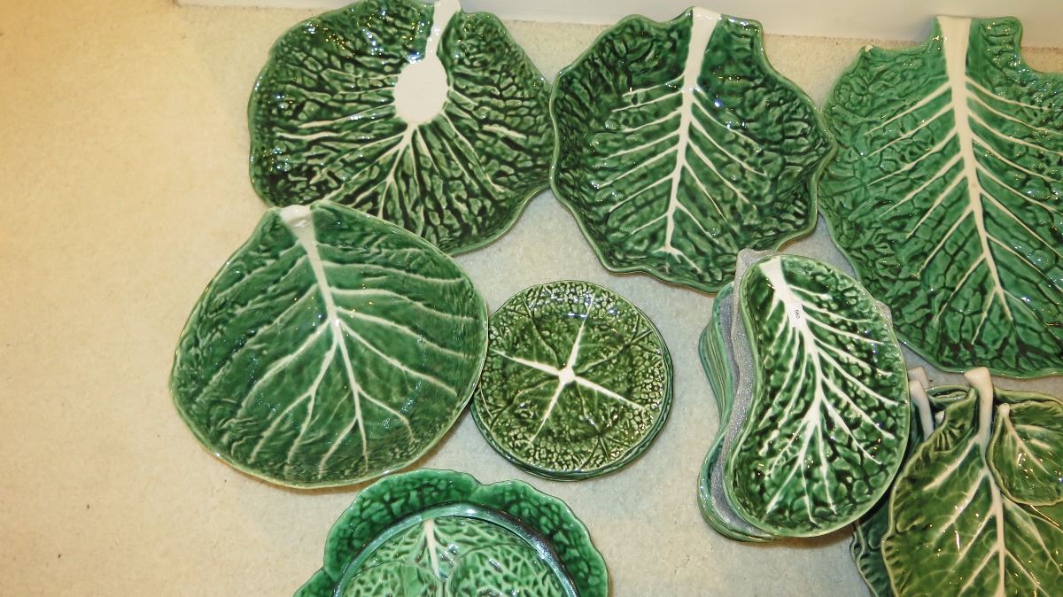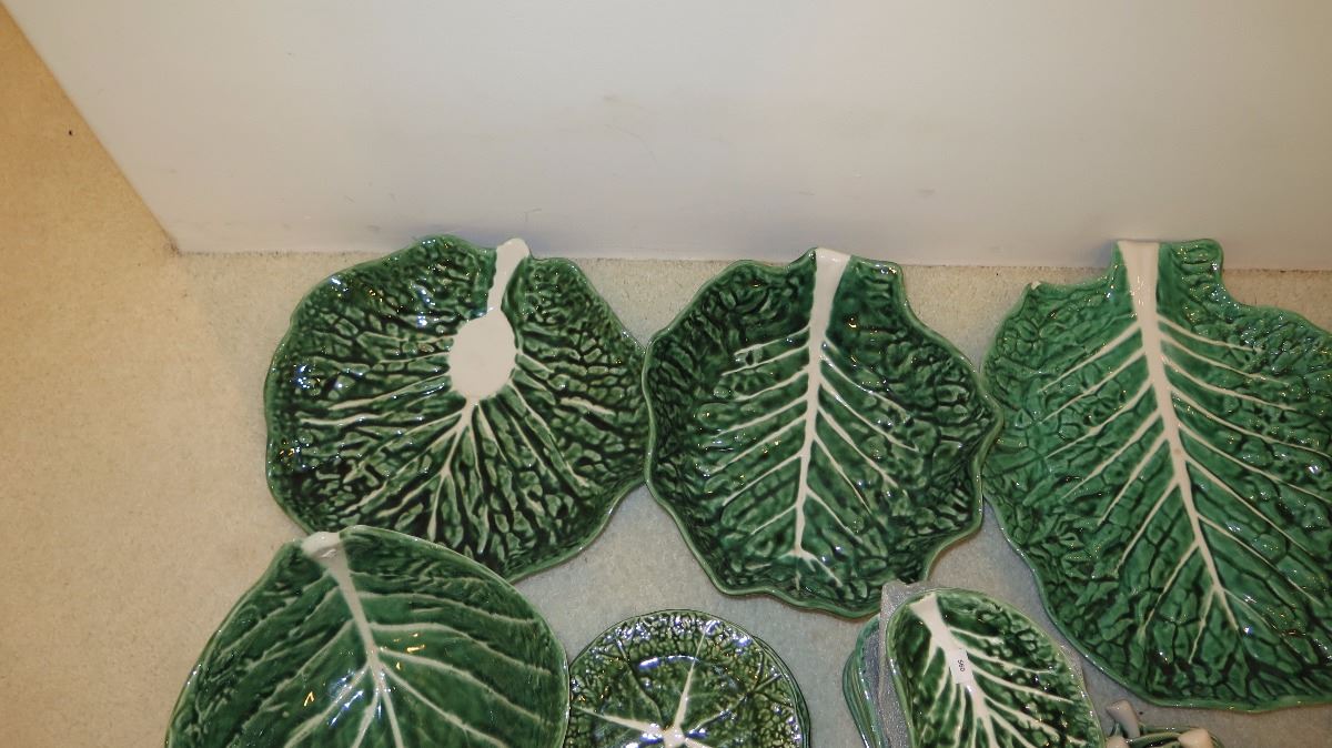 Large Lot of Belo (Portugal) Glazed Green Ceramic Cabbage Serveware, Trays, Bowls, Plates, etc.