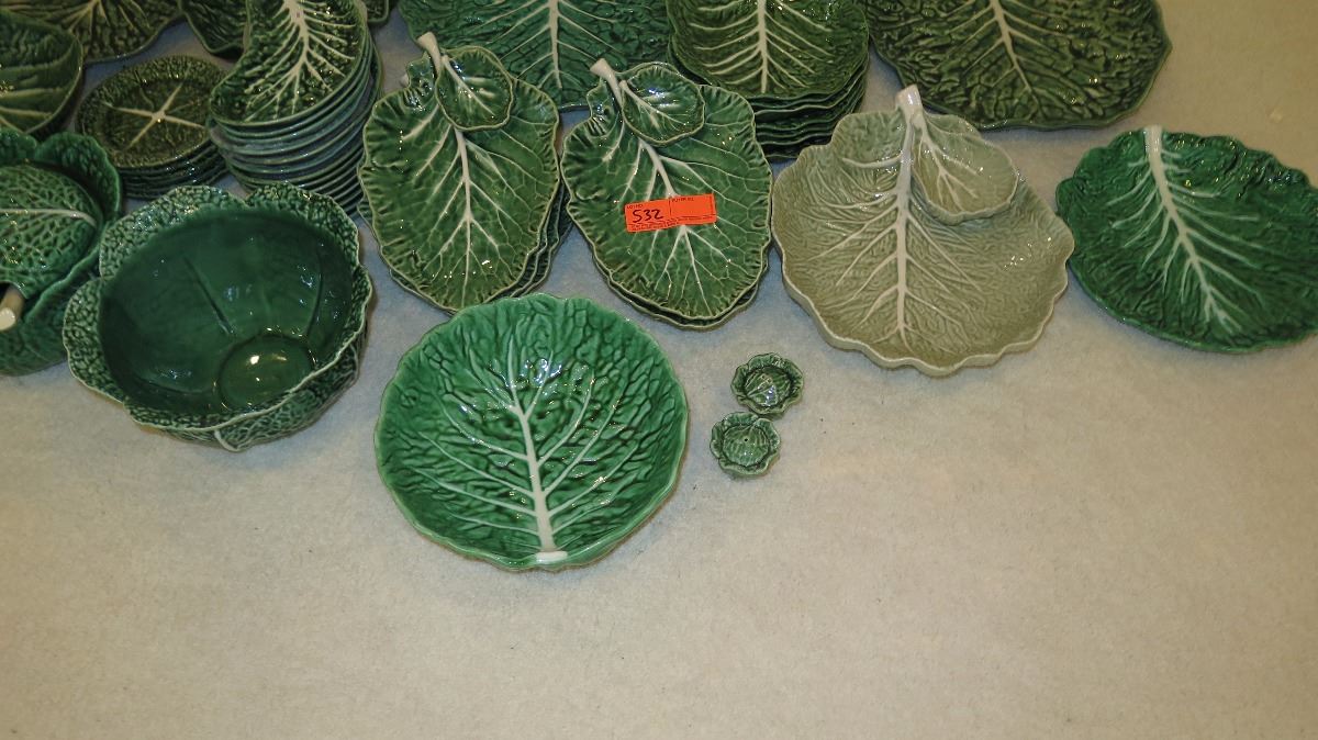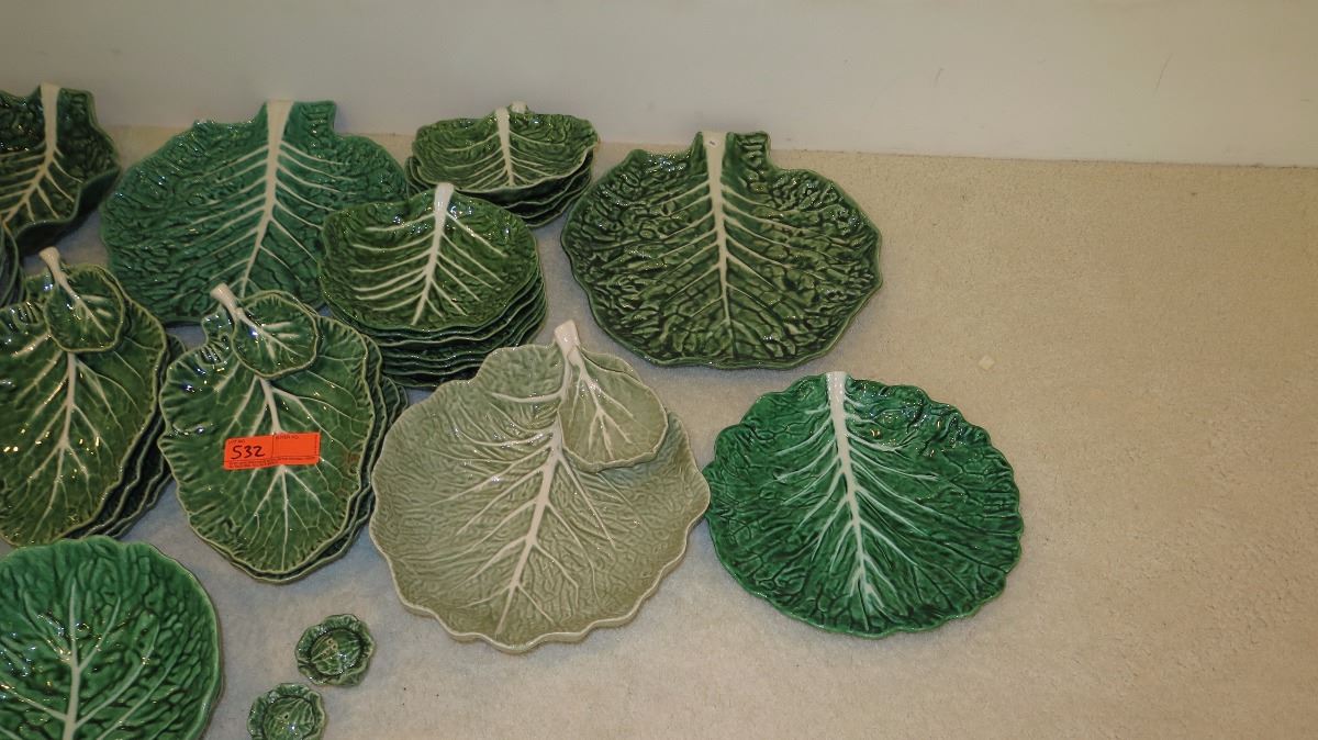 Large Lot of Glazed Green Ceramic Cabbage Serveware, Trays, Bowls, Plates, etc.