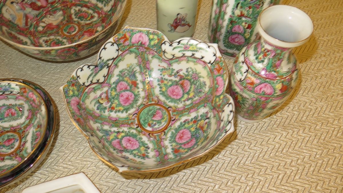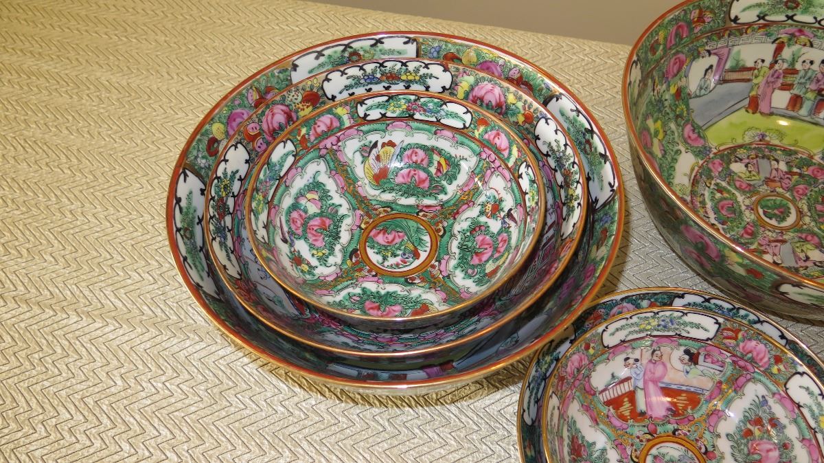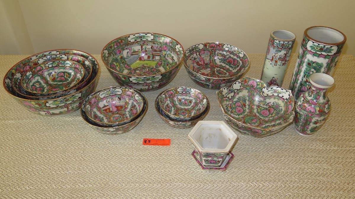 Large Lot of Rose Medallion Porcelain Serving Bowls, Vases, Planter - Various Markings