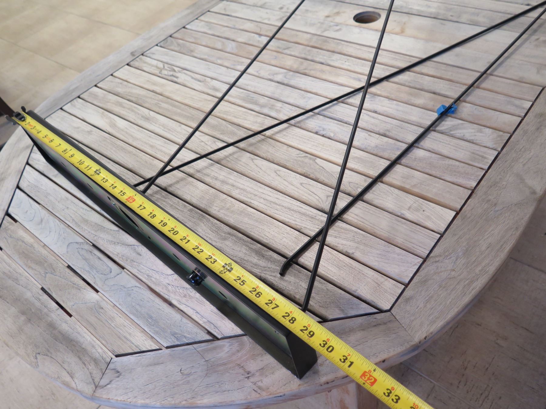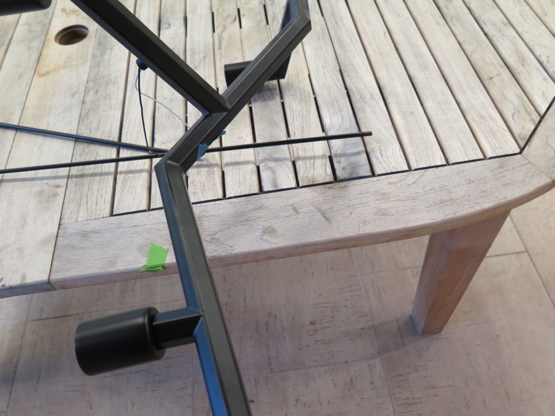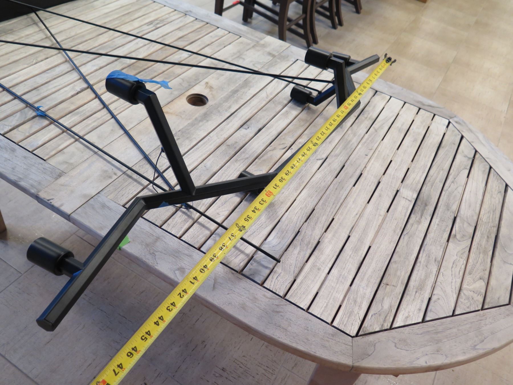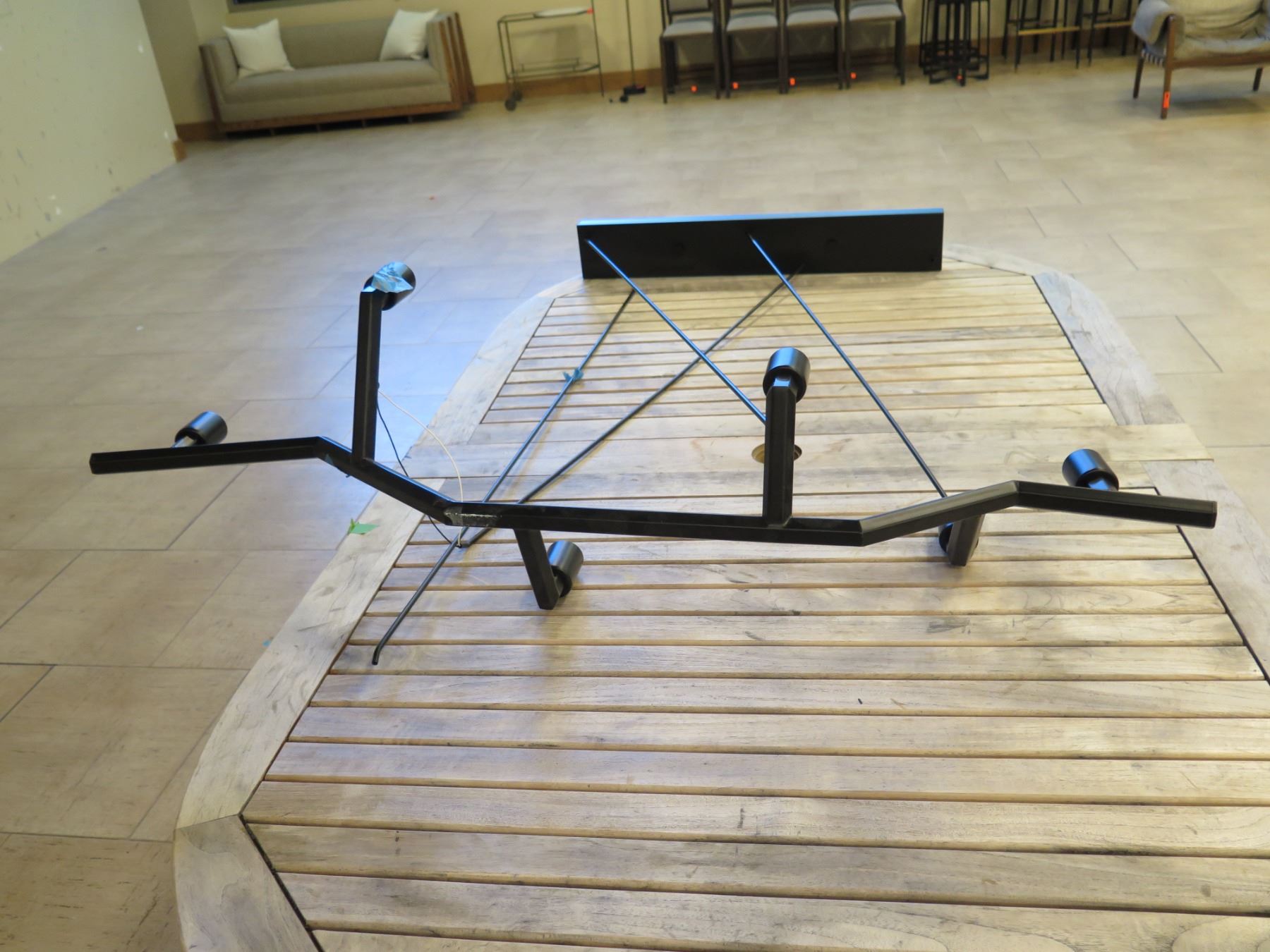 Large Modern Ceiling Lighting Fixture 30"L (base) 47"L (top) x 50"H. This is for the lighting fixture only, and NOT for the table that it's sitting on.