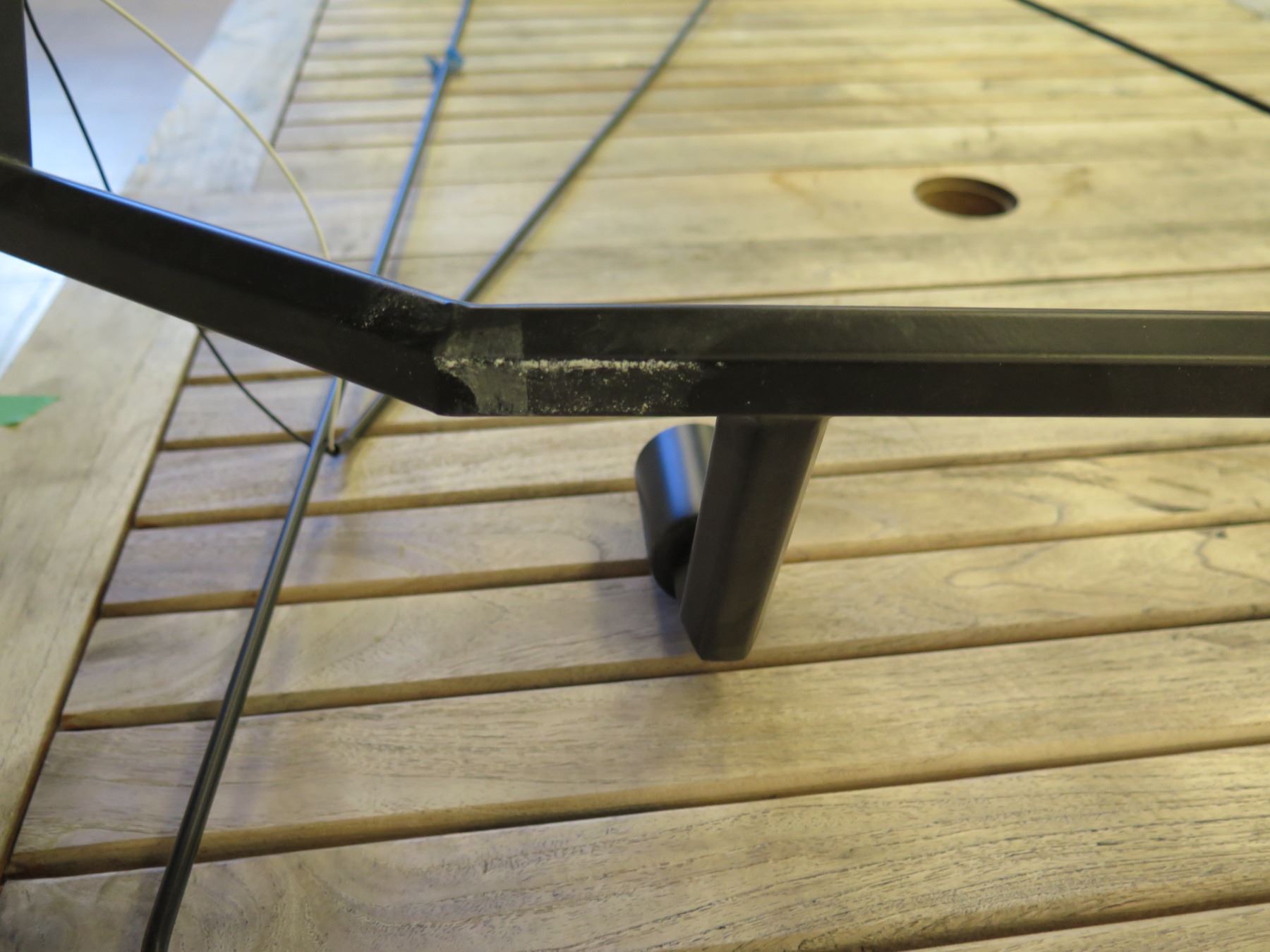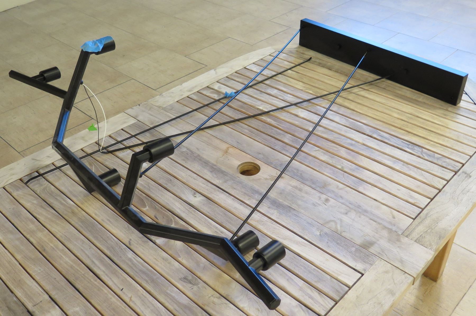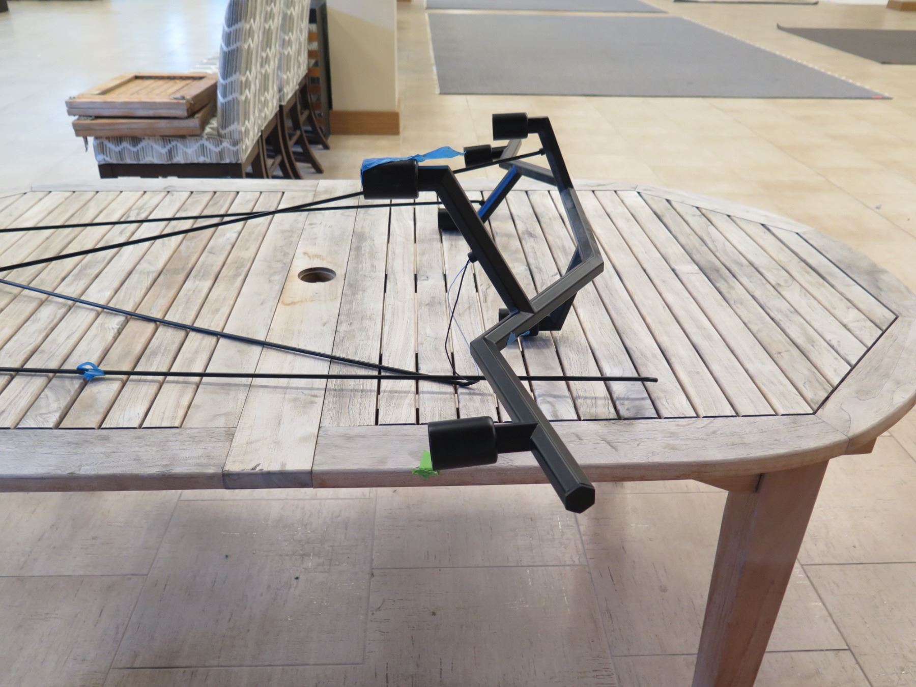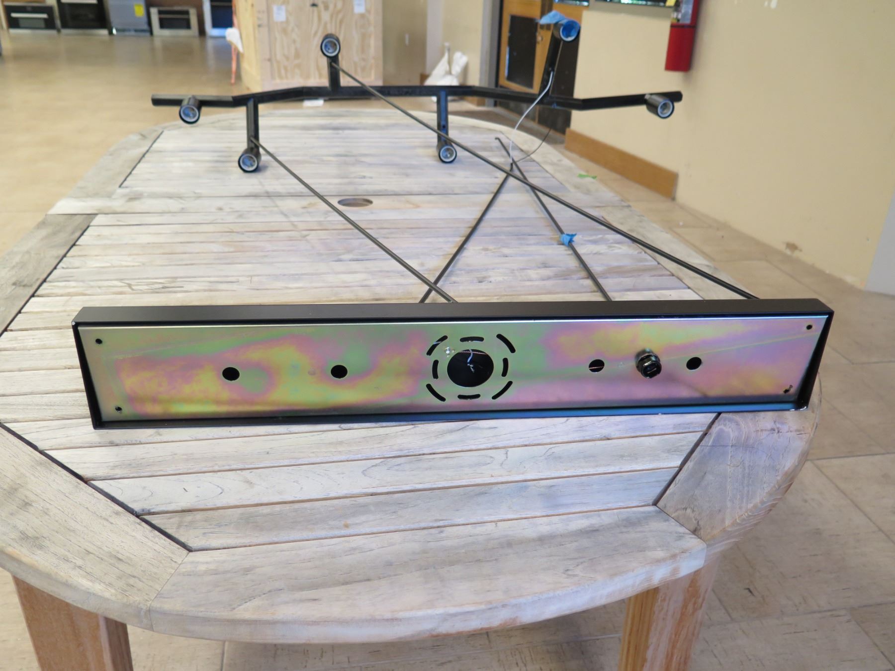 Large Modern Ceiling Lighting Fixture 30"L (base) 47"L (top) x 50"H. This is for the lighting fixture only, and NOT for the table that it's sitting on.