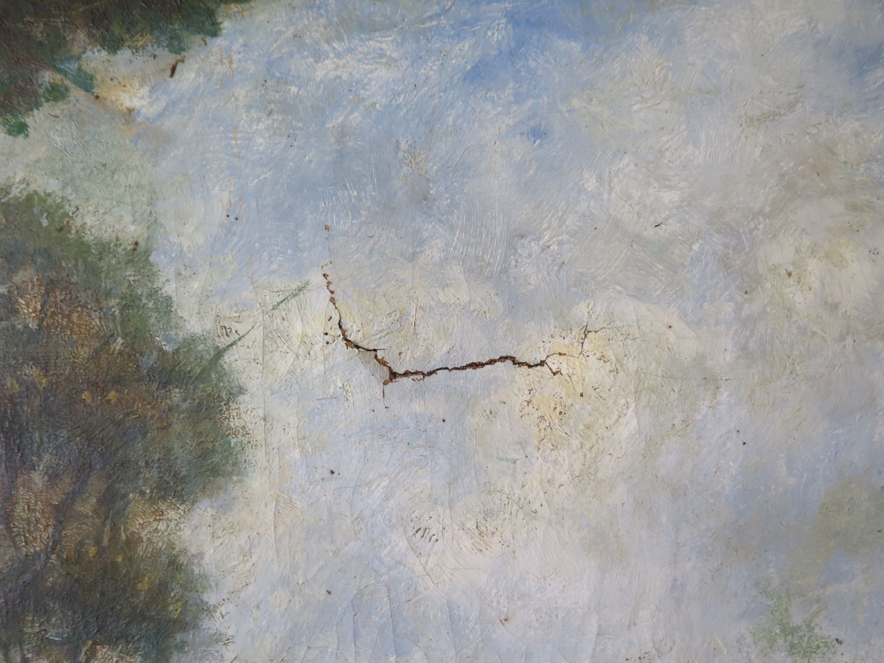 Oil Painting on Canvas, Landscape. Artist unknown. Early 1900’s, Gilded Frame 52"x42". Frame was made by Carrig-Rohane Frame Shop. Canvas damaged in two or more areas (see pictures).