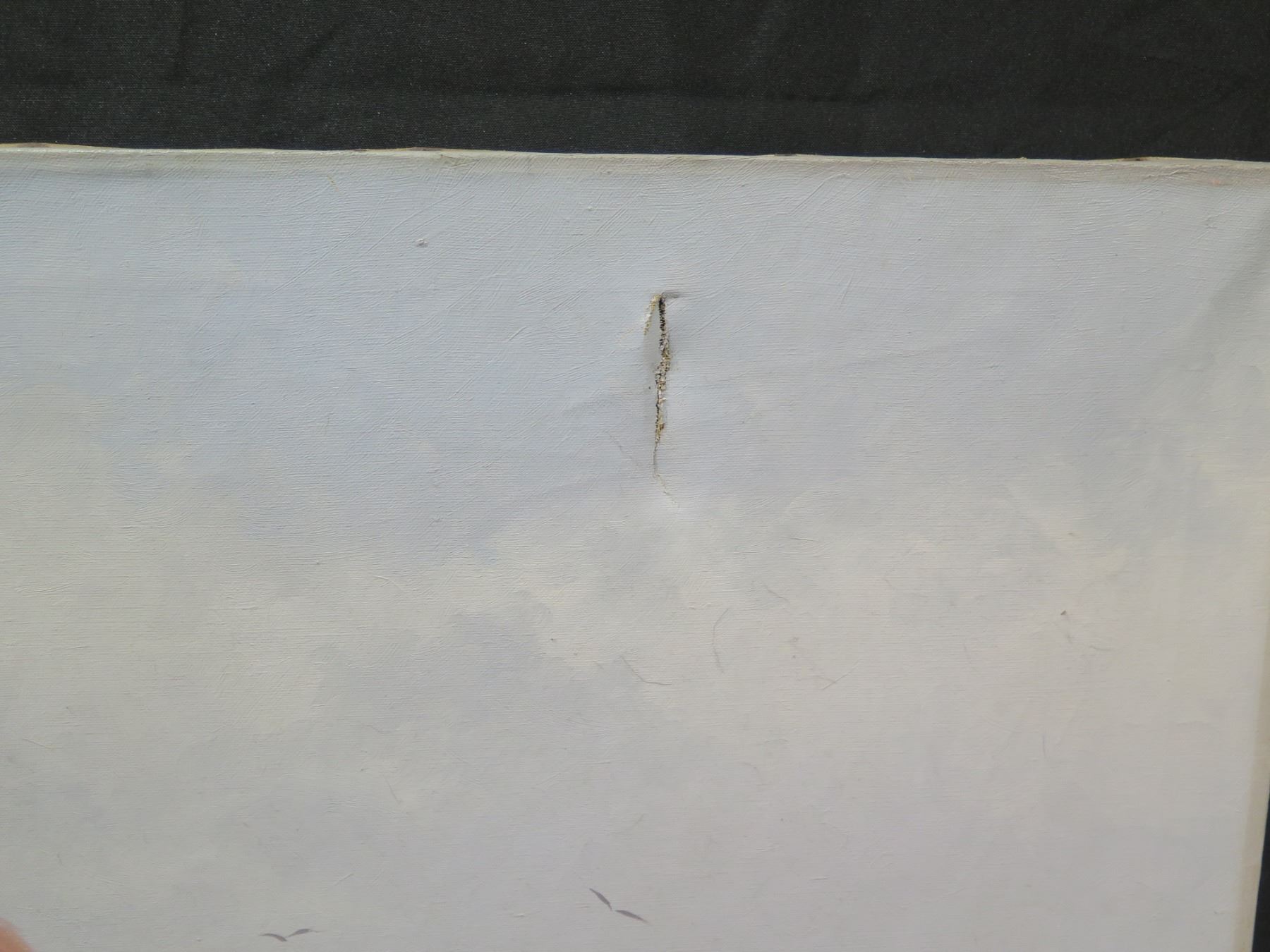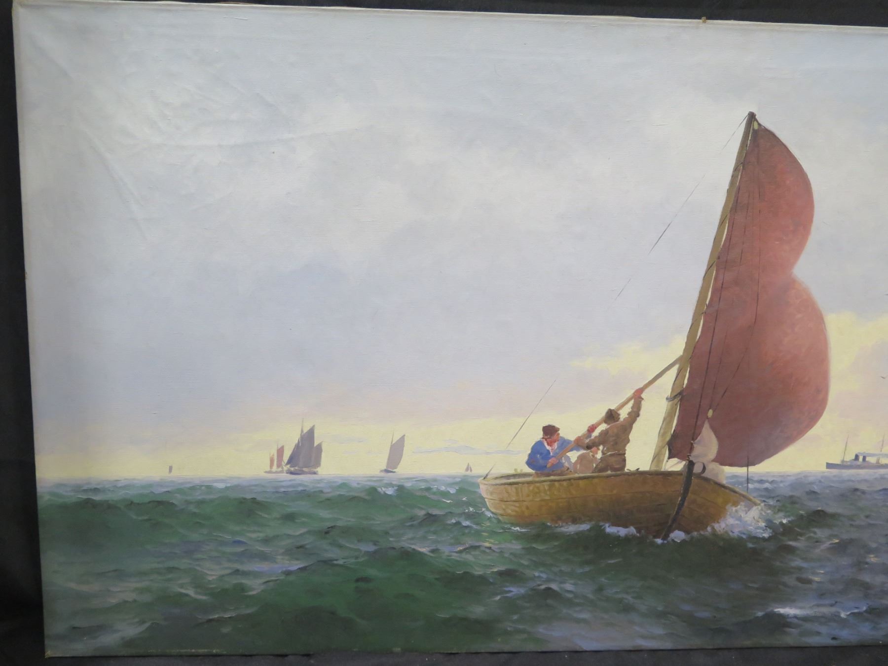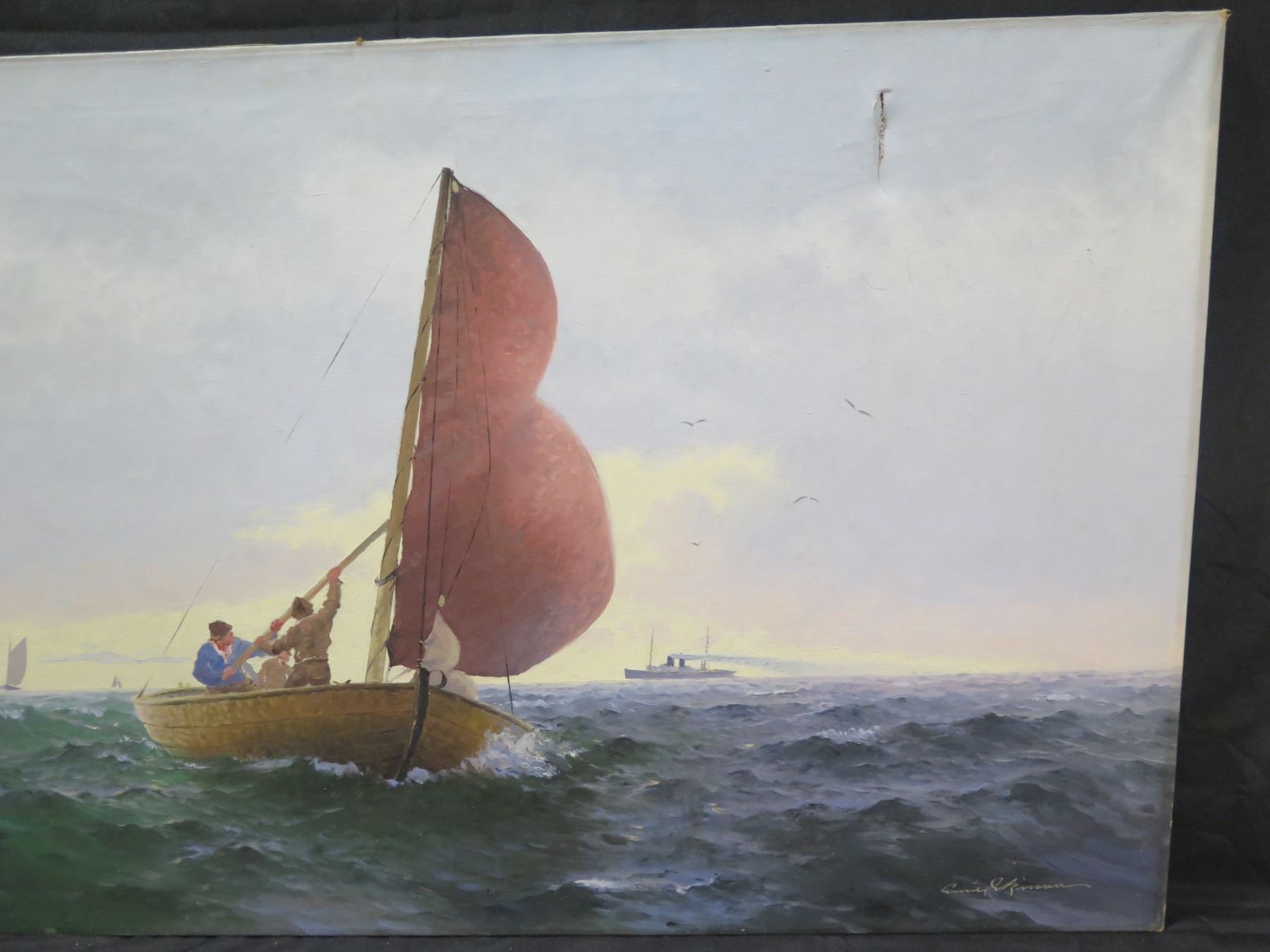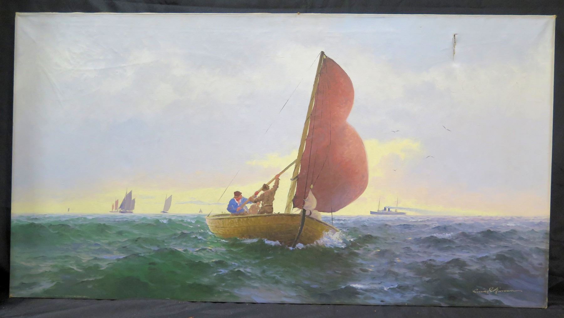 Large Original Oil on Canvas, Sailing, Signed by Artist Karglund (?) 11/24 50"x 27" Unframed. Canvas is damaged, as show in the 4th and 5th photos