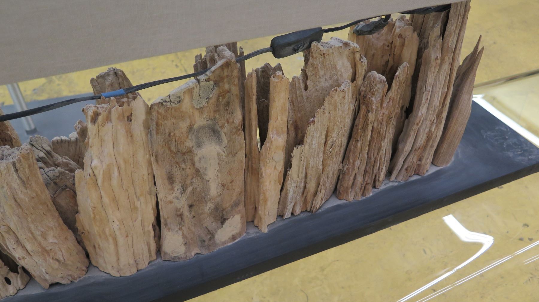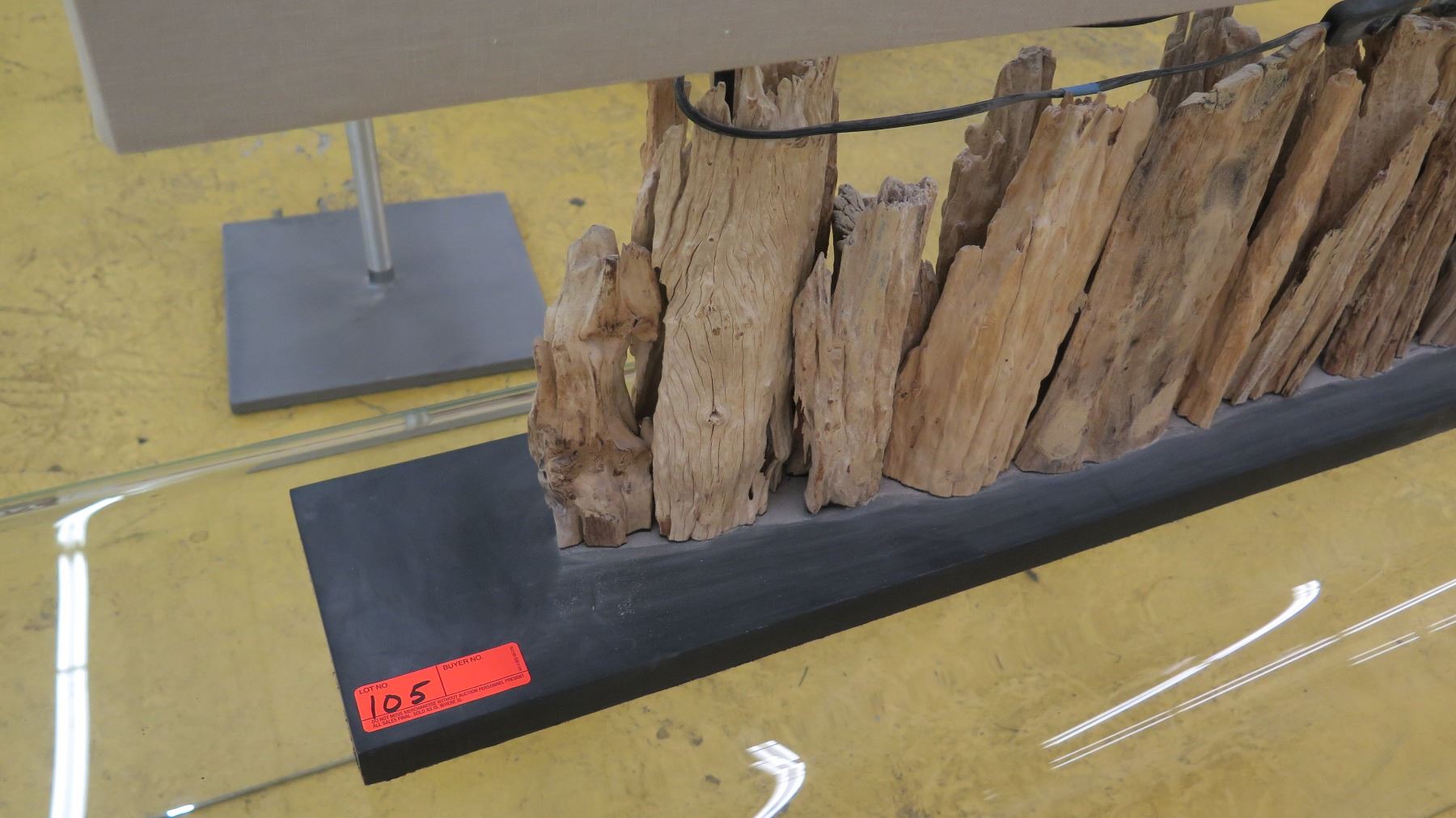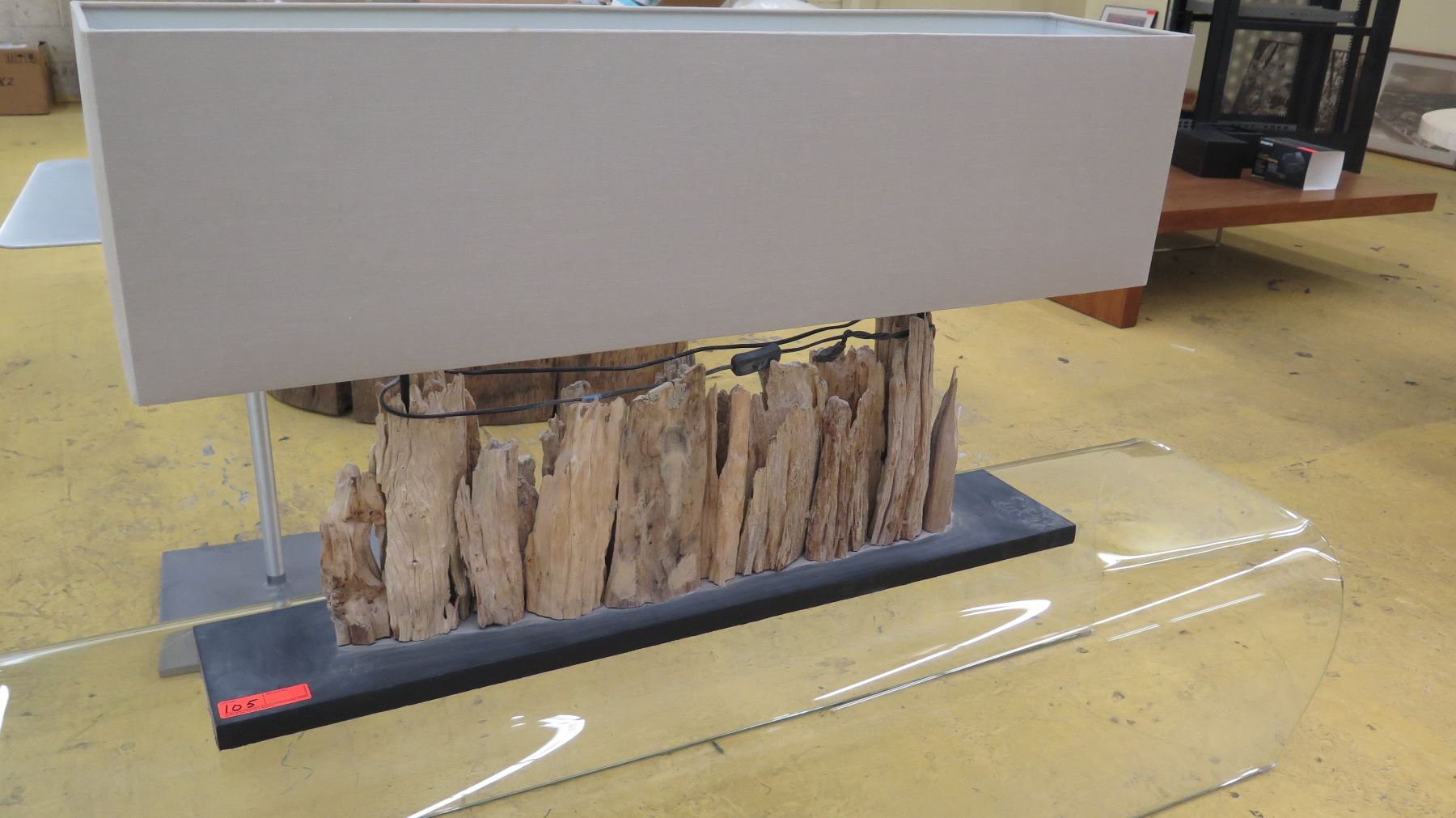 Large Rectangular Lamp w/Natural Driftwood Base, Box Shade (45" x 10"), 27" H (shade sits perfectly but missing the hardwared that secures it into place).