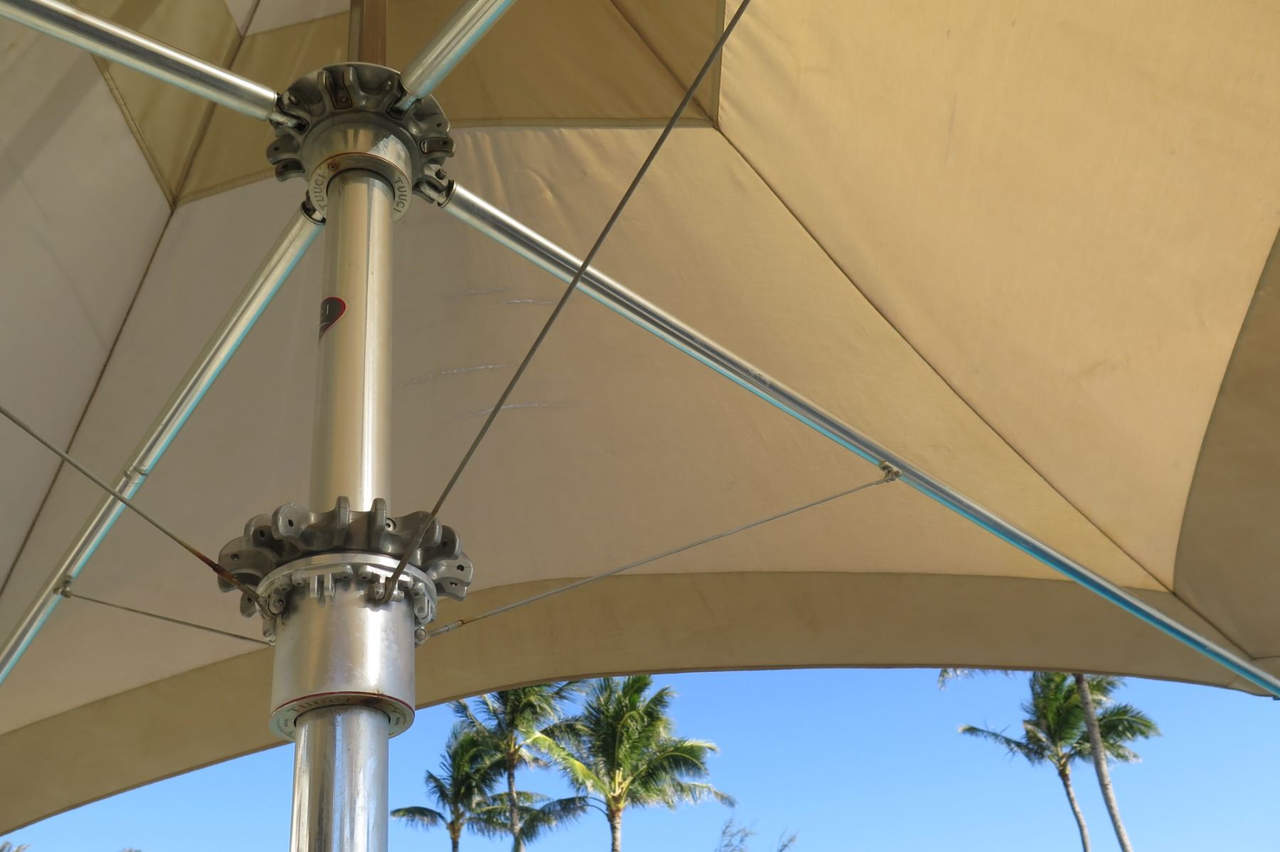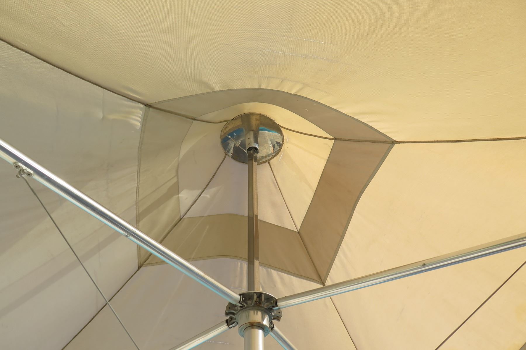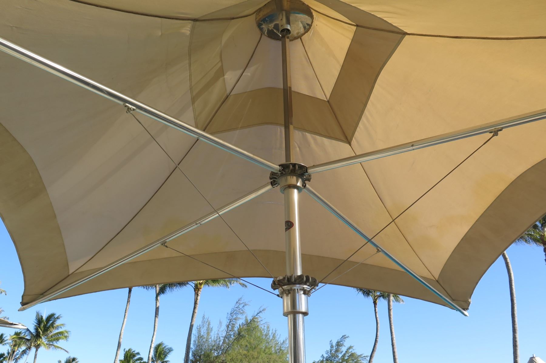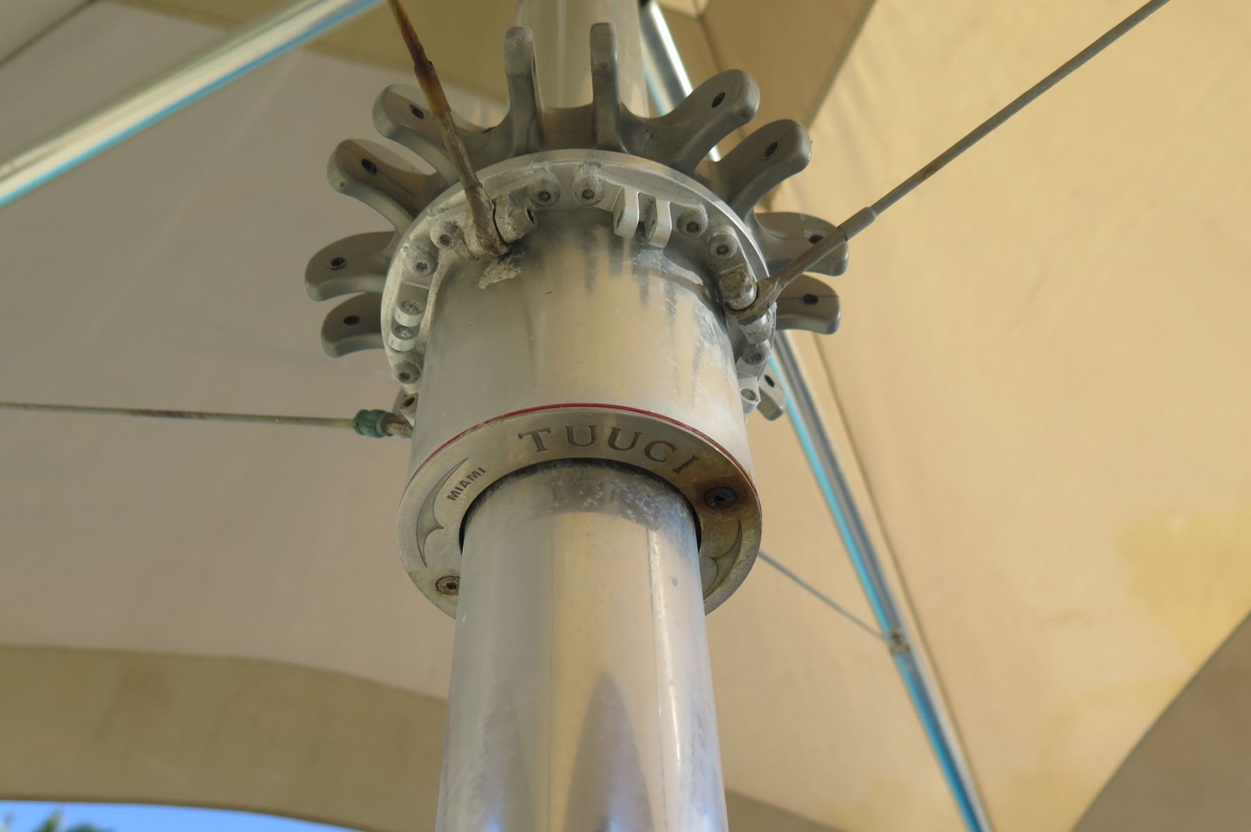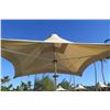 Large Tuuci Collapsible 4-Spoke Umbrella, 161" Tall, Approx. 216" Across. Includes crank to open up & fold down umbrella. This umbrella has been unbolted and ready for transport.