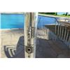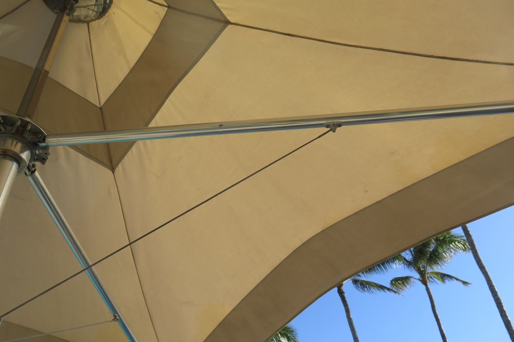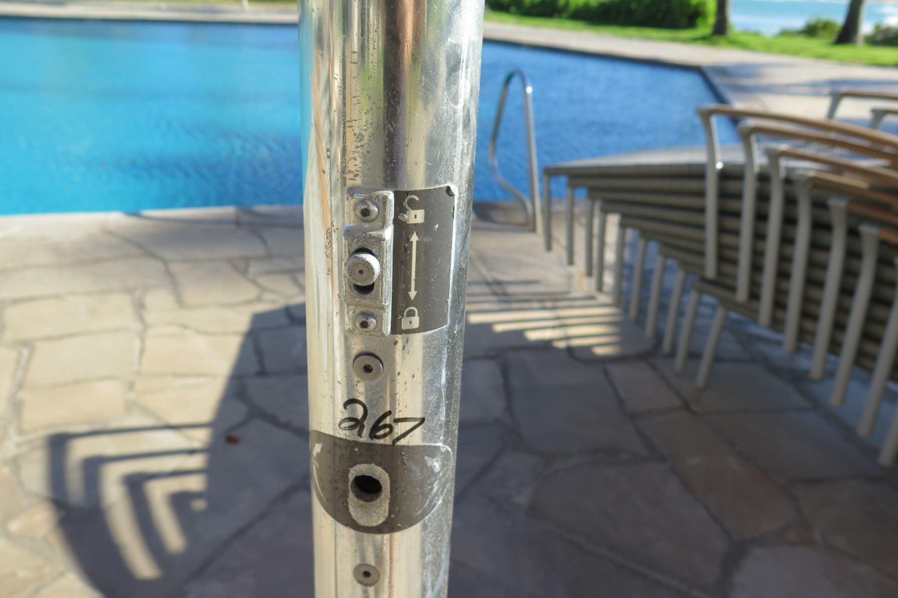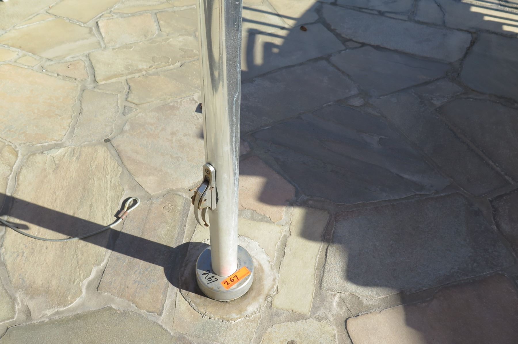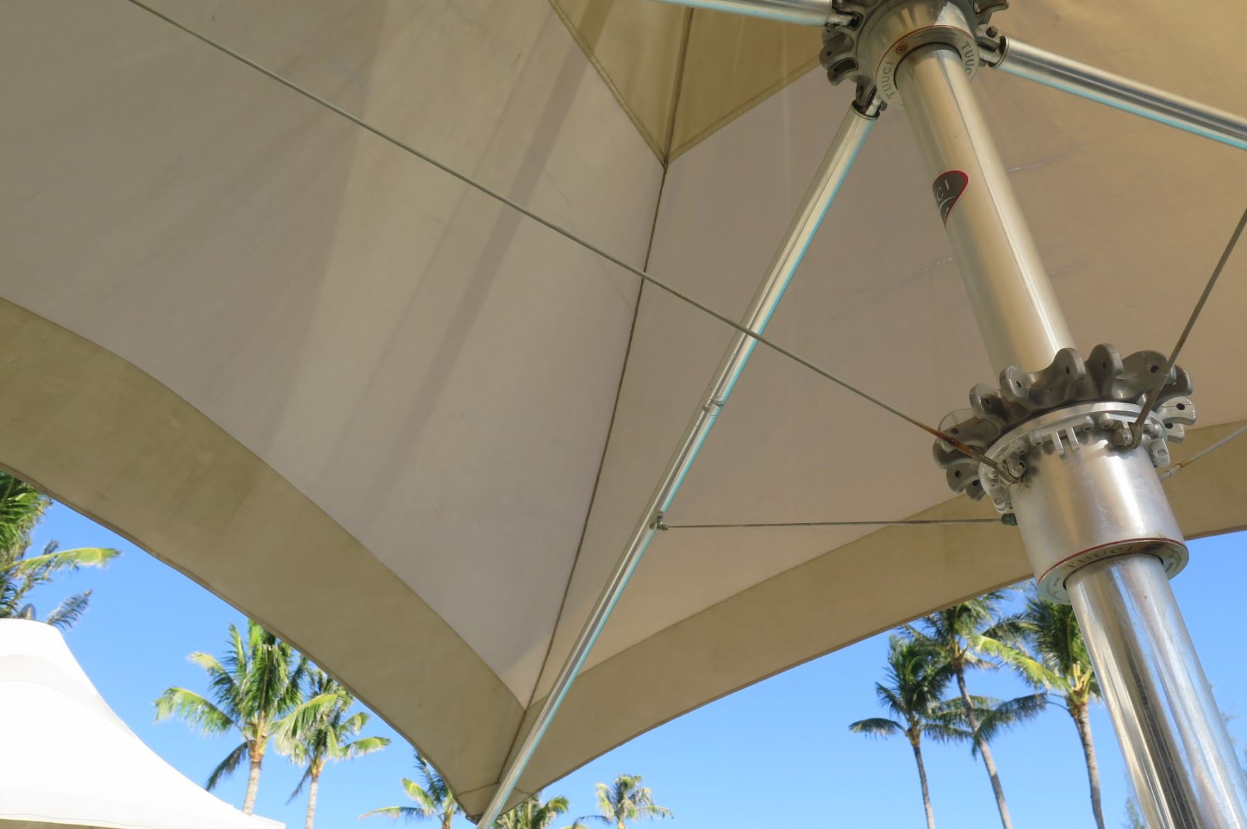 Large Tuuci Collapsible 4-Spoke Umbrella, 161" Tall, Approx. 216" Across. Includes crank to open up & fold down umbrella. This umbrella has been unbolted and ready for transport.