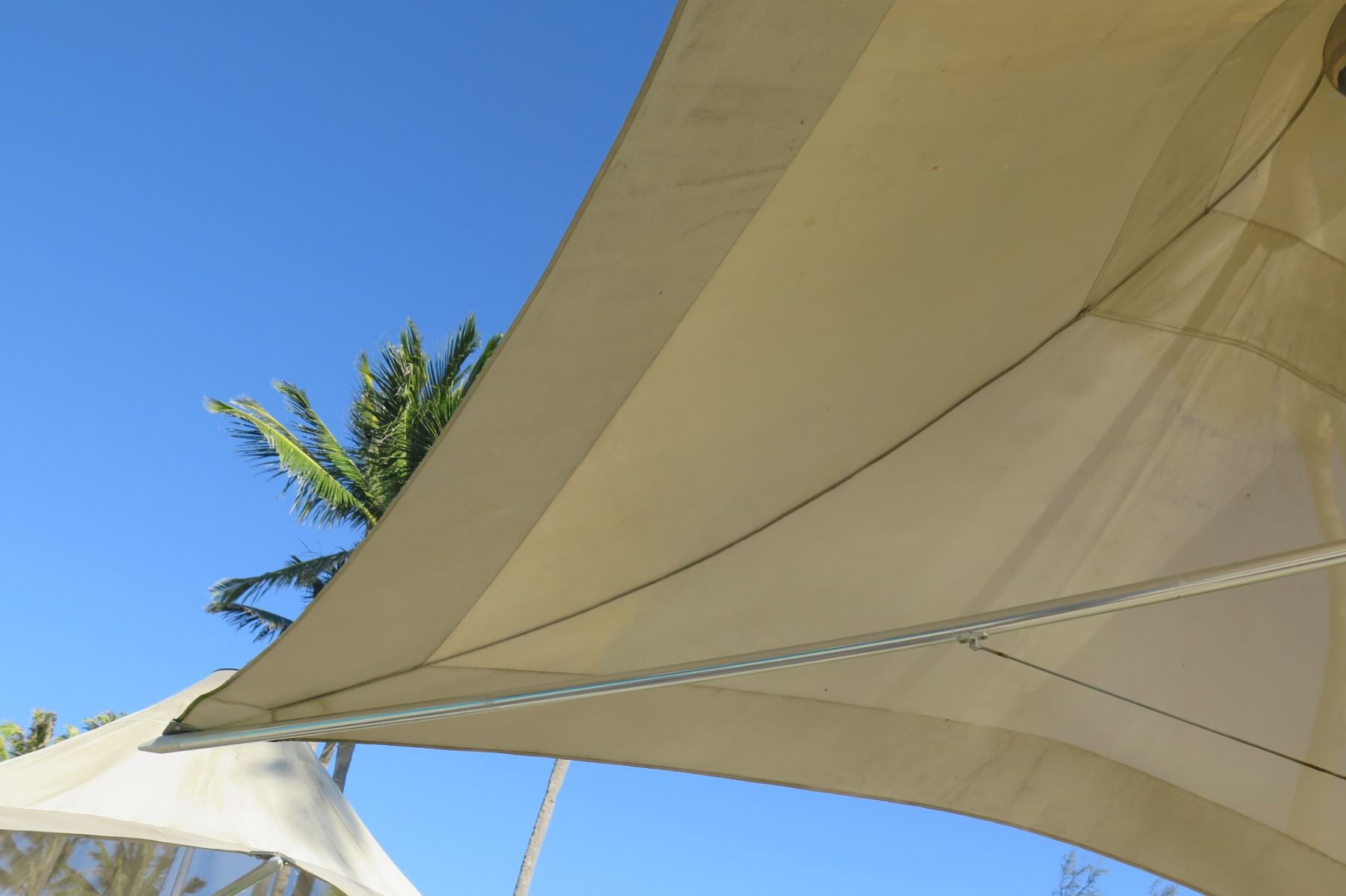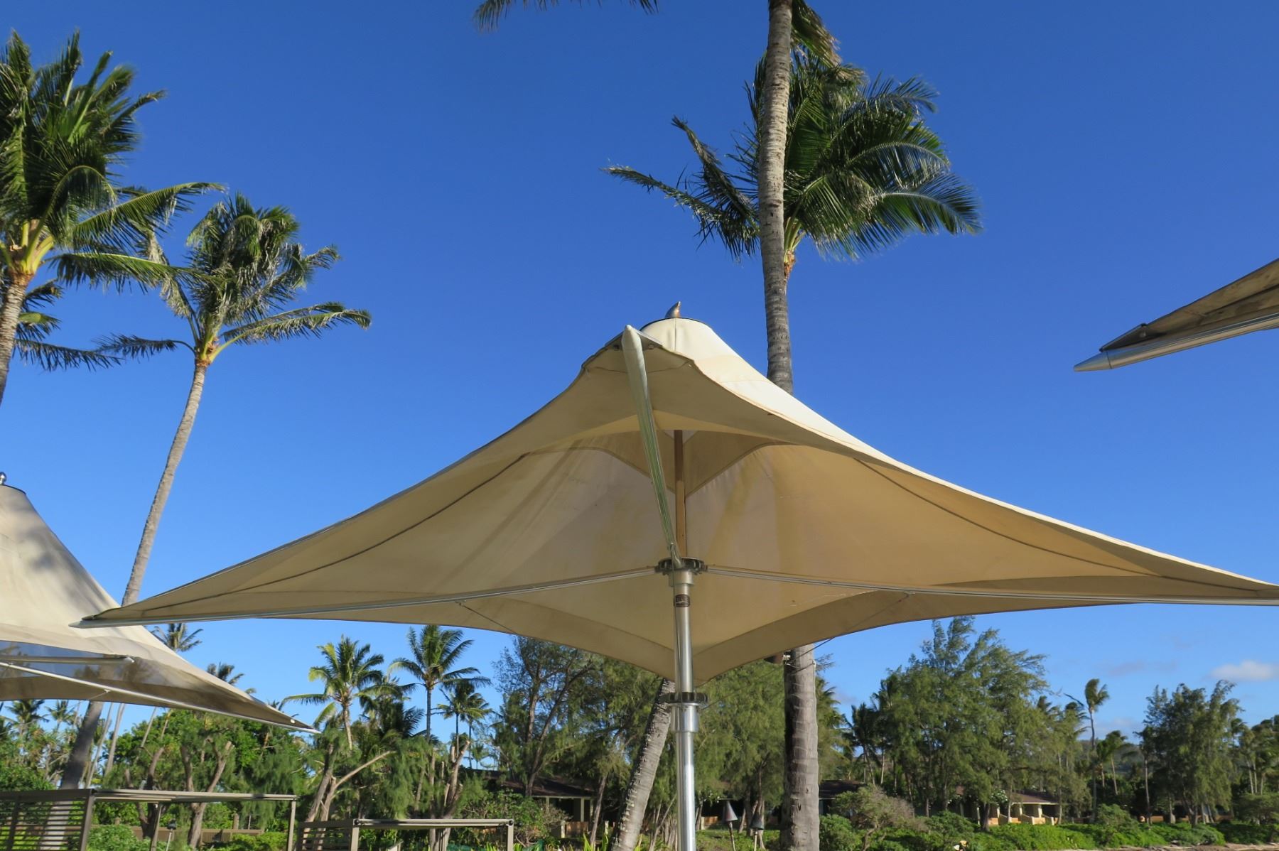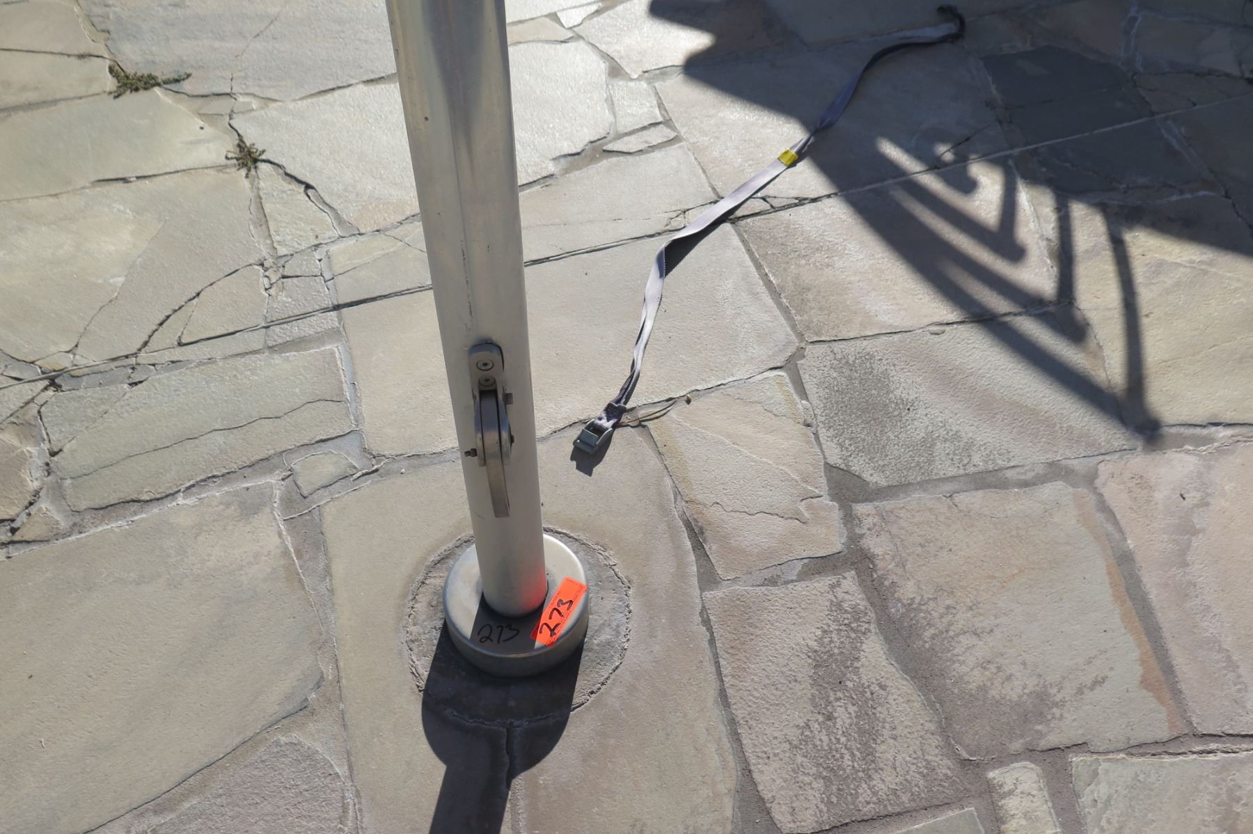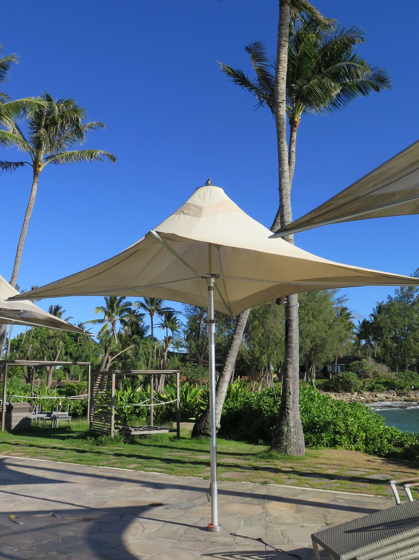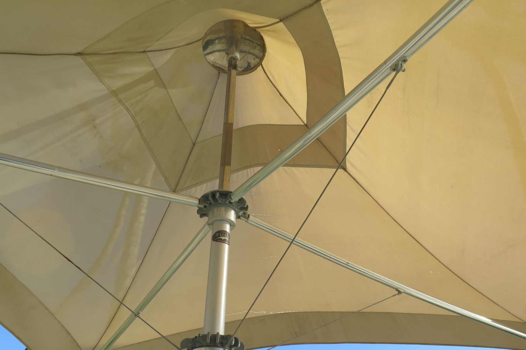 Large Tuuci Collapsible 4-Spoke Umbrella 161" Tall, Approx. 216" Across. Does not include crank to open up & fold down the umbrella. This umbrella has been unbolted and ready for transport.