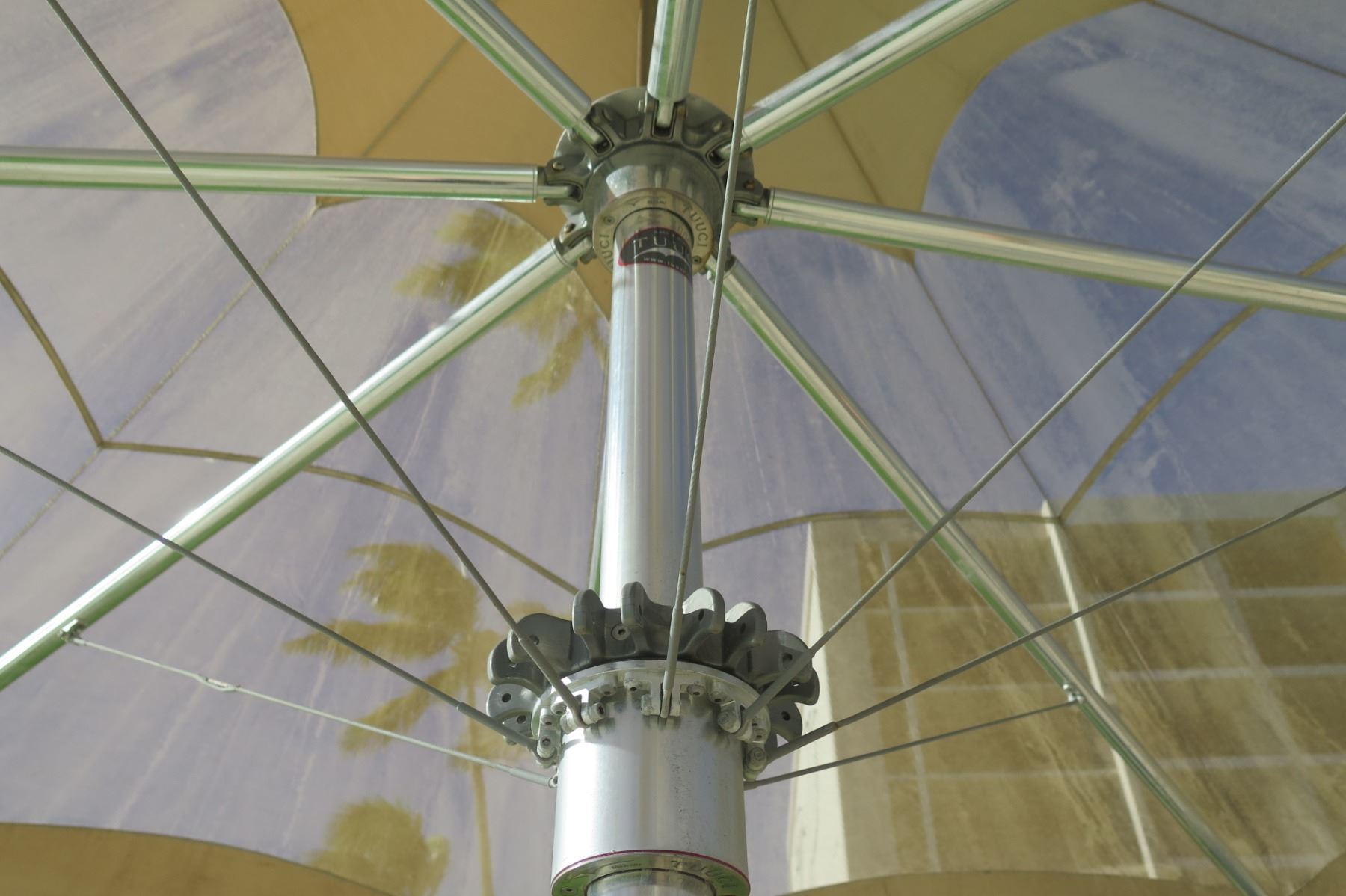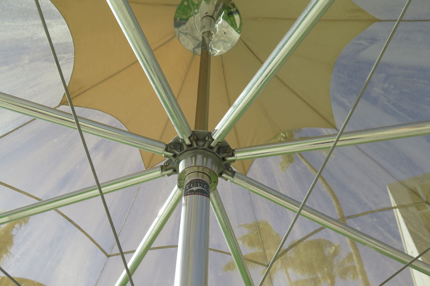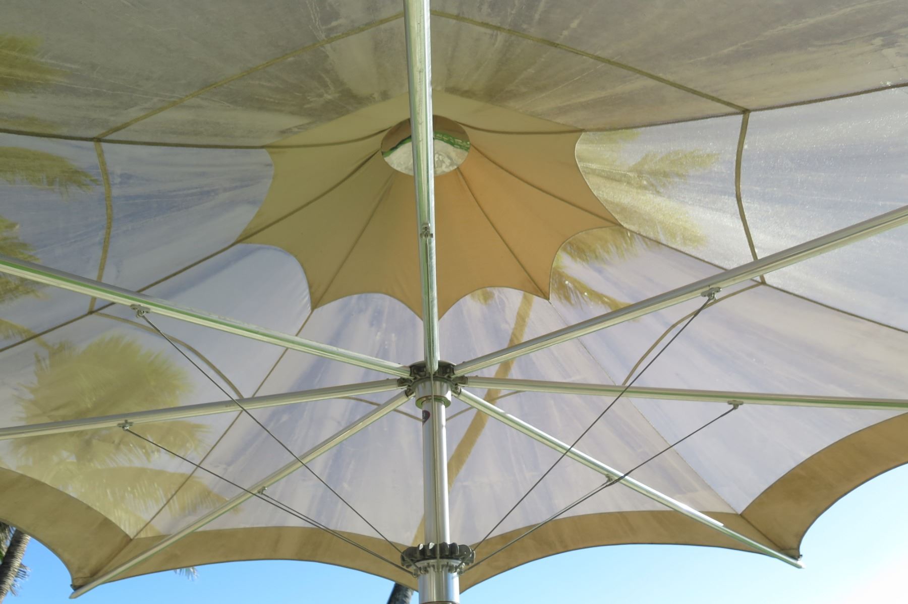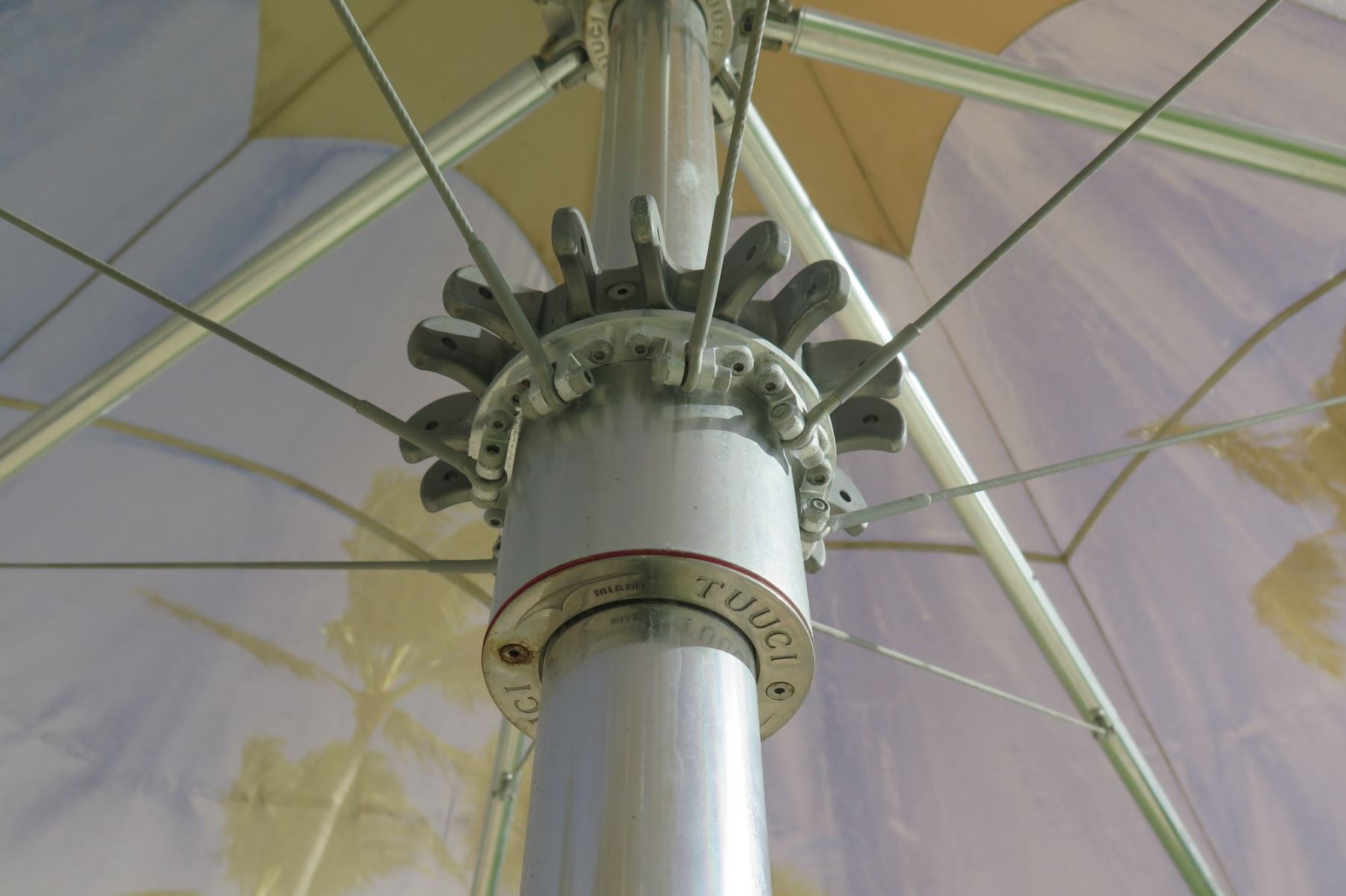 Large Tuuci Collapsible 8-Spoke Umbrella 156" Tall, Approx. 219" Across. Crank to open up & fold down the umbrella is not included. This umbrella has been unbolted and ready for transport.