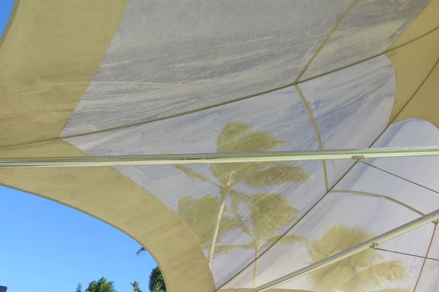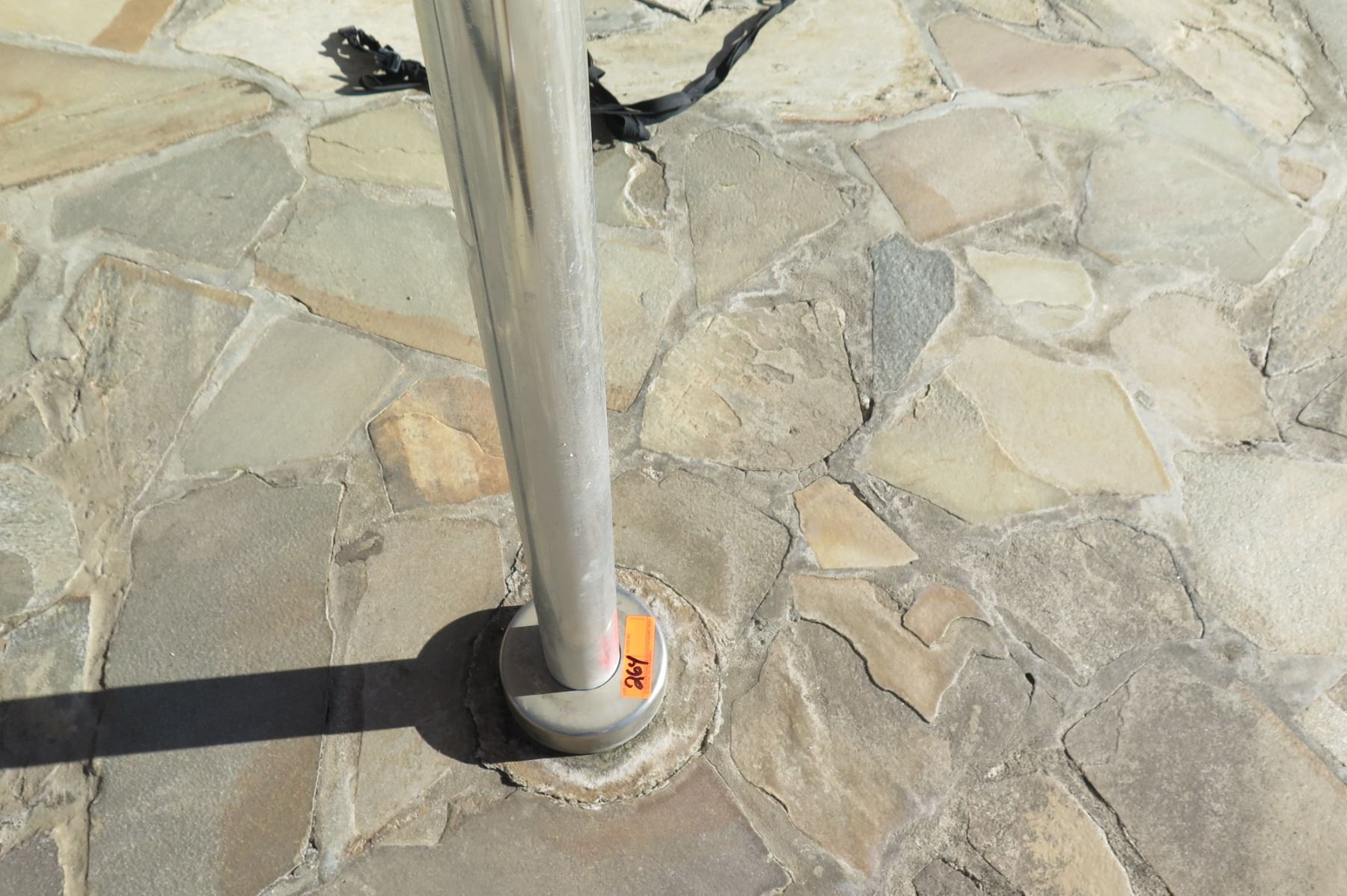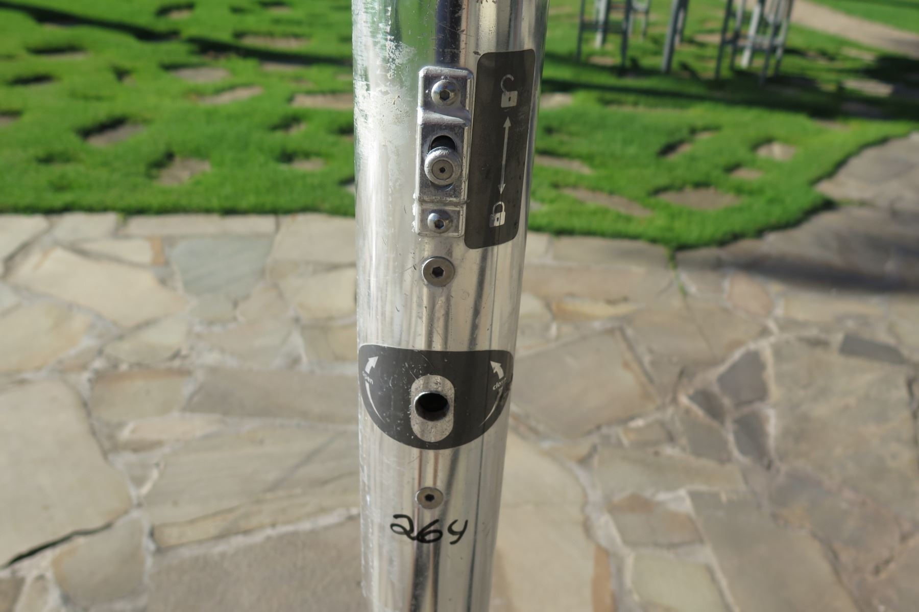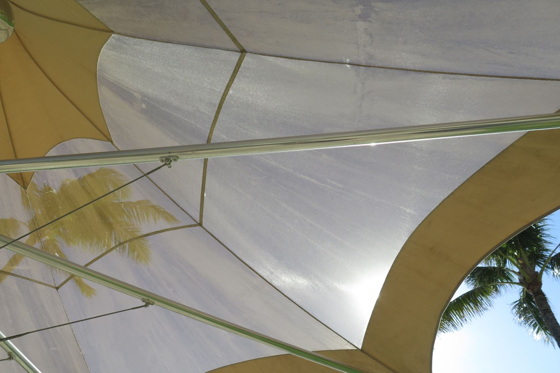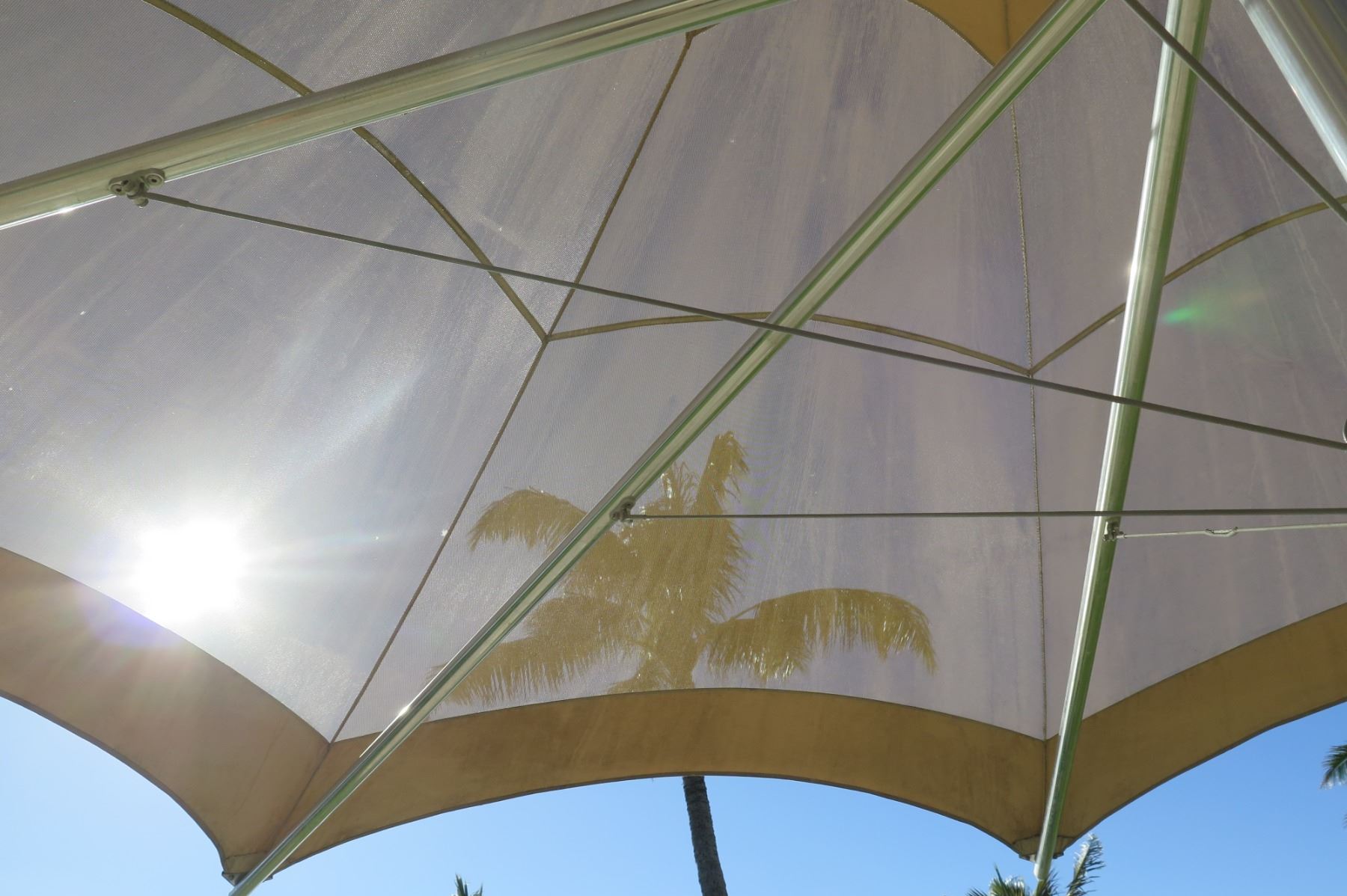 Large Tuuci Collapsible 8-Spoke Umbrella 156" Tall, Approx. 219" Across. Crank to open up & fold down the umbrella is not included. This umbrella has been unbolted and ready for transport.