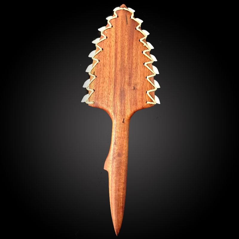 A traditional Hawaiian club that was carved and detailed by well-trained Habilitat residents. This piece of art is 19 1/2" by 7" and has 16 real Tiger shark teeth that has been secured into place on authentic Koa wood.