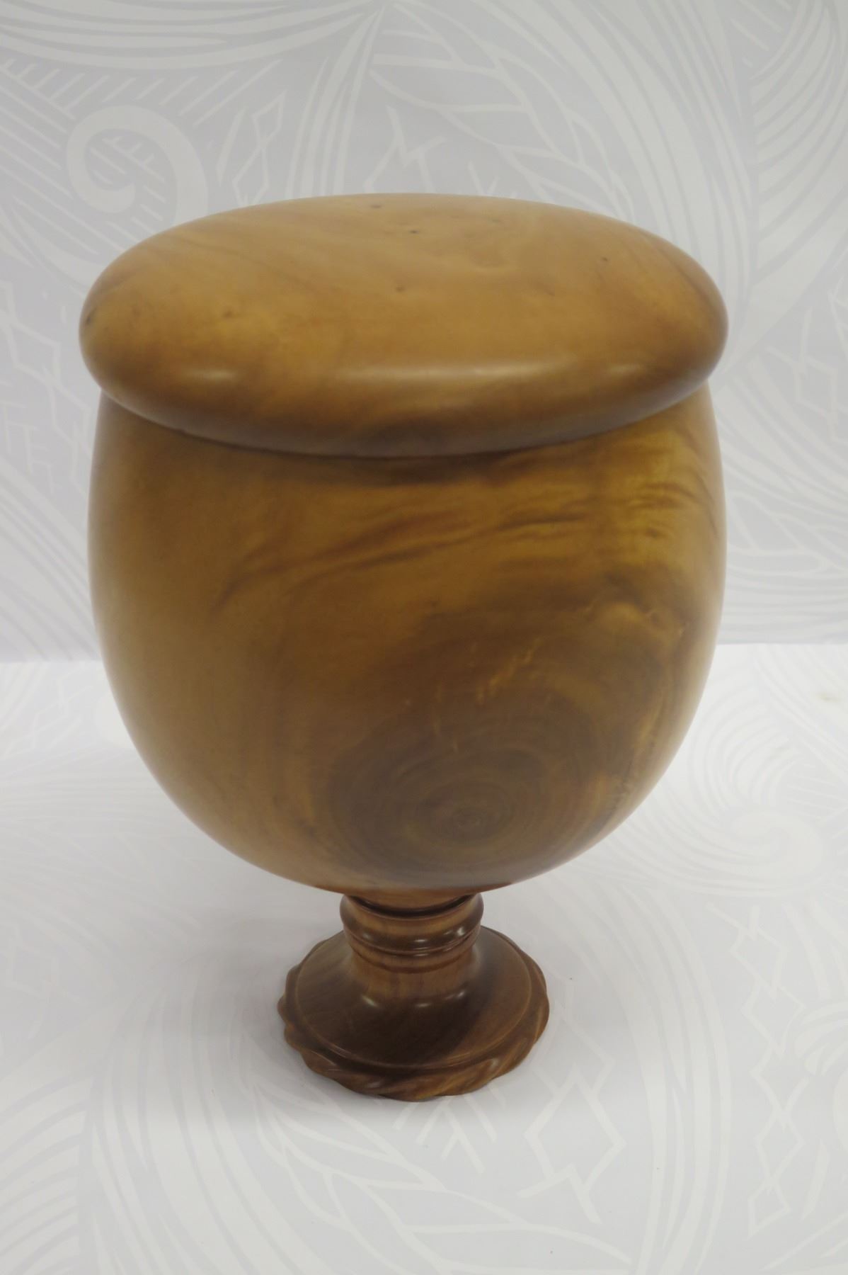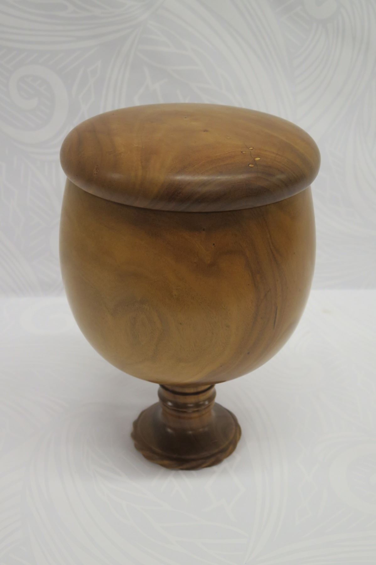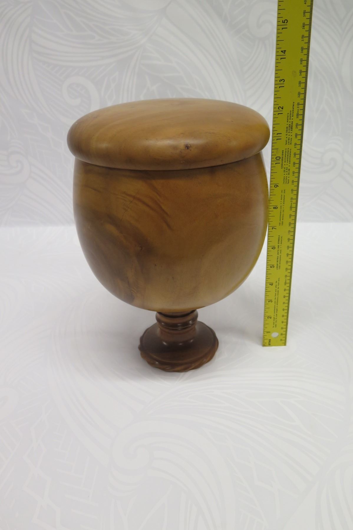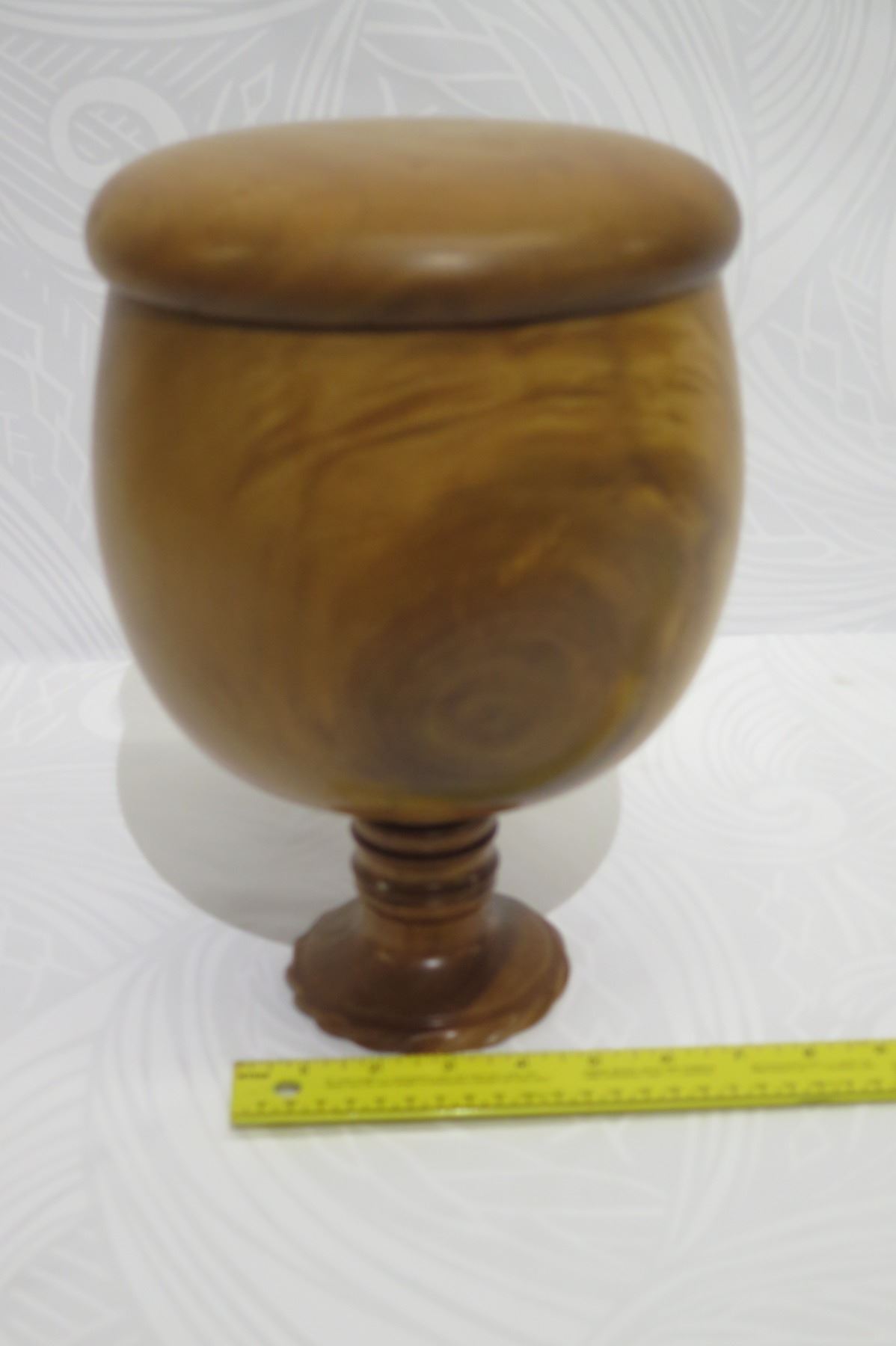 Lidded Milo Wood Bowl on Carved Pedestal Base, Artist Kimo Austin, Approx. 7.5" Dia (lid top), 11.5"