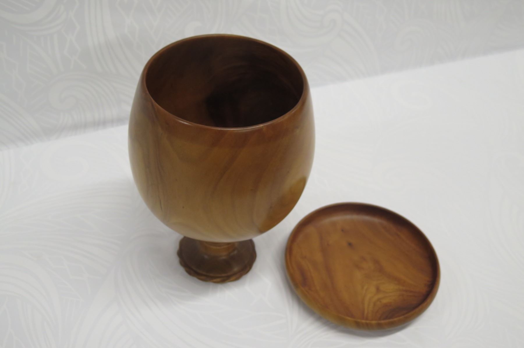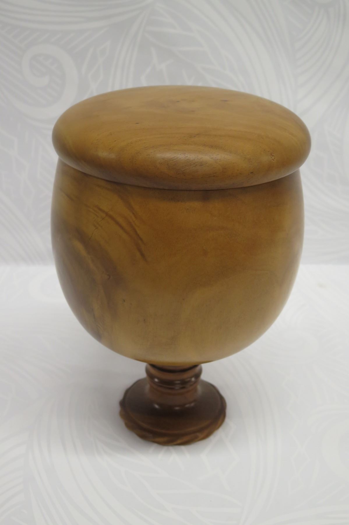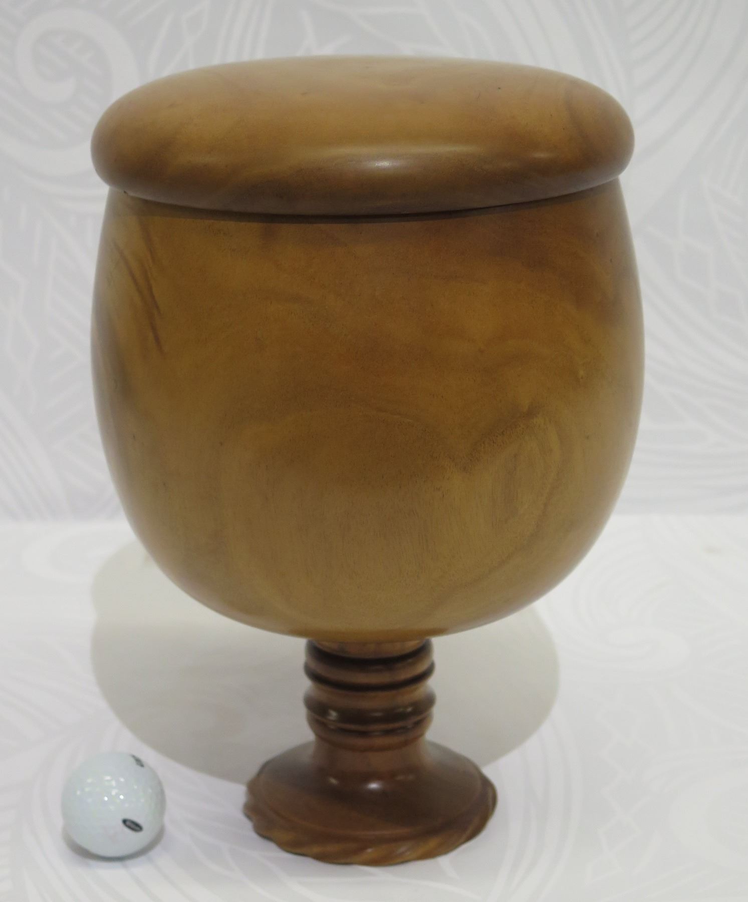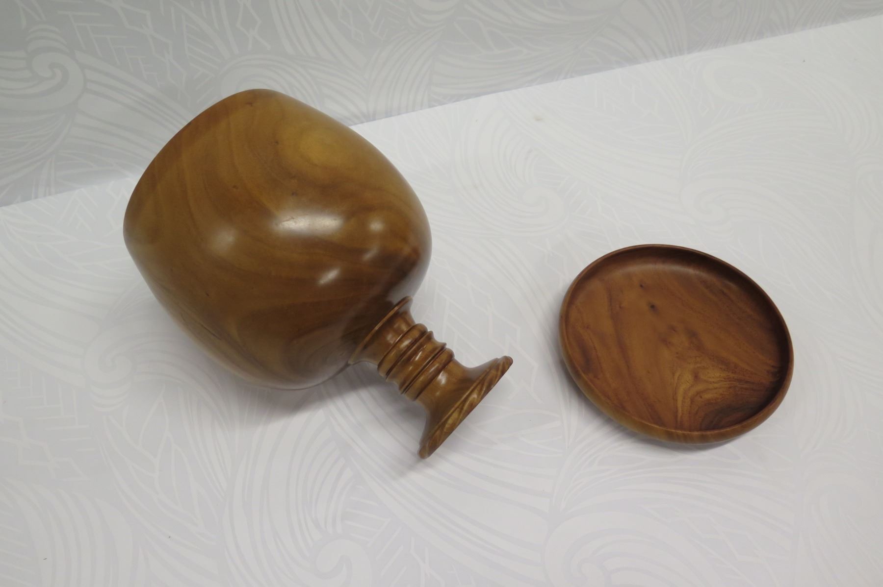 Lidded Milo Wood Bowl on Carved Pedestal Base, Artist Kimo Austin, Approx. 7.5" Dia (lid top), 11.5"