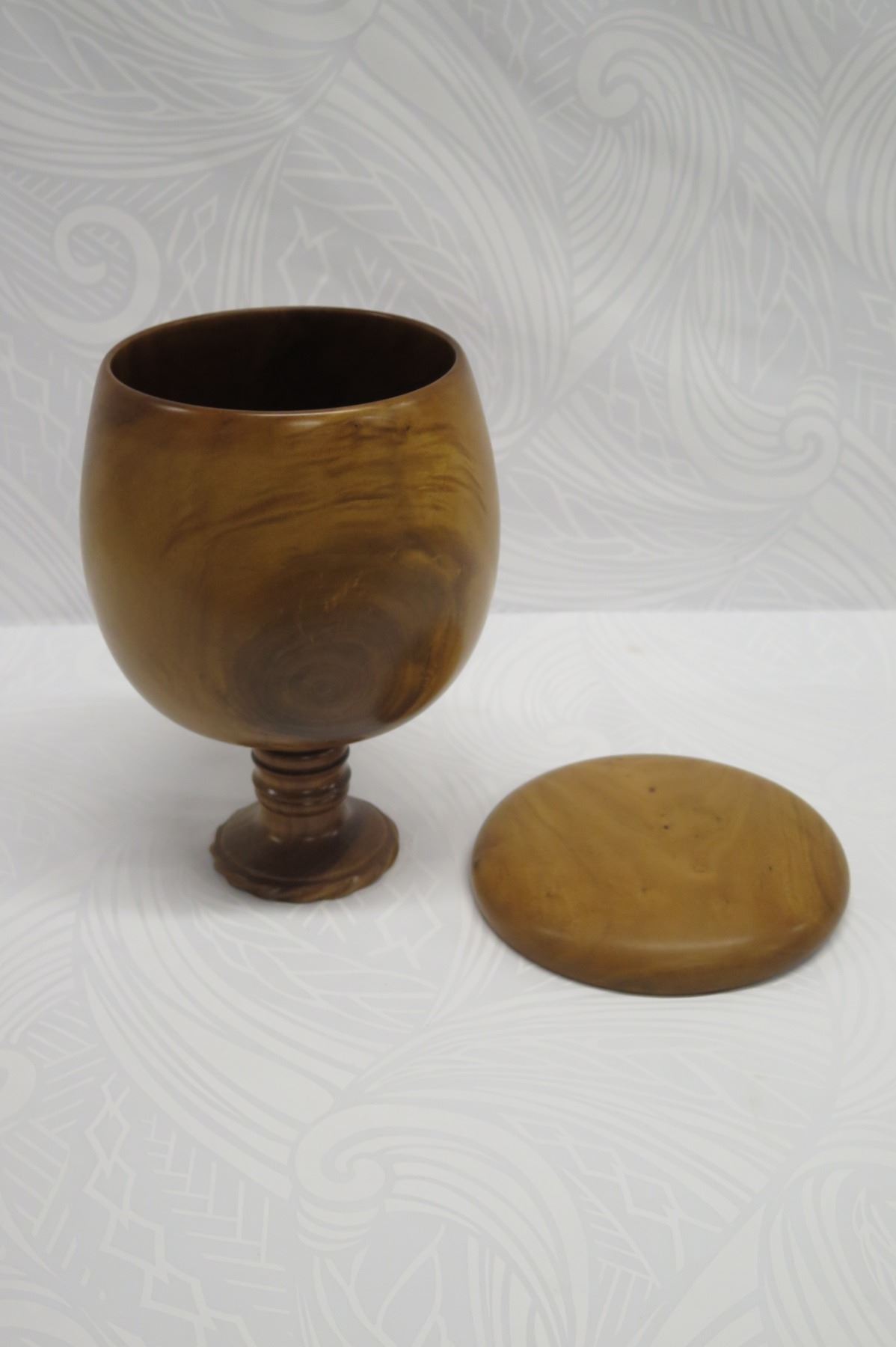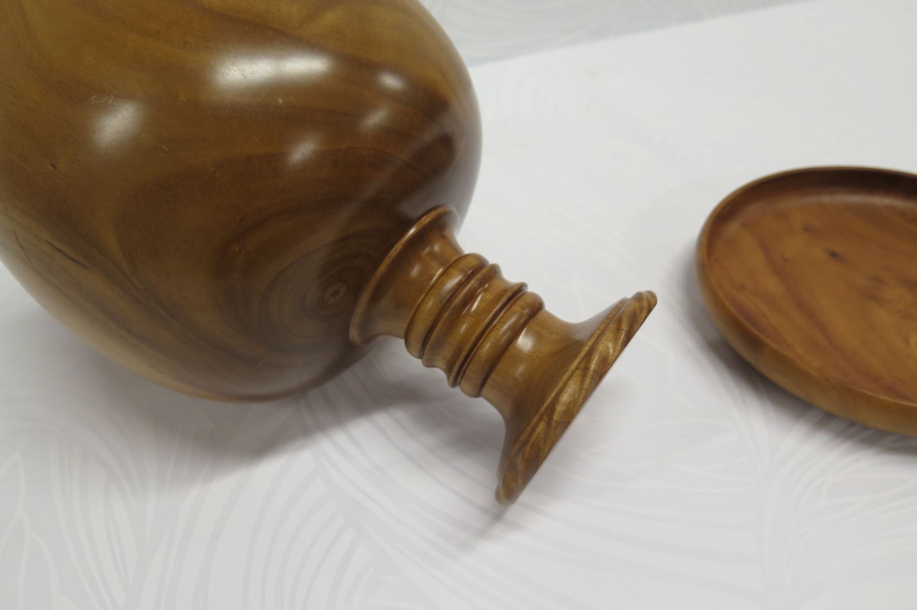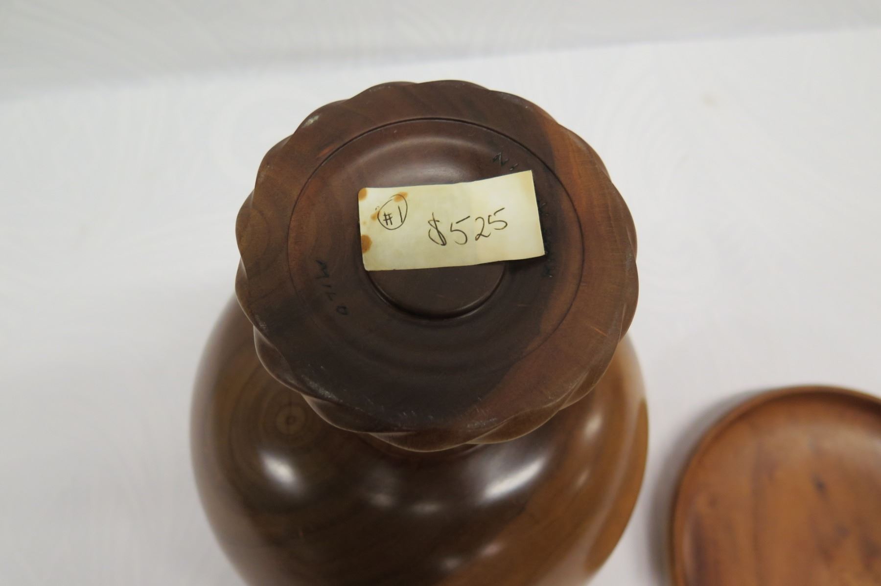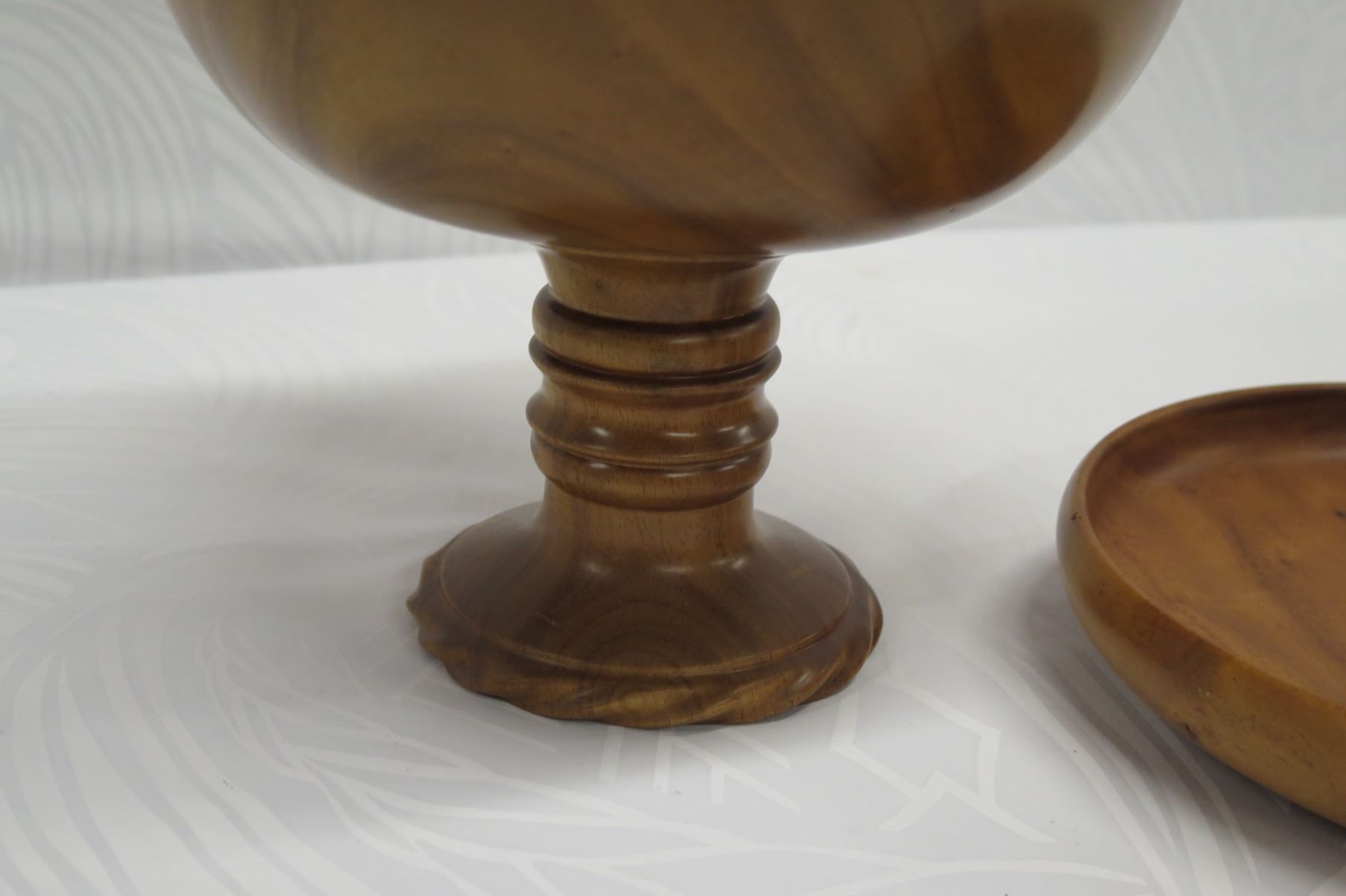 Lidded Milo Wood Bowl on Carved Pedestal Base, Artist Kimo Austin, Approx. 7.5" Dia (lid top), 11.5"