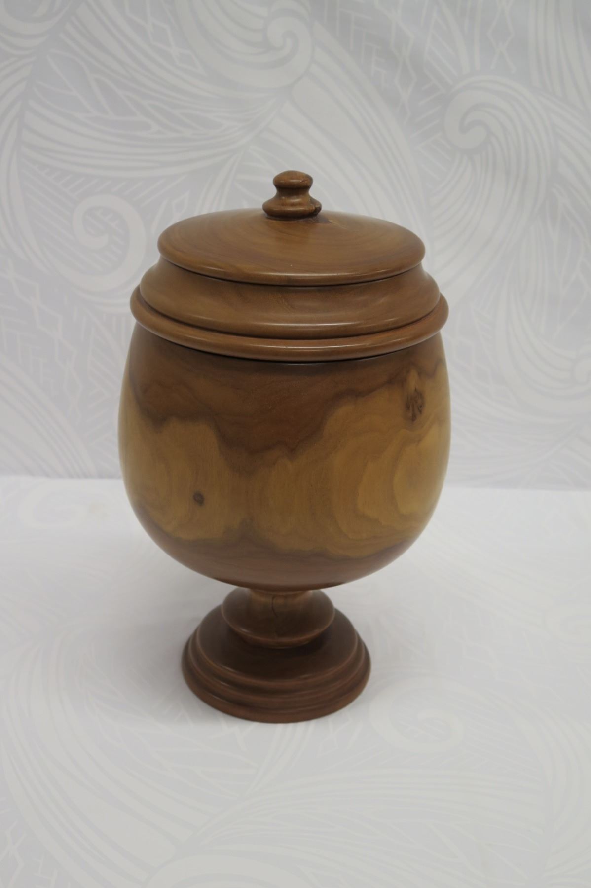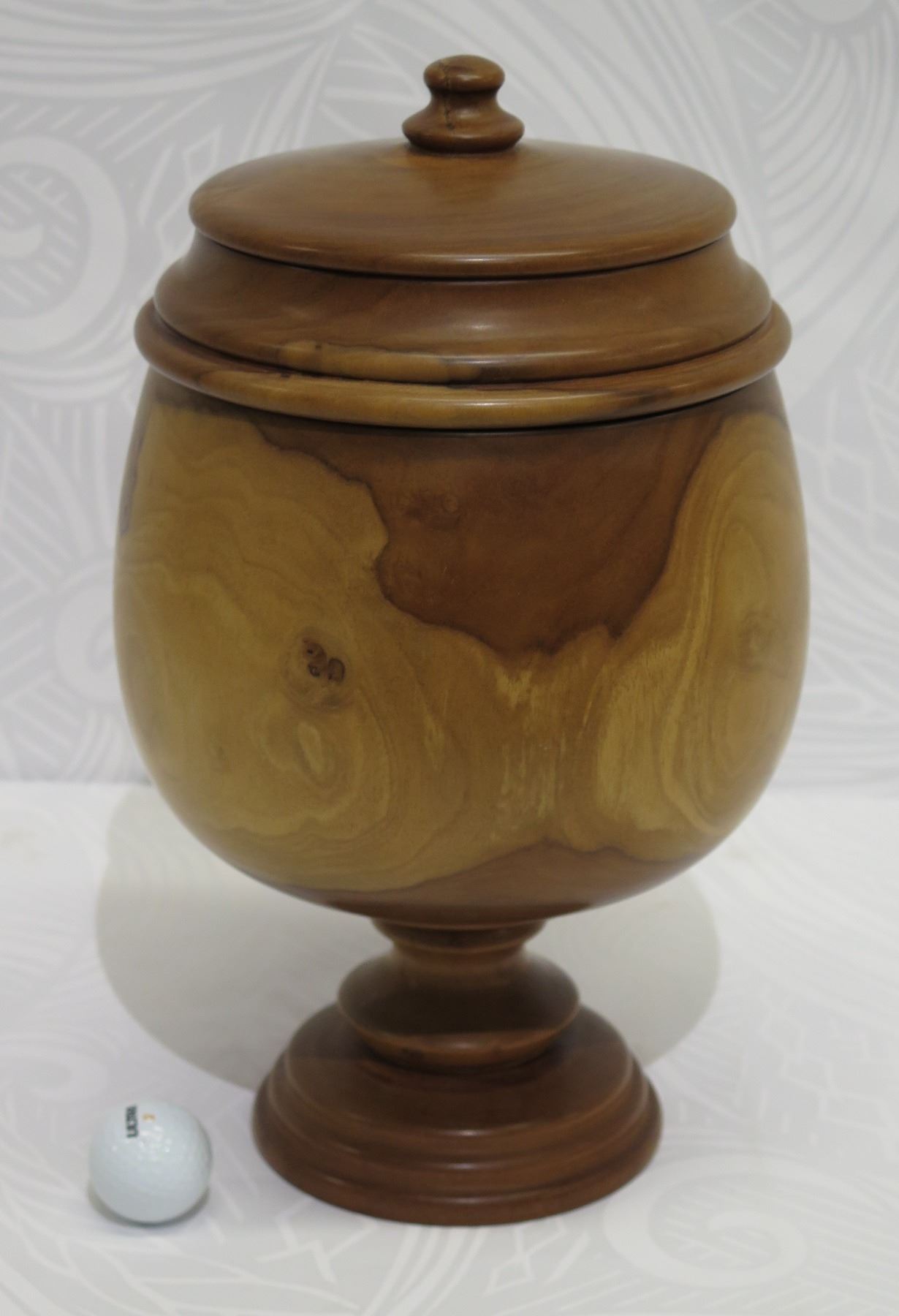 Lidded Milo Wood Bowl on Pedestal Base, Artist Kapahikaua "Kaneohe, HI", Approx. 8" Dia, 15." Tall