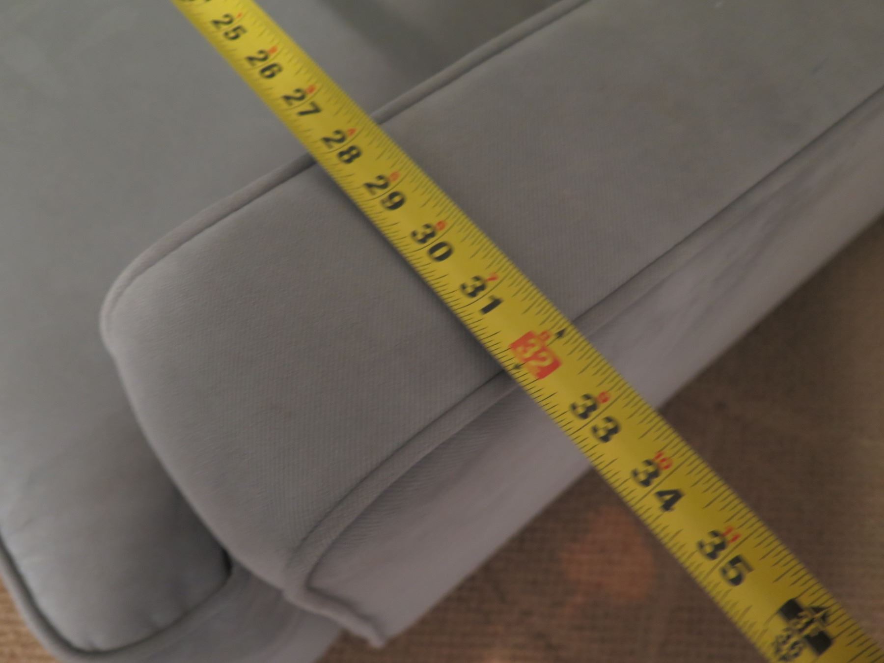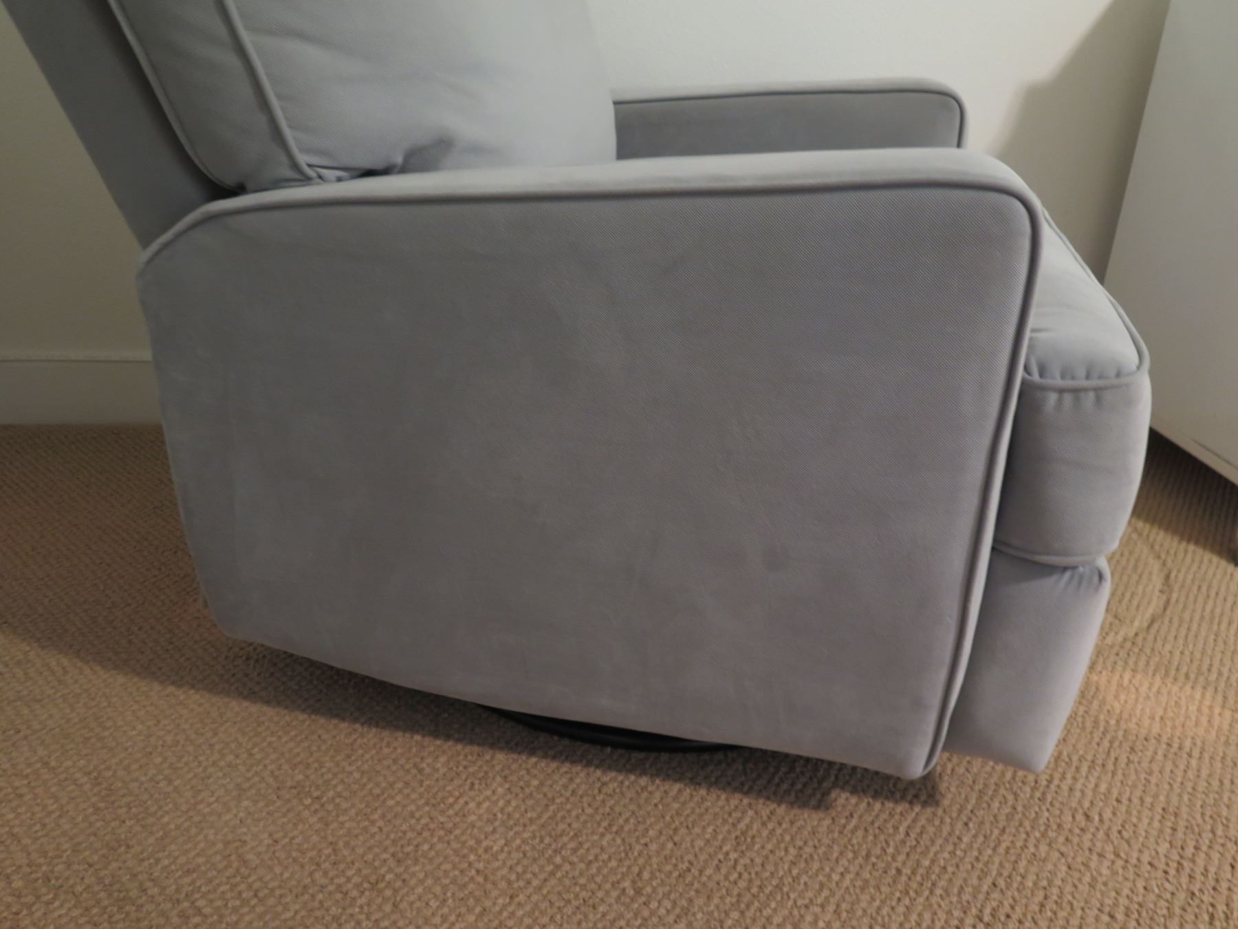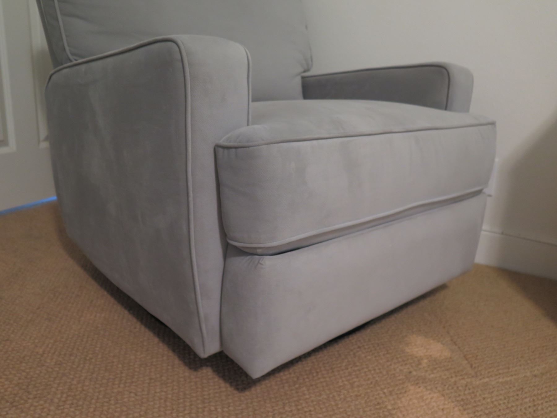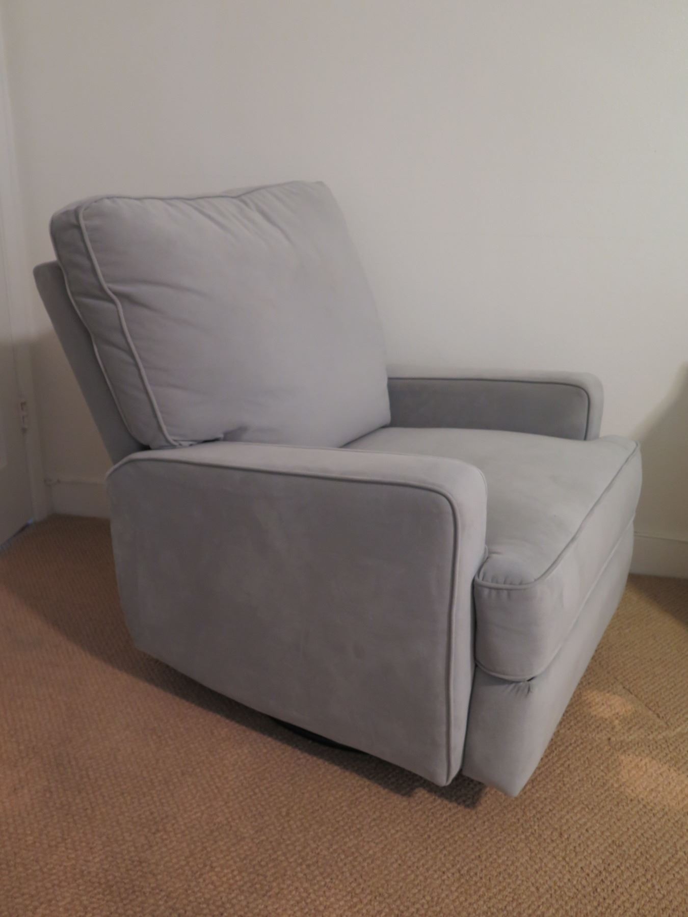 Light Gray Recliner 32"W, 21.5"D, 38" Back Ht. Seller reports that two screws that keep the metal brackets secured to the back of the wood backing of the seat are stripped causing the chair to be a little lopsided when there's pressure from someone heavy leaning back, causing the screws to pop out. As long as the screws stay in the holes, the chair works fine.