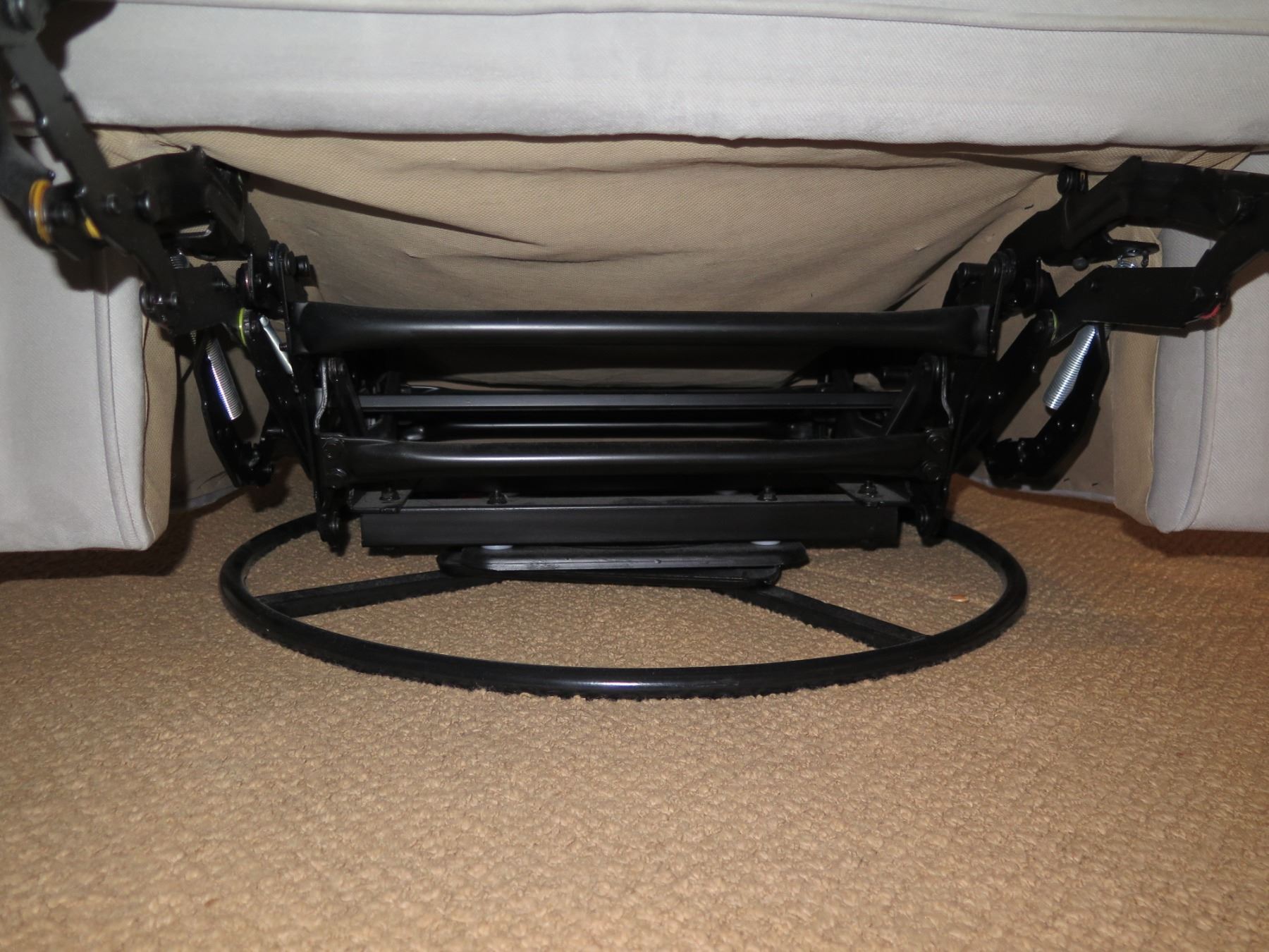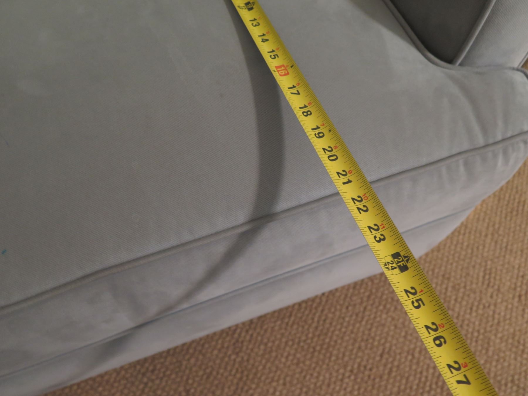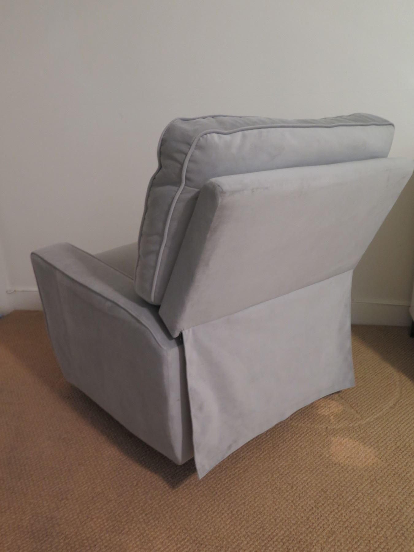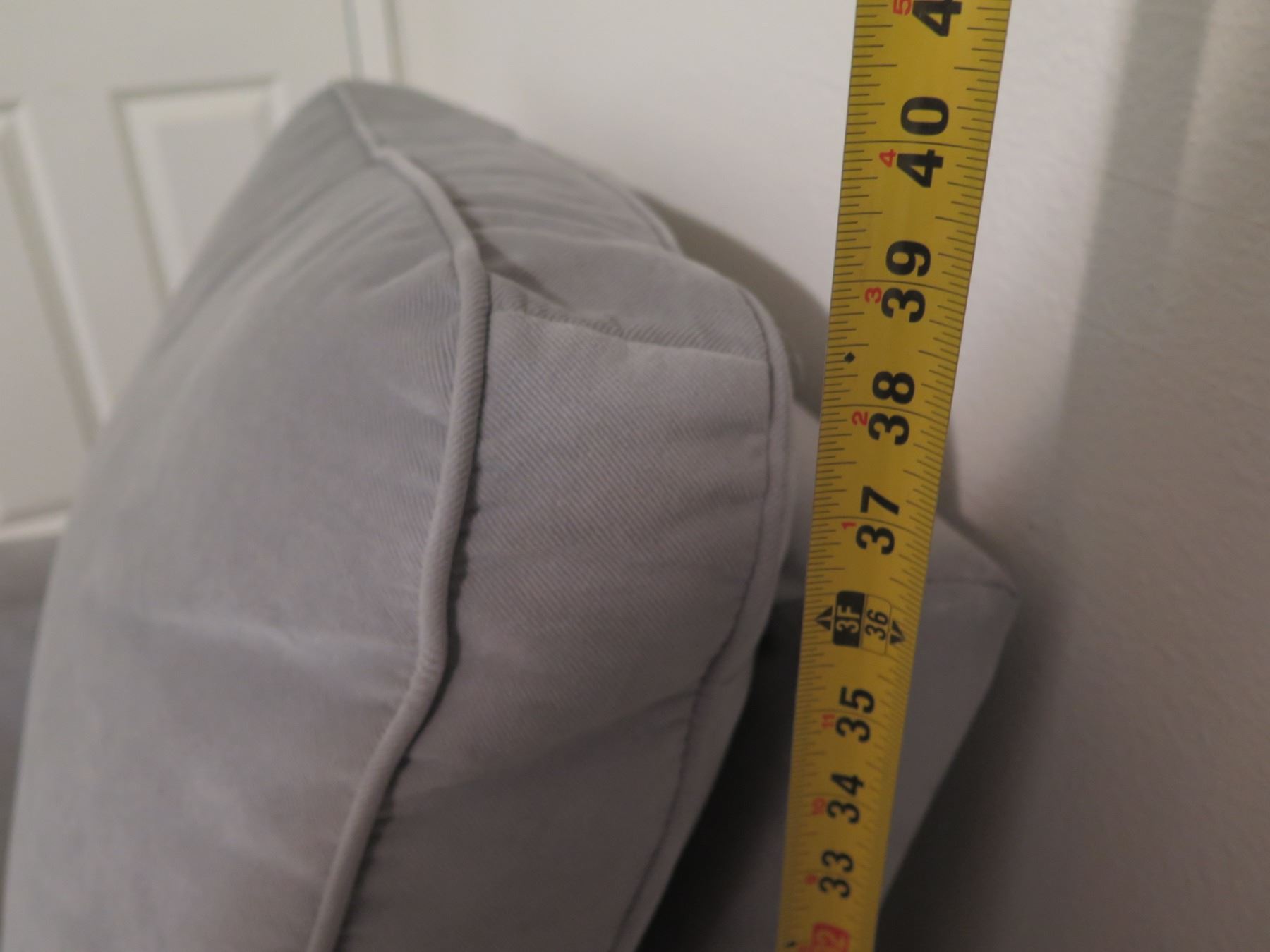 Light Gray Recliner 32"W, 21.5"D, 38" Back Ht. Seller reports that two screws that keep the metal brackets secured to the back of the wood backing of the seat are stripped causing the chair to be a little lopsided when there's pressure from someone heavy leaning back, causing the screws to pop out. As long as the screws stay in the holes, the chair works fine.