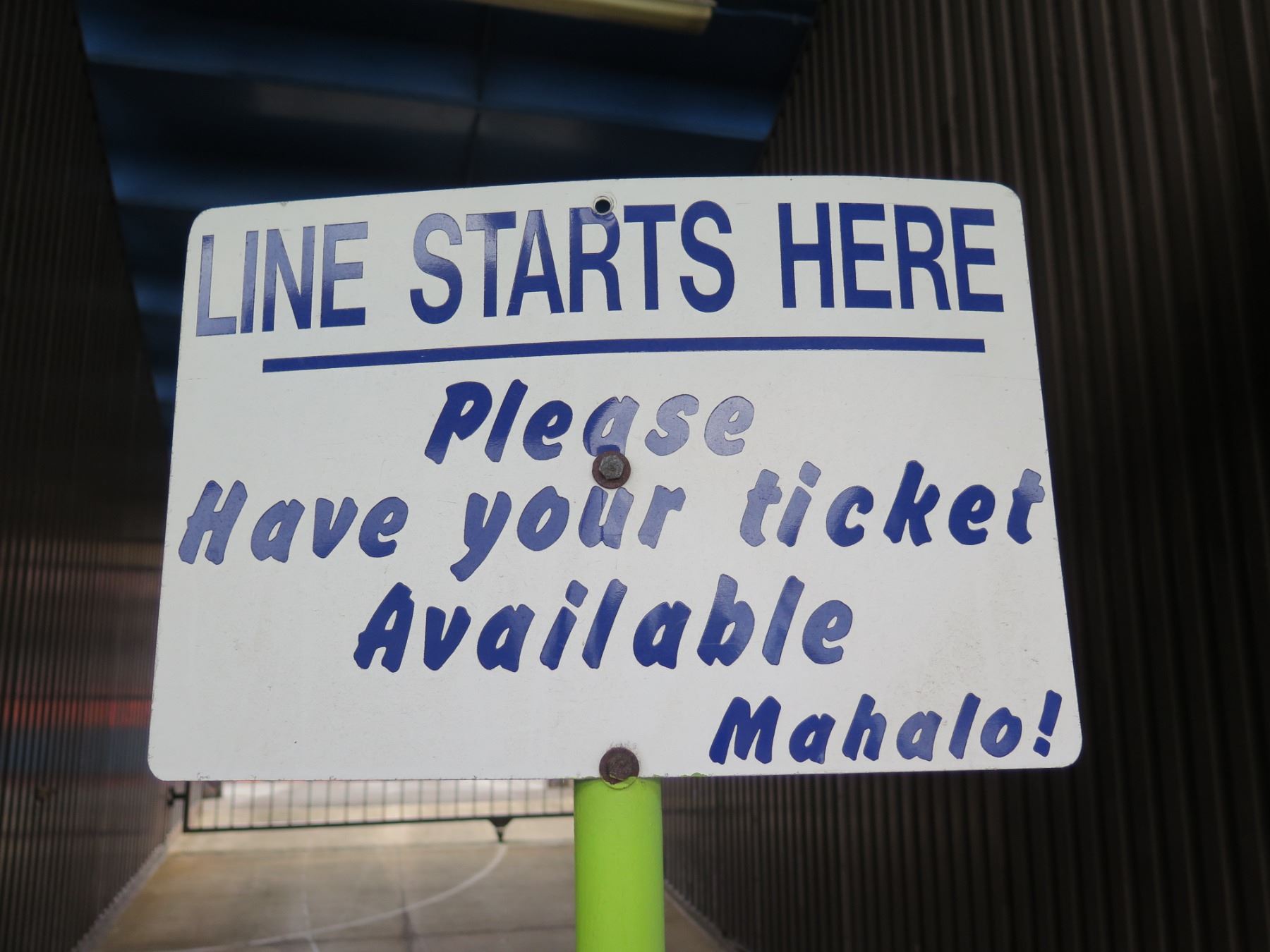 Line Starts Here Sign, Please Have Your Ticket Available Mahalo! 18"x12". Note: Signs will be removed if hanging prior to pick up