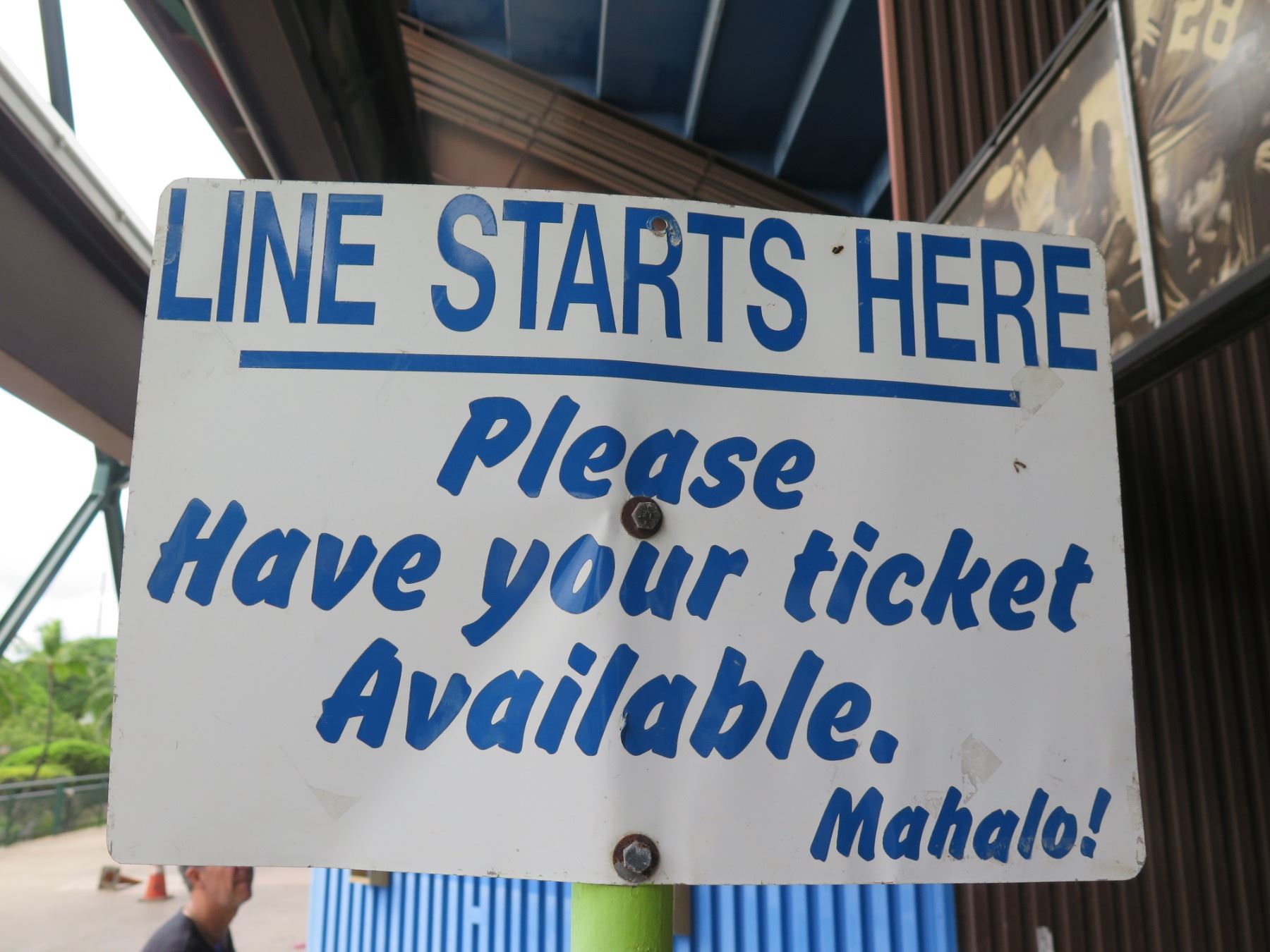 Line Starts Here Sign, Please Have Your Ticket Available Mahalo! 18"x12". Note: Signs will be removed if hanging prior to pick up