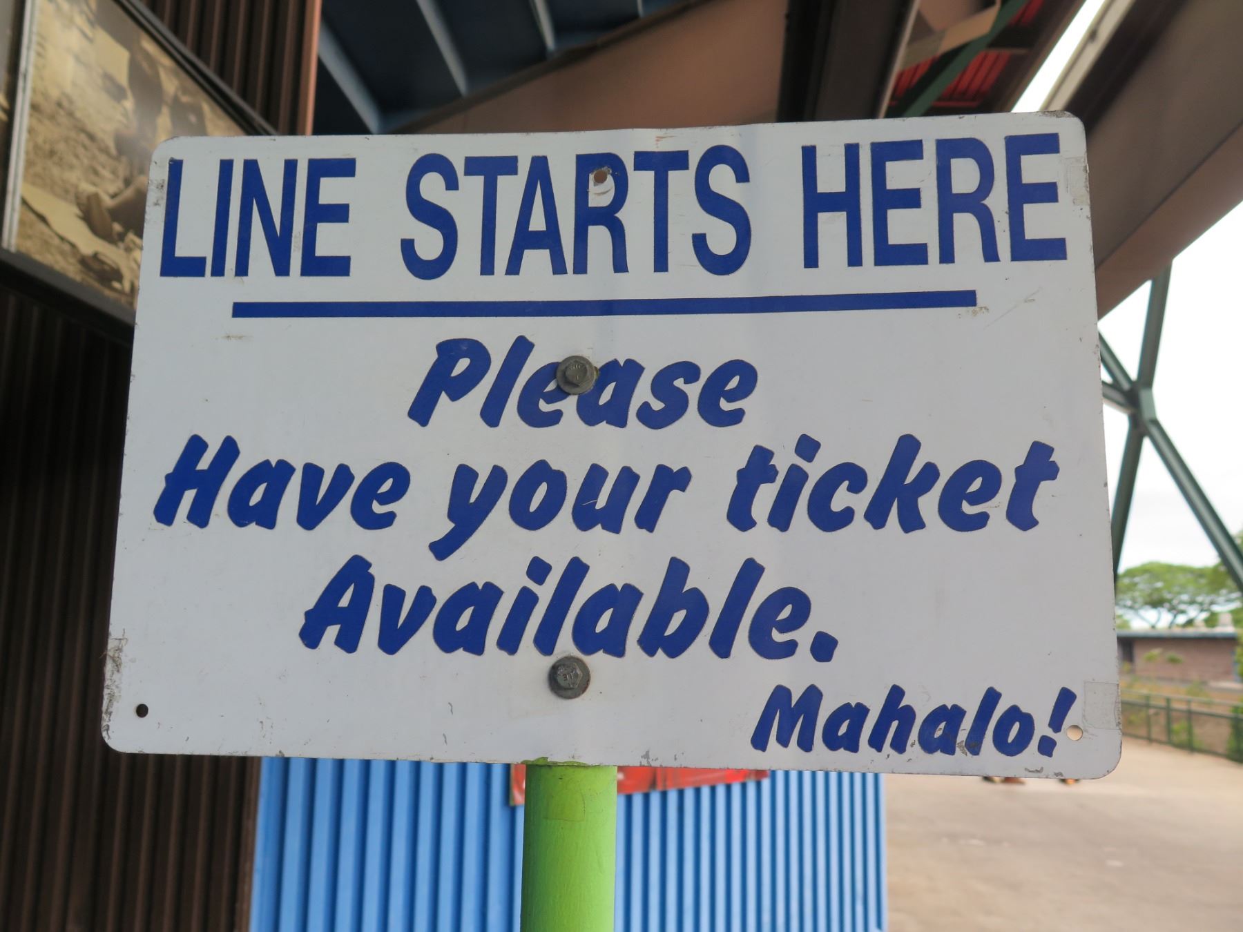 Line Starts Here Sign, Please Have Your Ticket Available Mahalo! 18"x12". Note: Signs will be removed if hanging prior to pick up