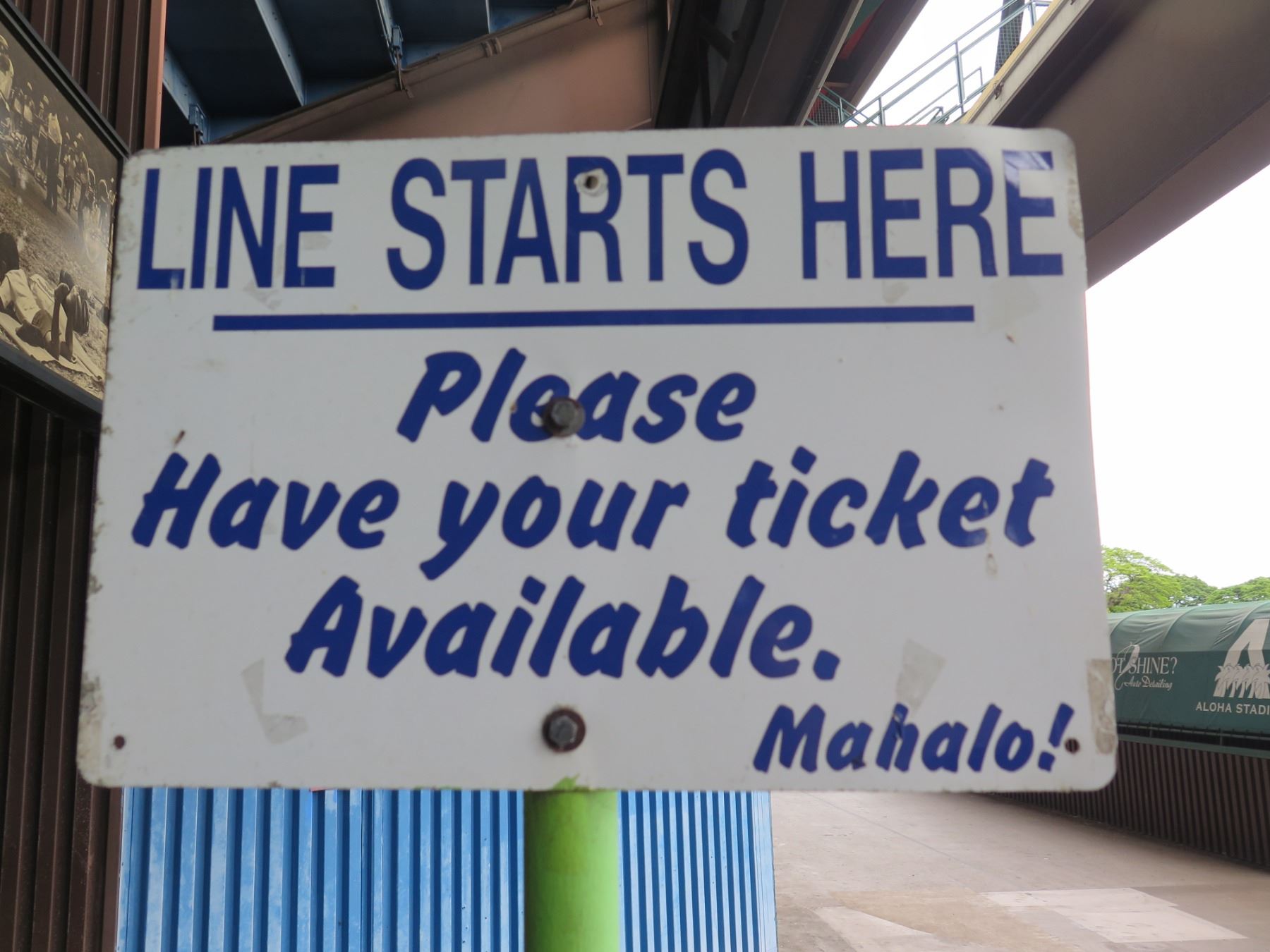 Line Starts Here Sign, Please Have Your Ticket Available Mahalo! 18"x12". Note: Signs will be removed if hanging prior to pick up