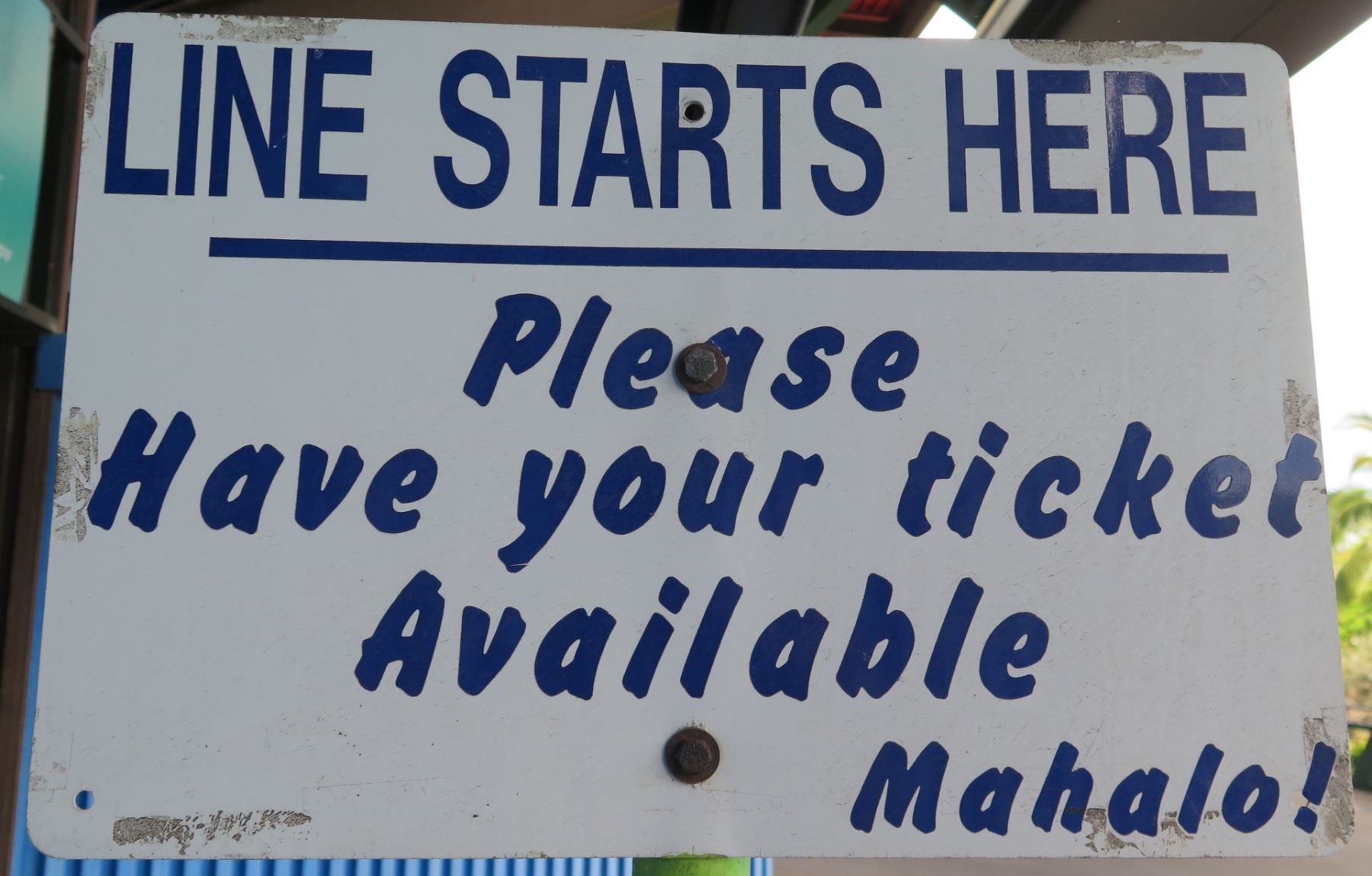 Line Starts Here Sign, Please Have Your Ticket Available. Mahalo! 18"x12"