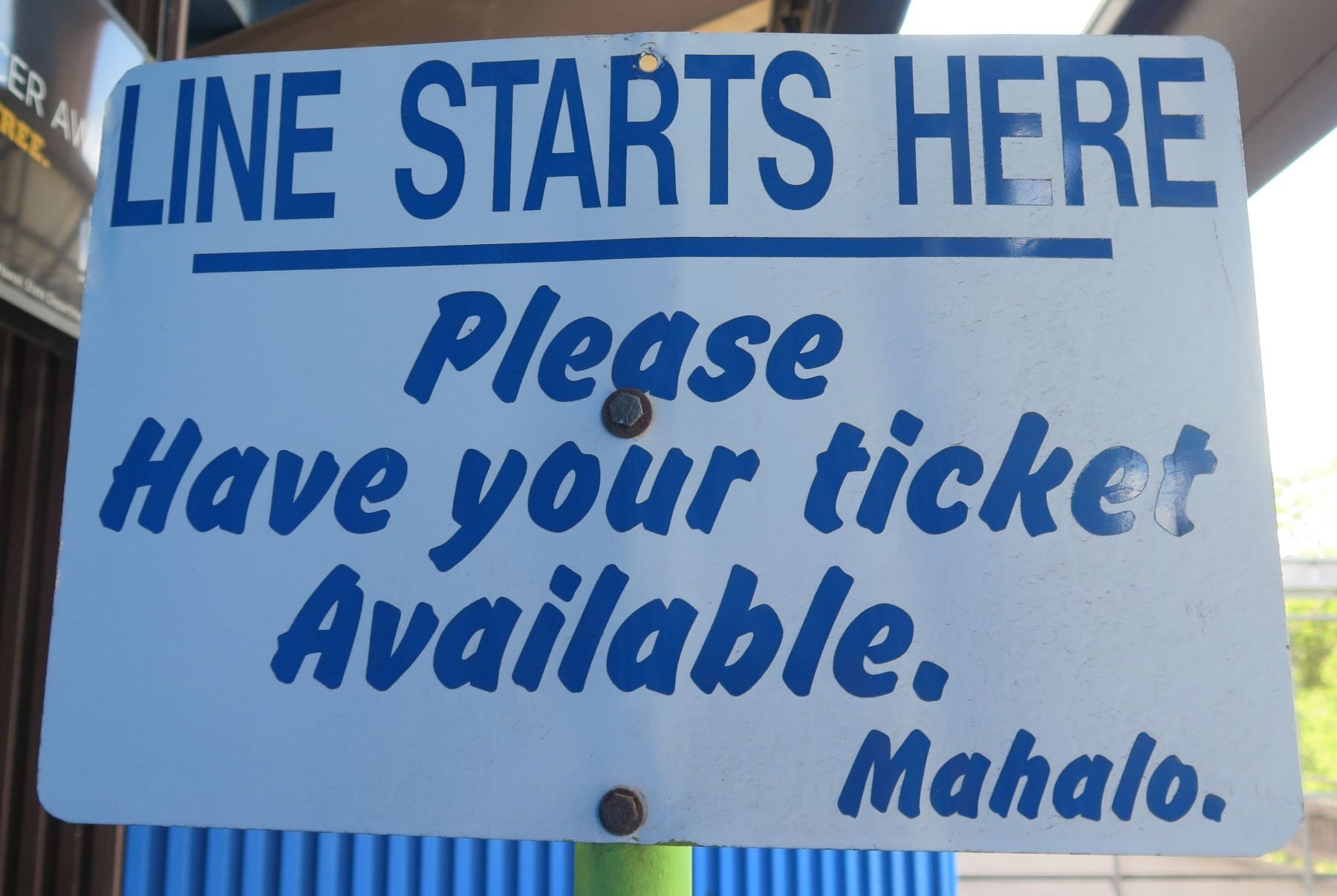 Line Starts Here Sign, Please Have Your Ticket Available. Mahalo! 18"x12"