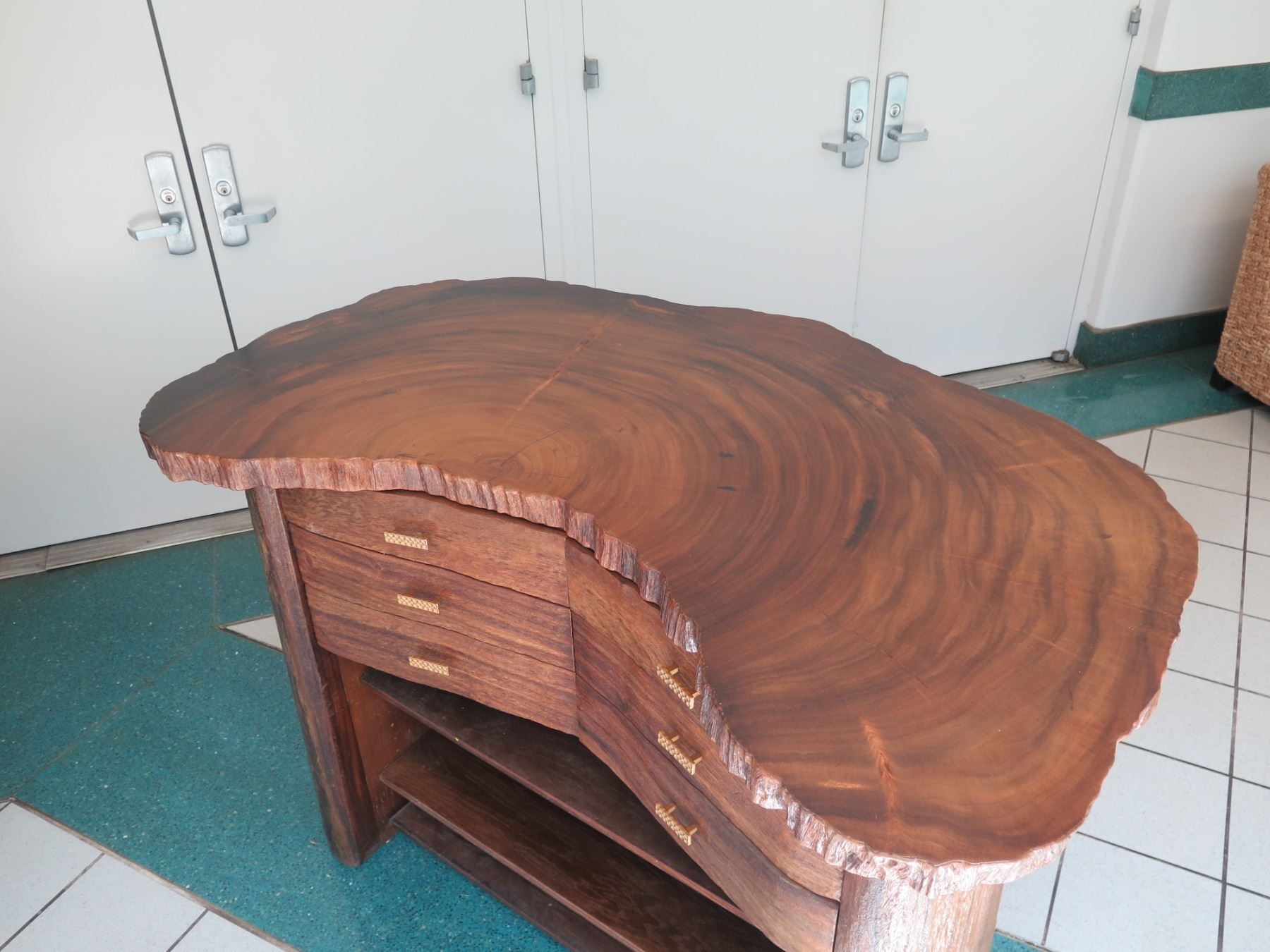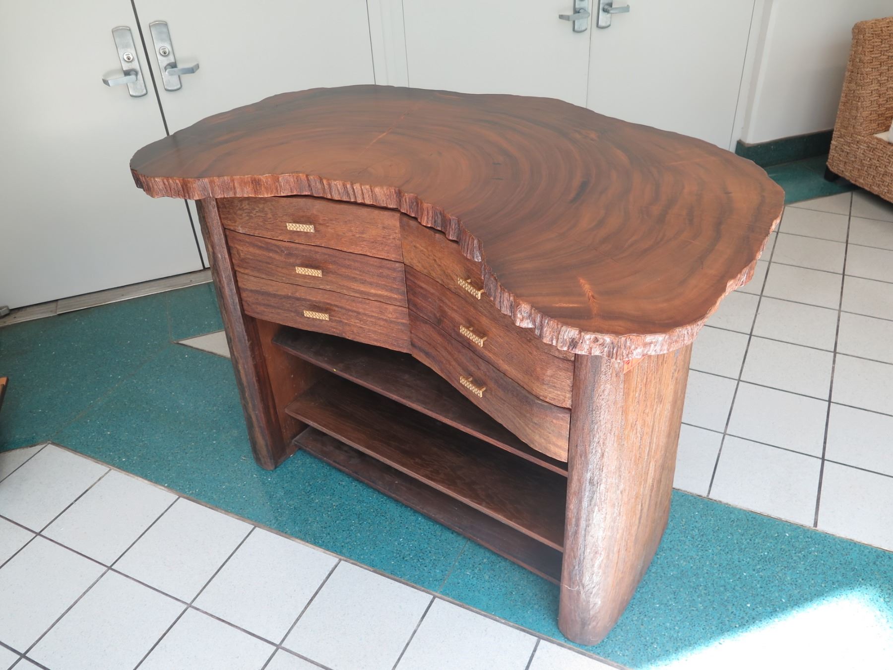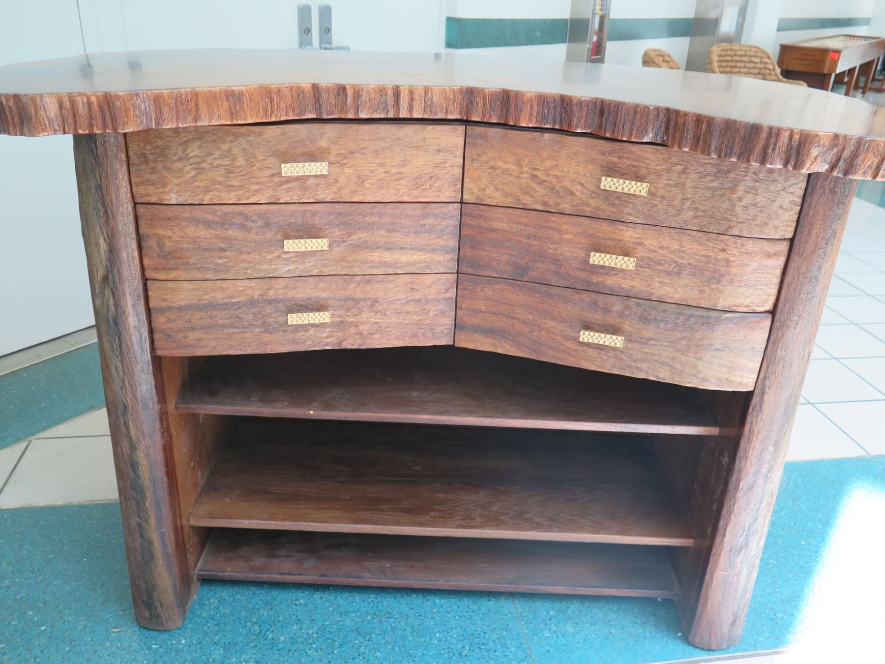 Live Edge Solid Wood Bar w/ Drawers & Shelving on Reverse, 62"x29"x42"H