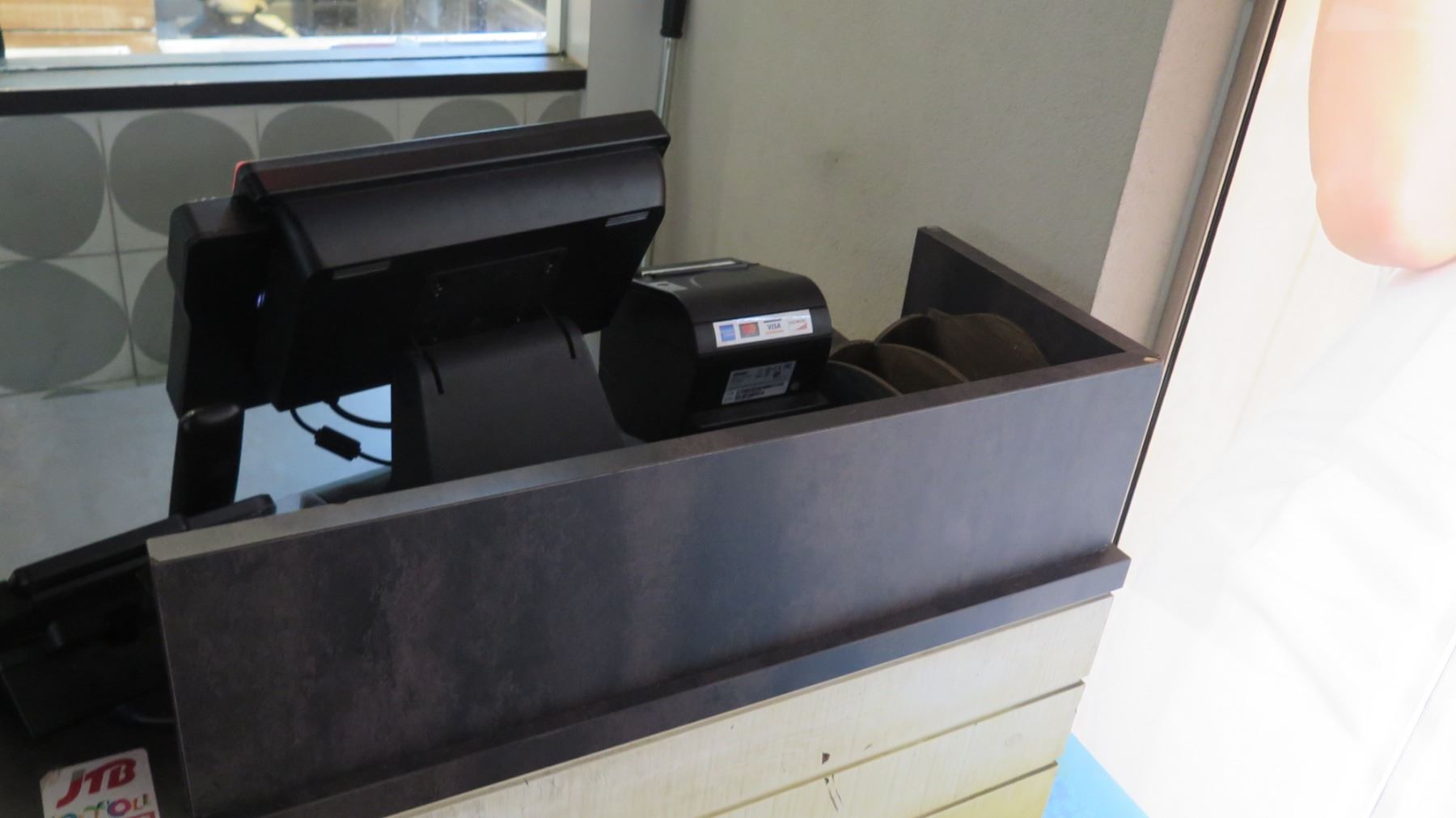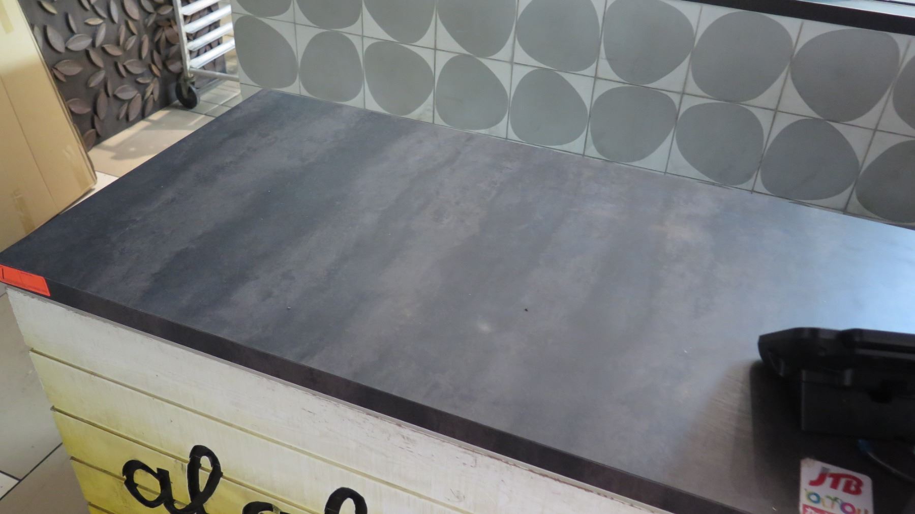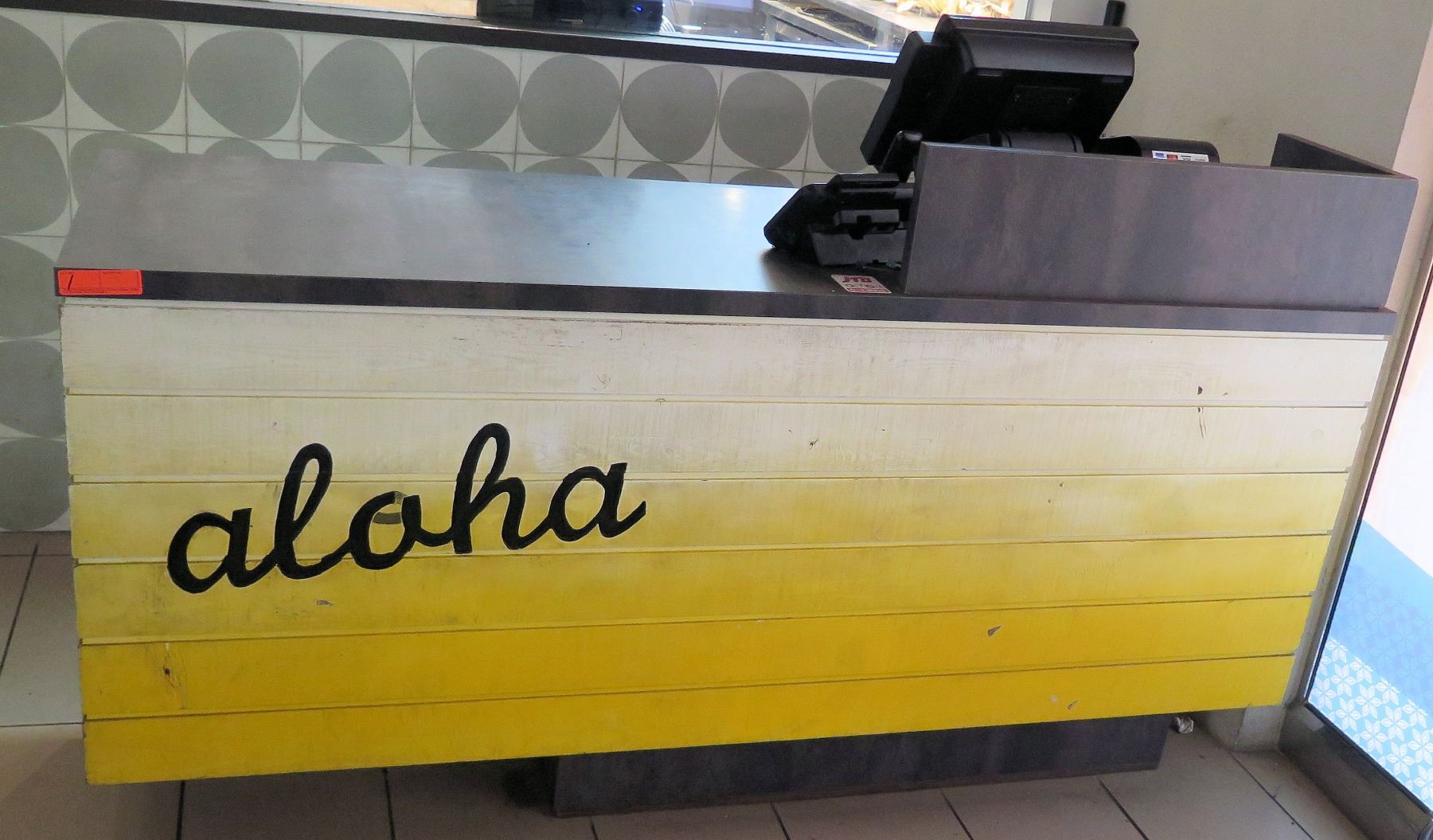 Long Wooden Customer Service Counter w/ Shelves & Aloha Painted 73"Lx24"Dx36"H