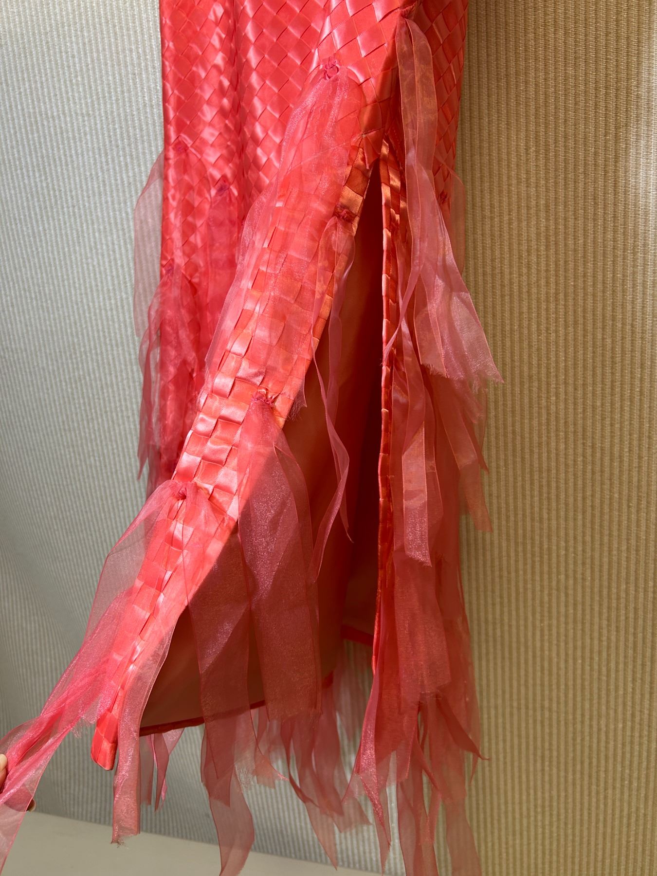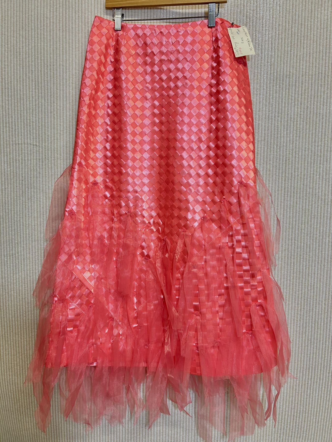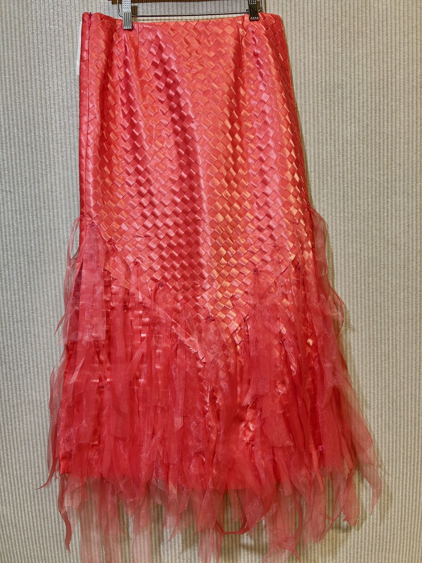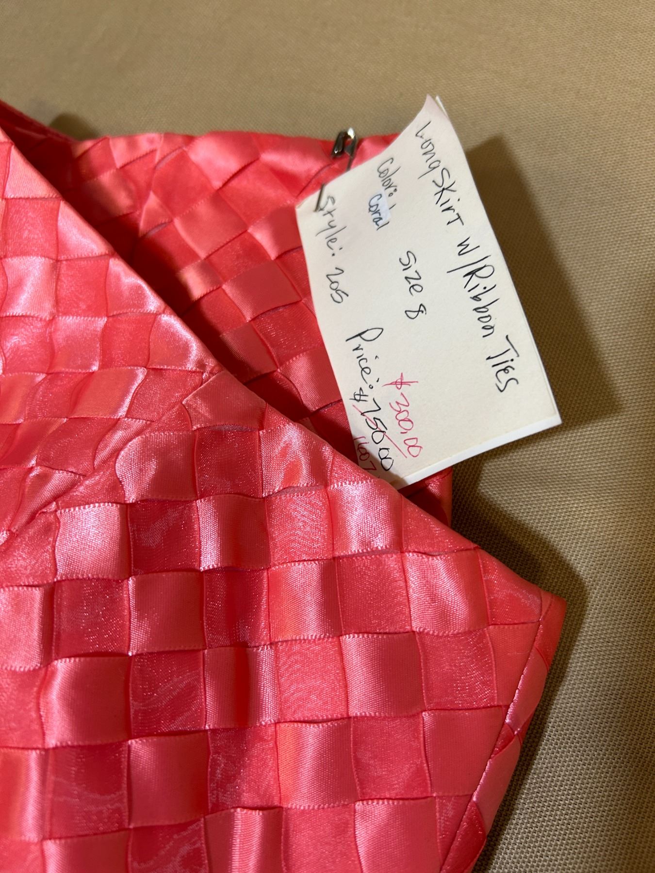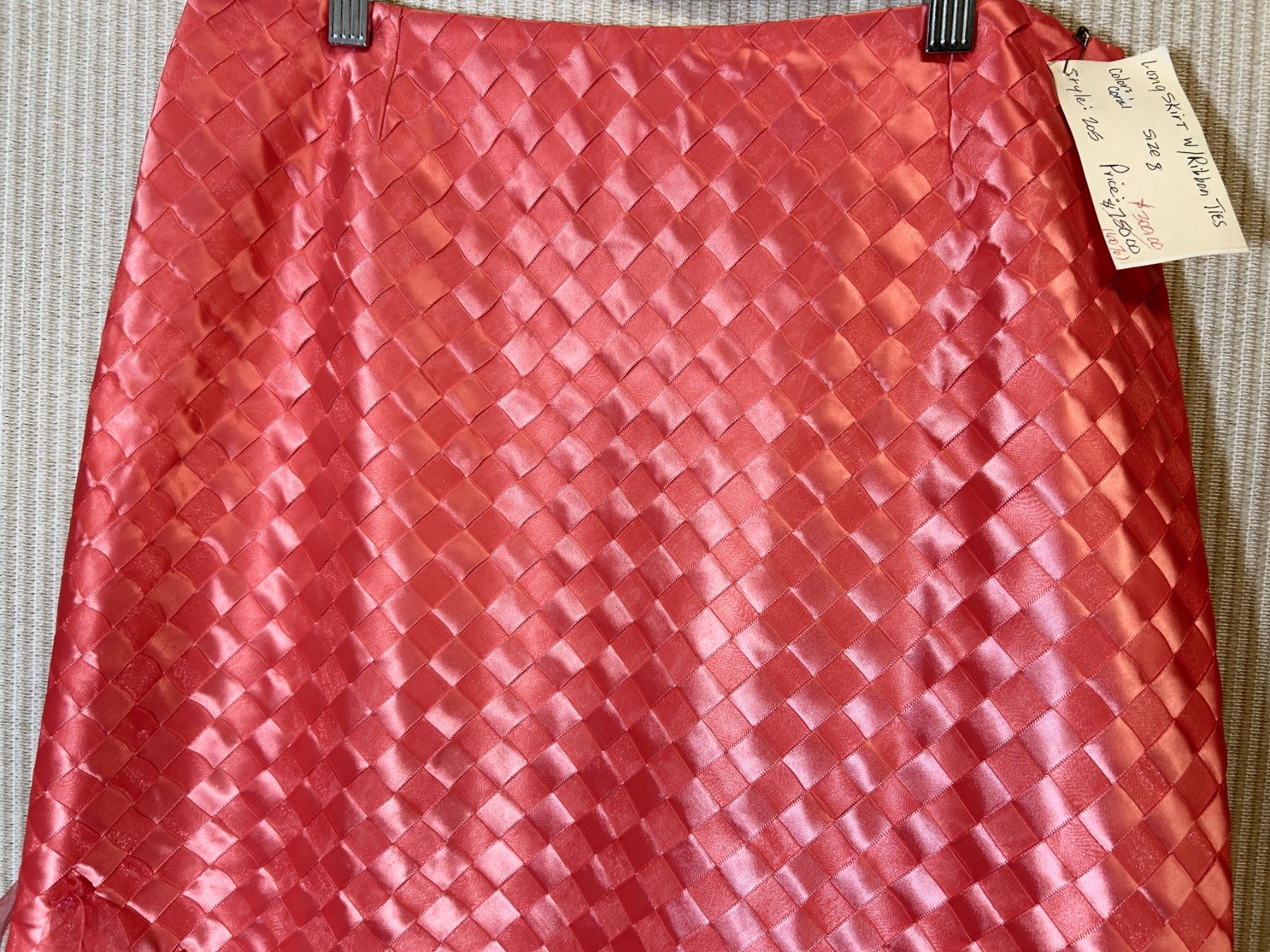 Christina Von Fieandt Long Woven Satin & Chiffon Coral Skirt w/ Ribbon Ties, Size 8, New with Tag (Original Retail $750). Lined. Side slit.