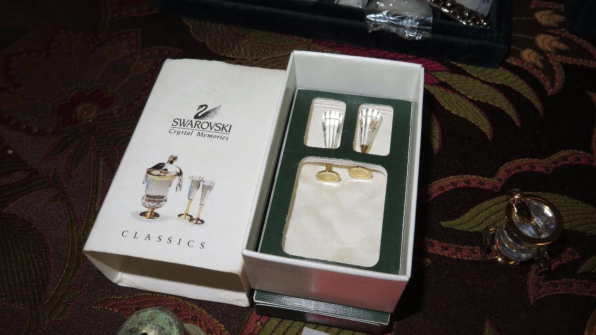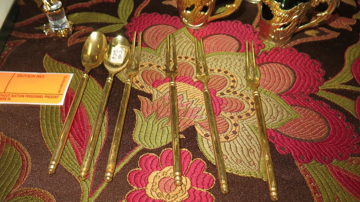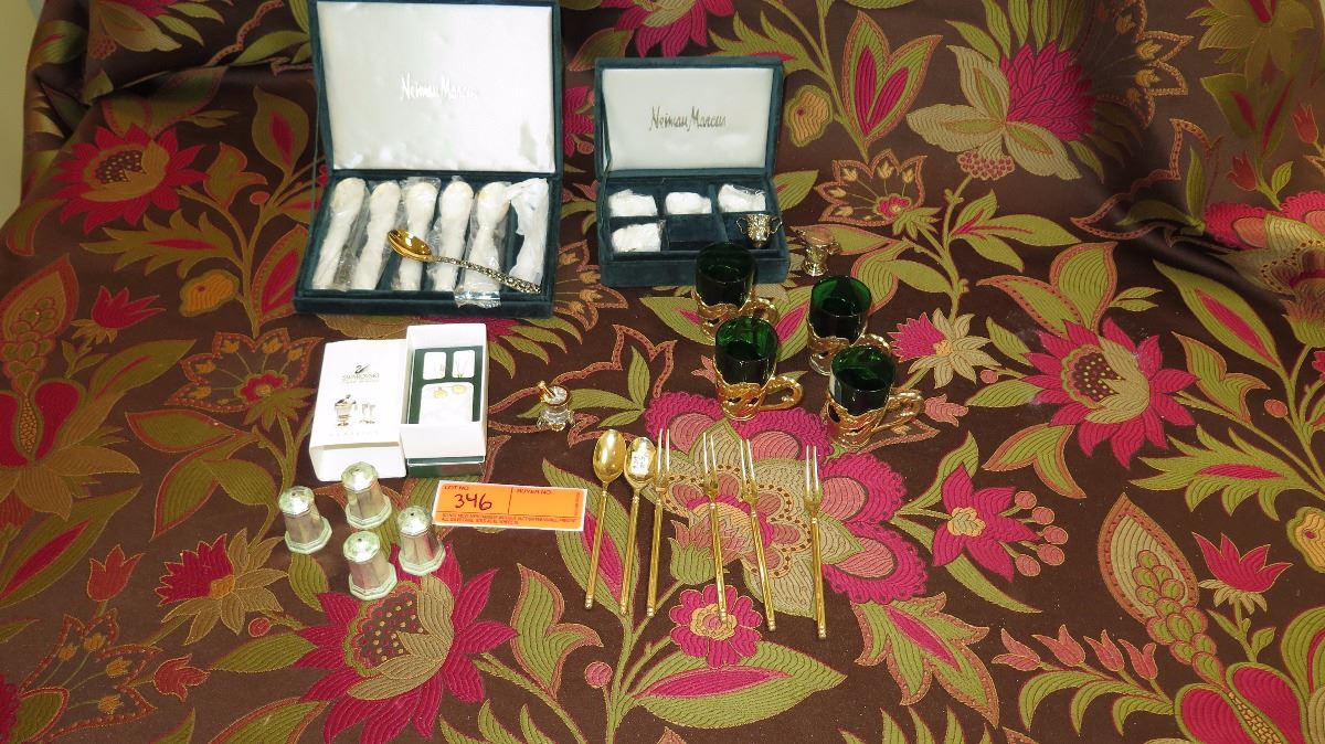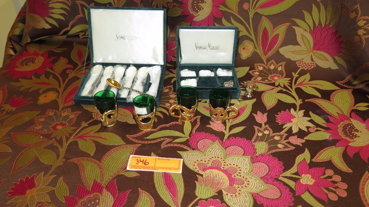Lot of Neiman Marcus Tea Spoons, Cocktail Utensils, Miniature Green Glasses w/Gilt Overlay, etc.