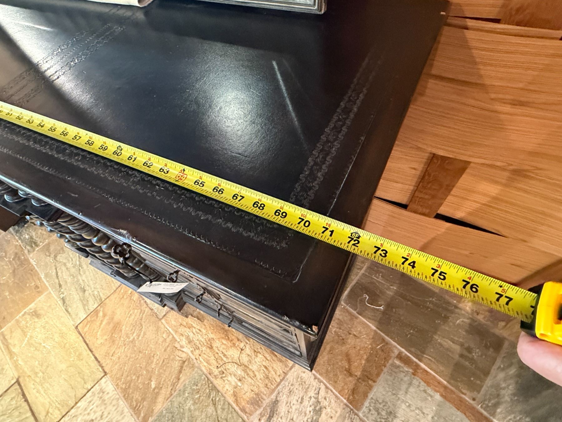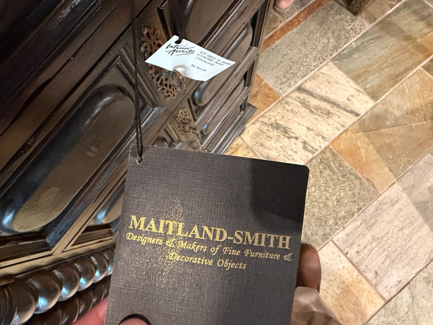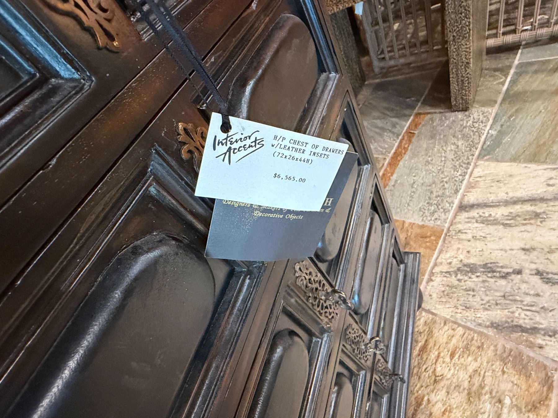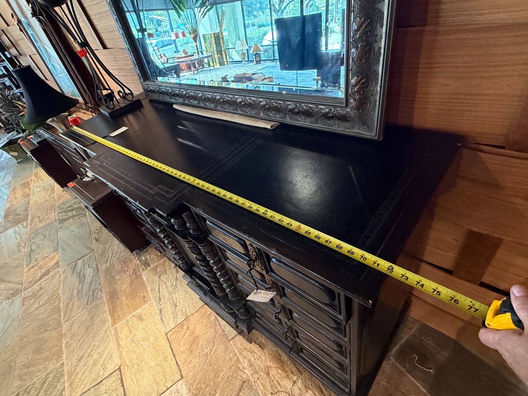 Maitland-Smith Carved Wooden Chest of Drawers w/ Leather Insets 72" x 23" x 44"H