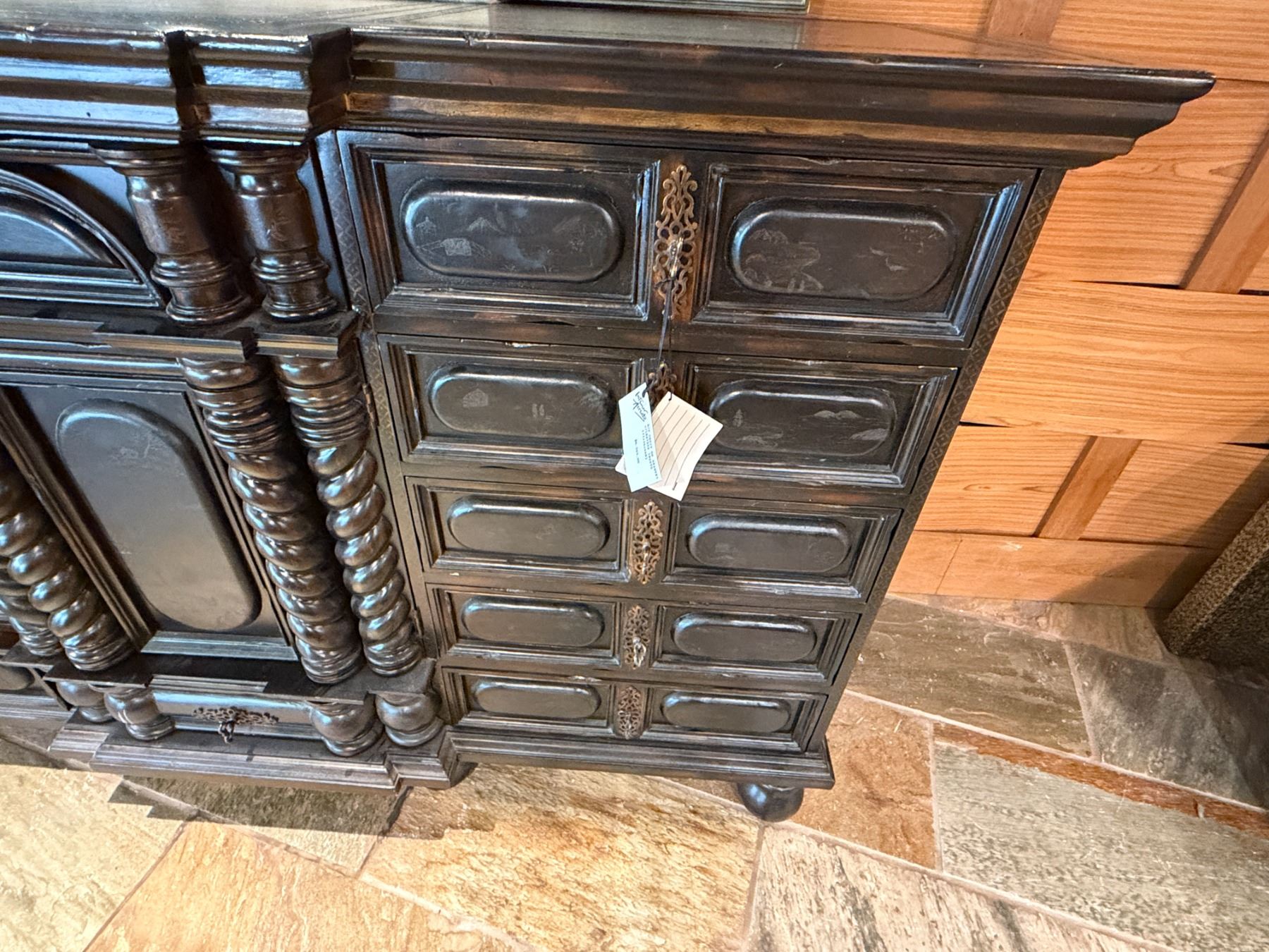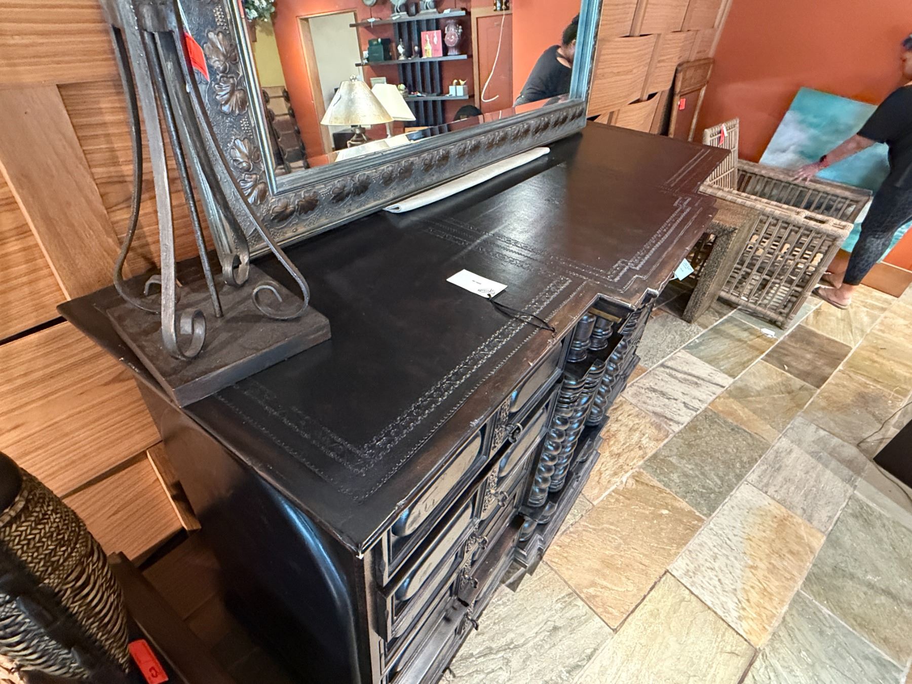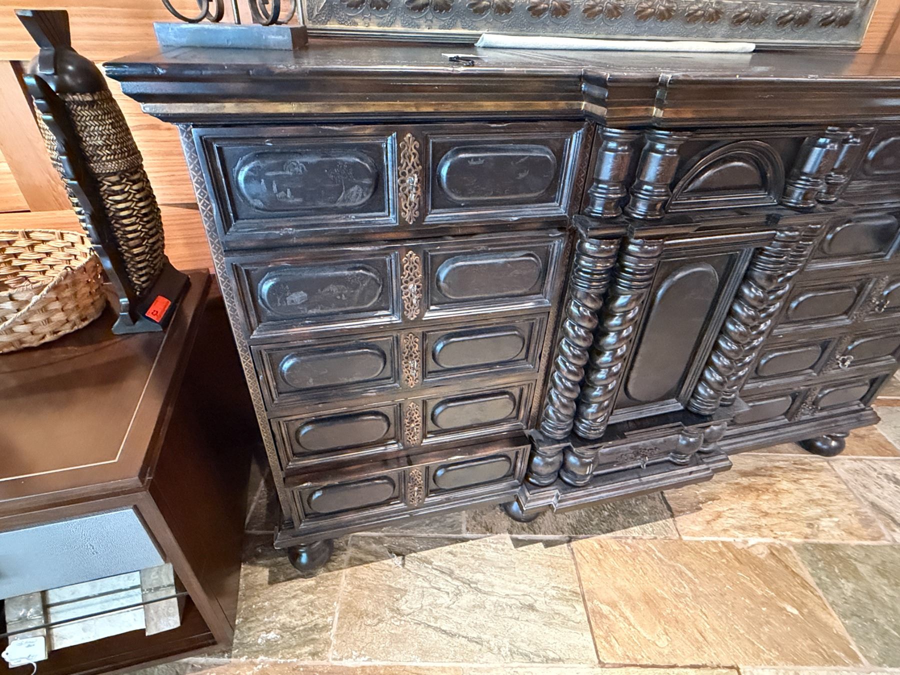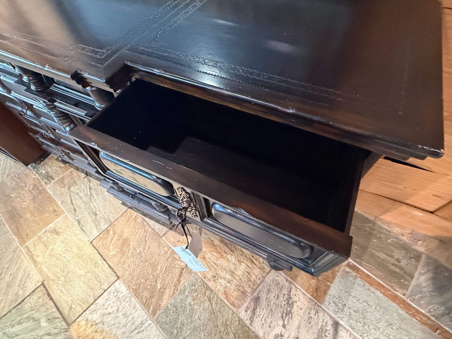 Maitland-Smith Carved Wooden Chest of Drawers w/ Leather Insets 72" x 23" x 44"H