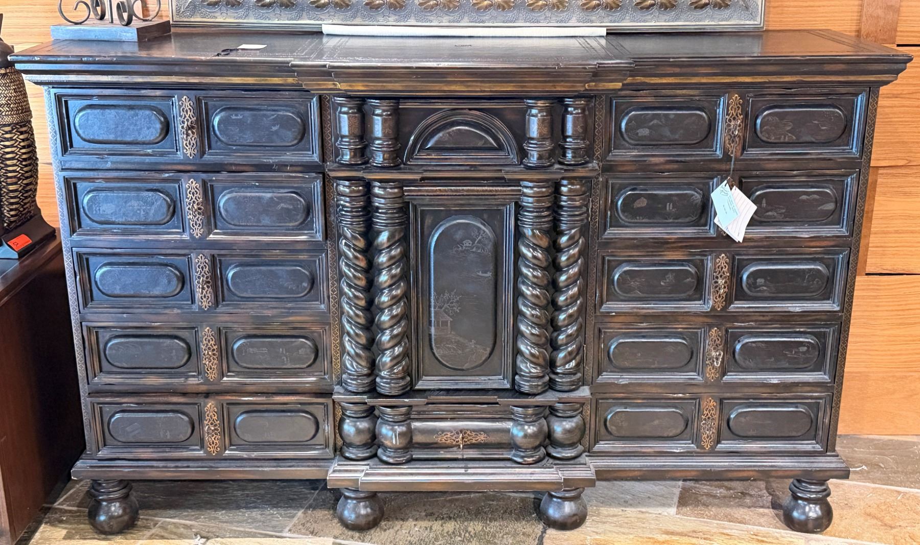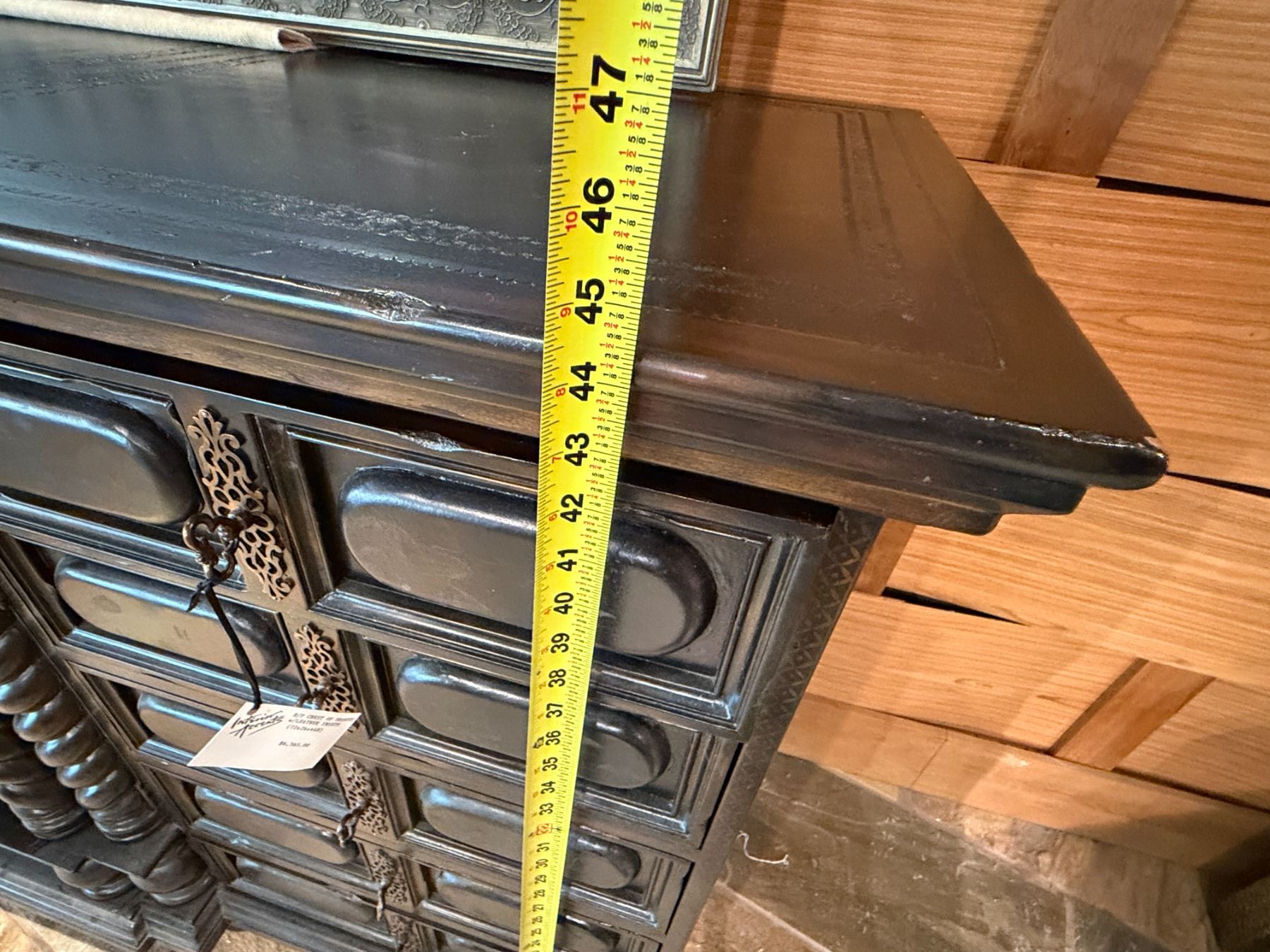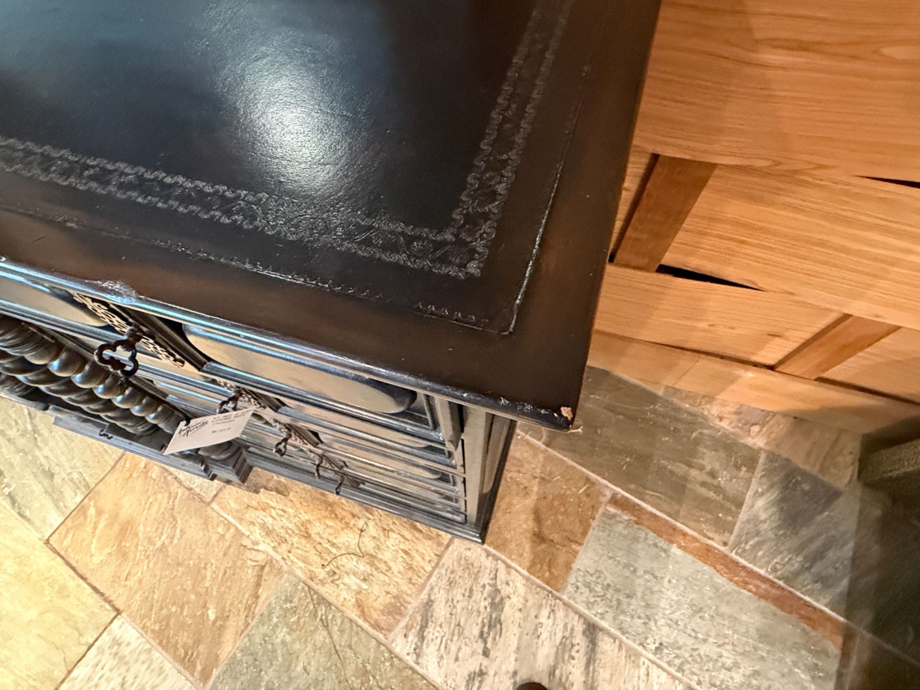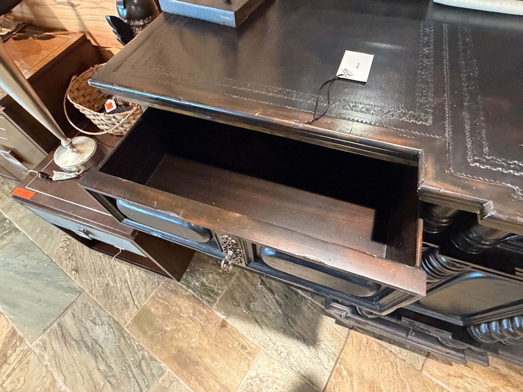 Maitland-Smith Carved Wooden Chest of Drawers w/ Leather Insets 72" x 23" x 44"H