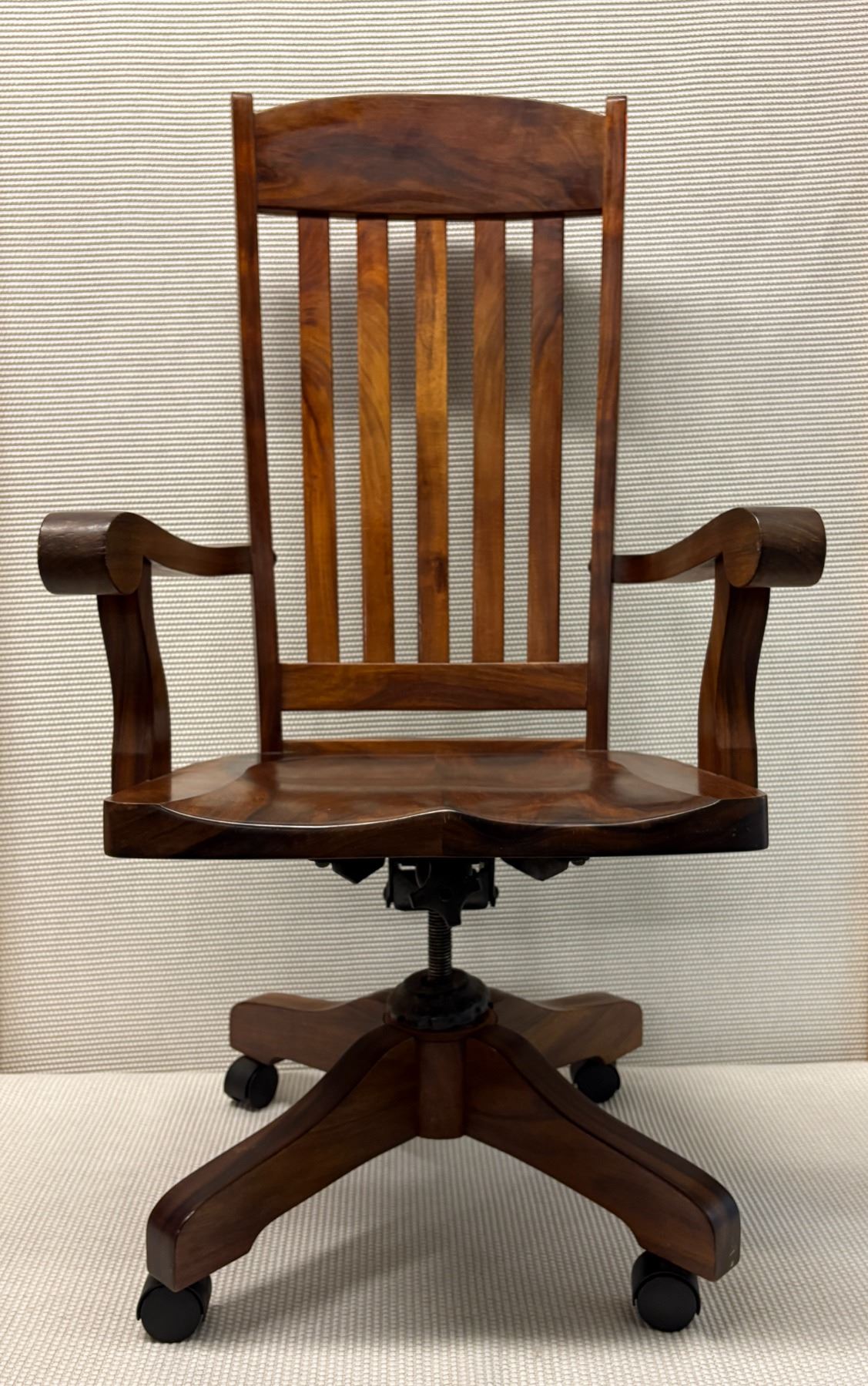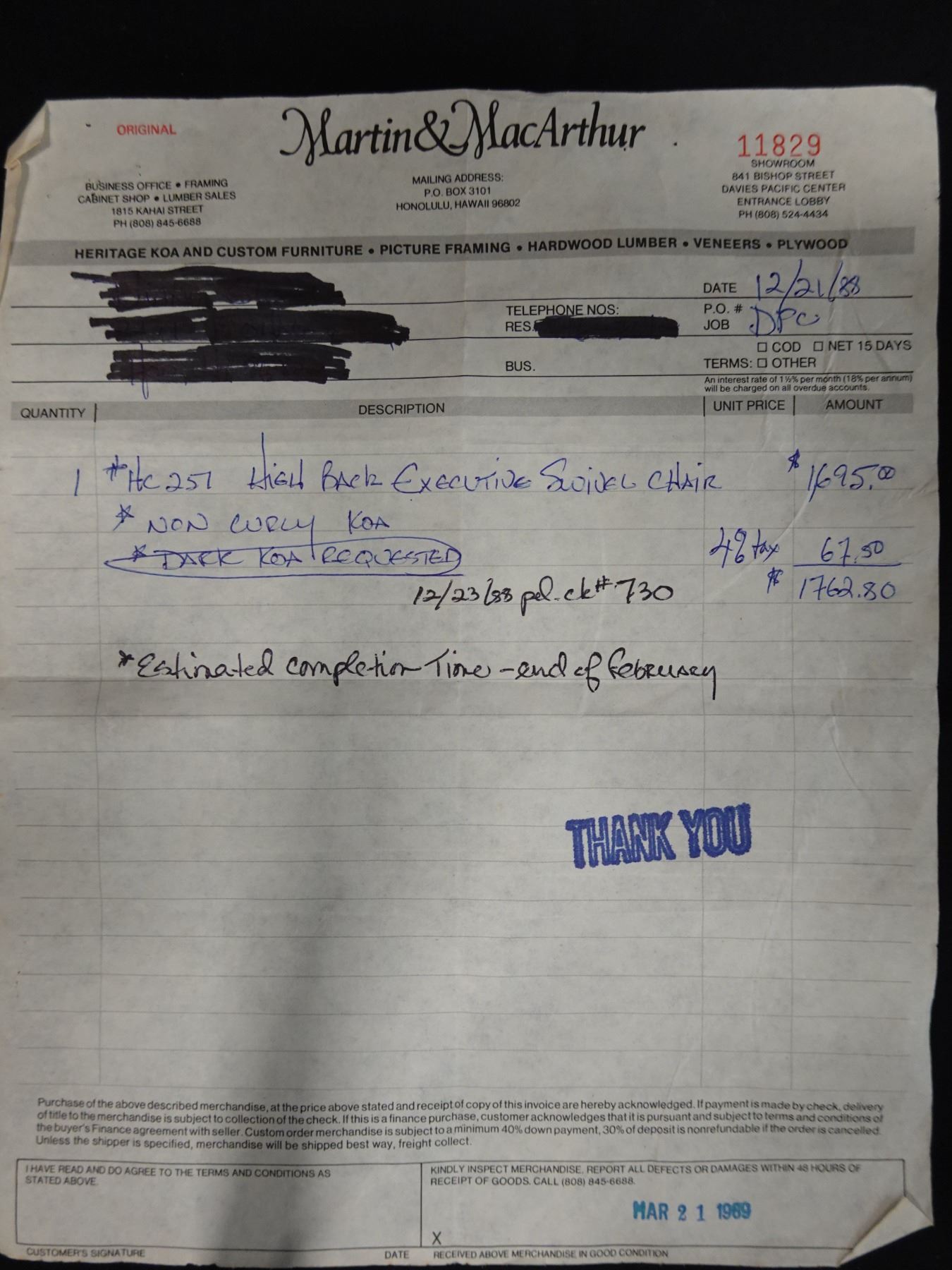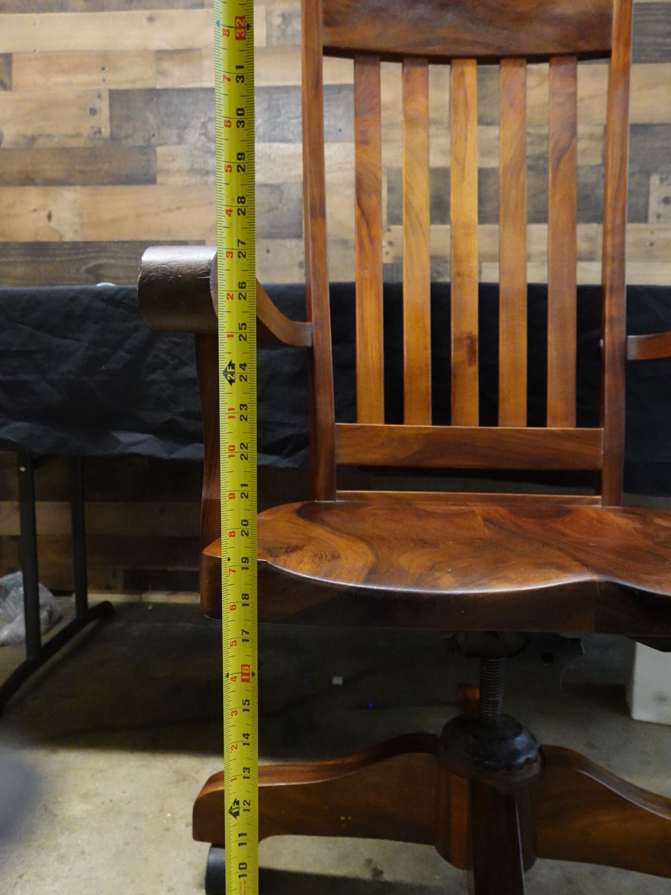 Martin & MacArthur Jim Jones Koa Wood High Back Executive Swing Chair 24" x 18" x 47"H. Was purchased from Martin & MacArthur for $1762 in 1988.