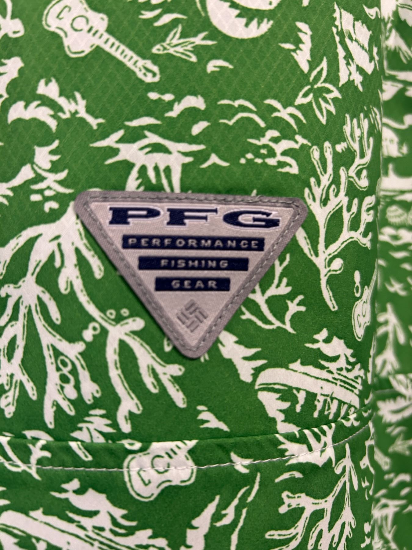 PFG (Performance Fishing Gear). Has vent on the back. Omni-Shade, UPF 40 protection